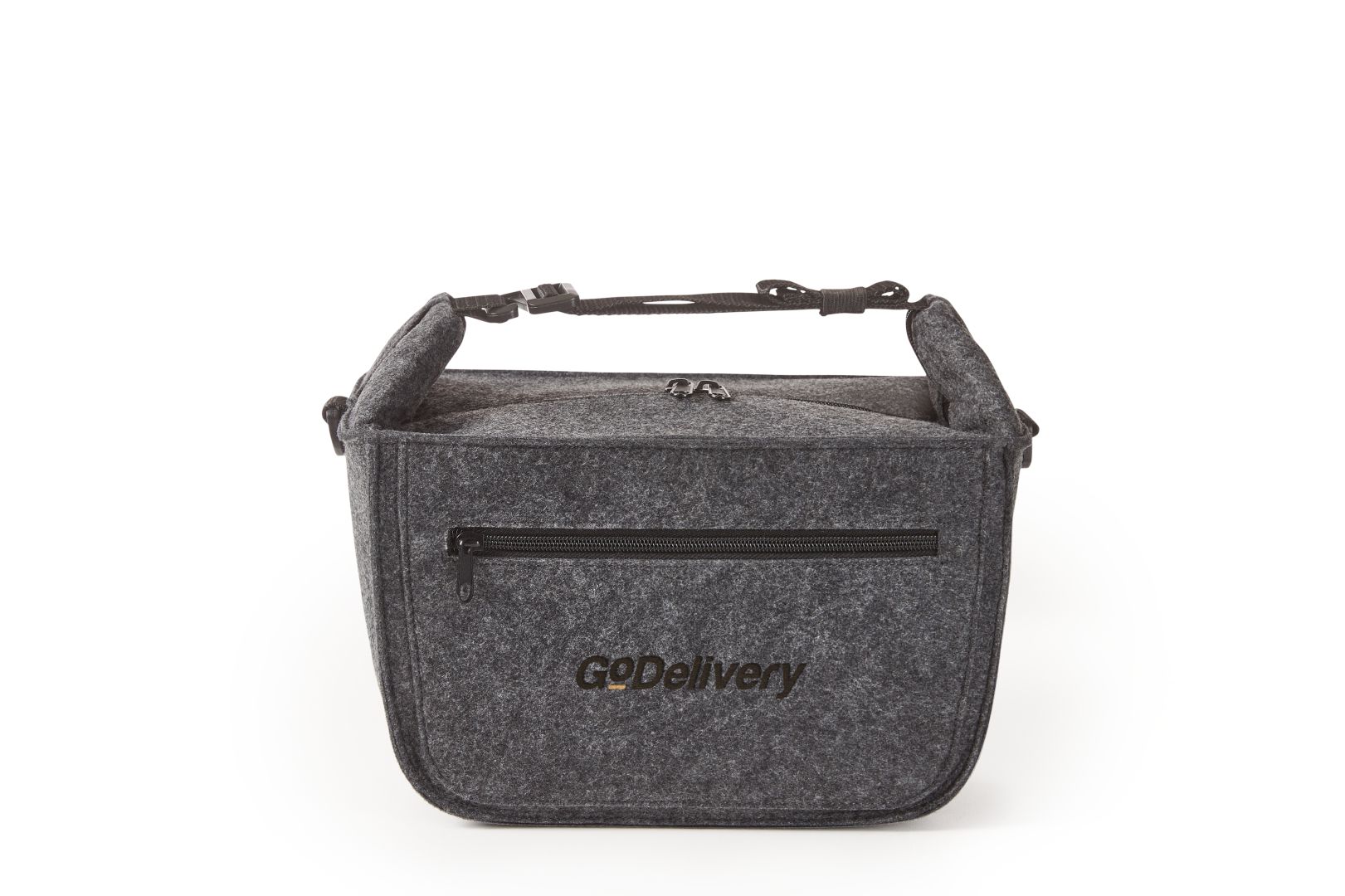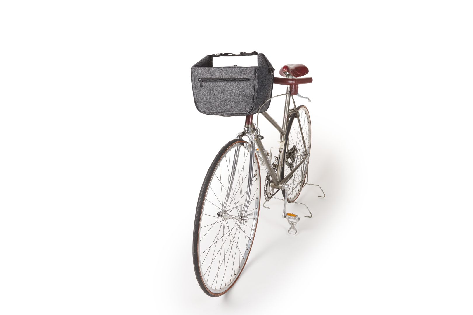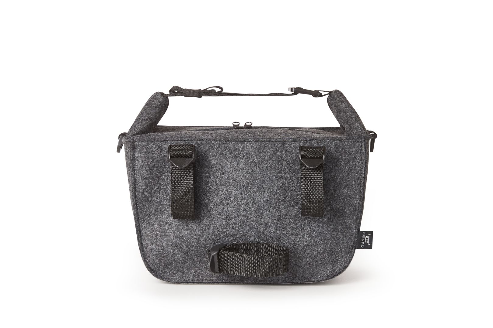 timeless felt cooling bag; main compartment with 2-way zipper; generously padded; washable inside; detachable, length-adjustable strap on one side with G-hook and rubber tab for strap attachment; D-rings on both sides for attachment of optional shoulder strap* or keys for example; bottom feet; loops on back for attaching to bike handlebars