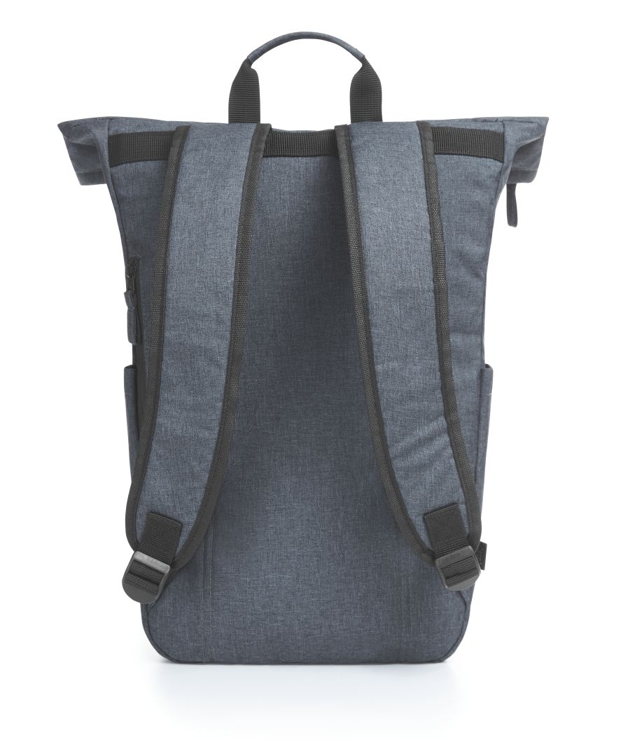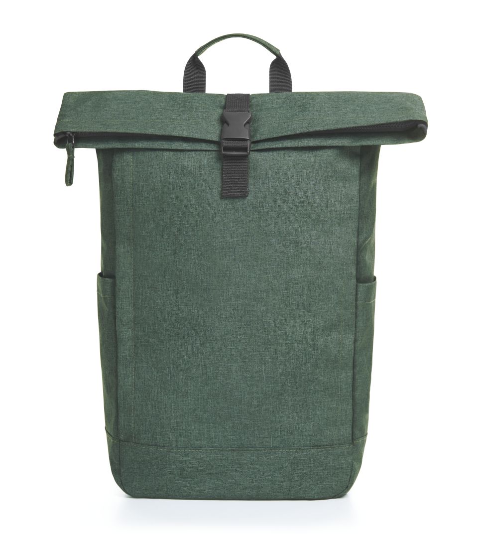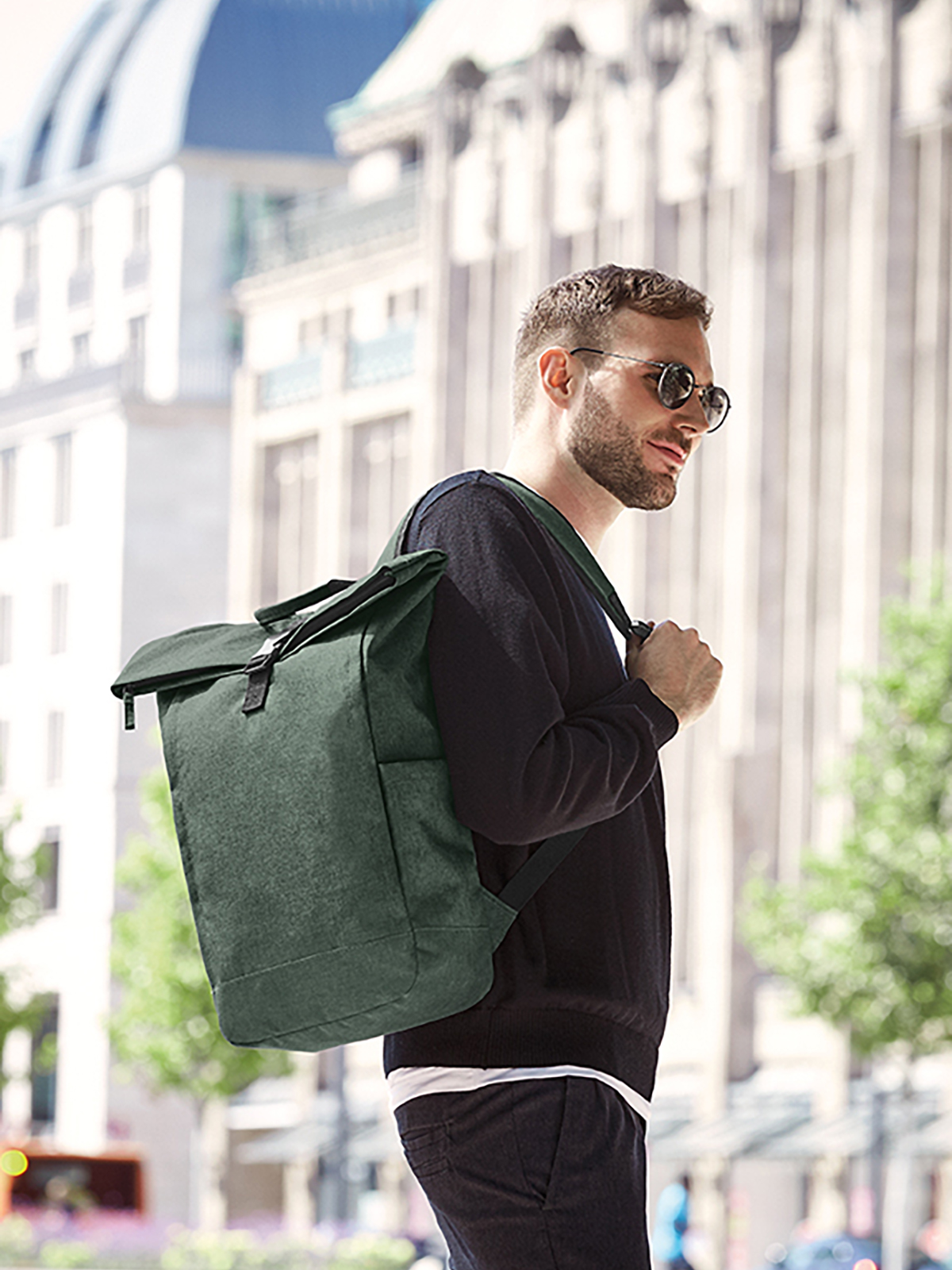 urban backpack with zipped main compartment and buckle fastening; rPET upper material; padded pocket and organizer elements inside; zipped outer pocket on side; two side pouches for bottles etc.; zipped pocket on back; padded strap system; handle