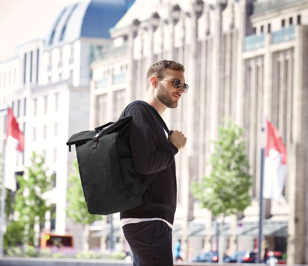 You don’t have to believe in reincarnation to find the history of this backpack fascinating. After all, it was a bottle, or rather many PET bottles, in its first life. Now, the recycled material lives once again as smart backpack with laptop compartment. The courier style is characteristic. Quite typical for this, the backpack is closed using just a zipper – and then offers its entire volume – but it also can be rolled up at the top and then secured with the buckle. The choice is yours.