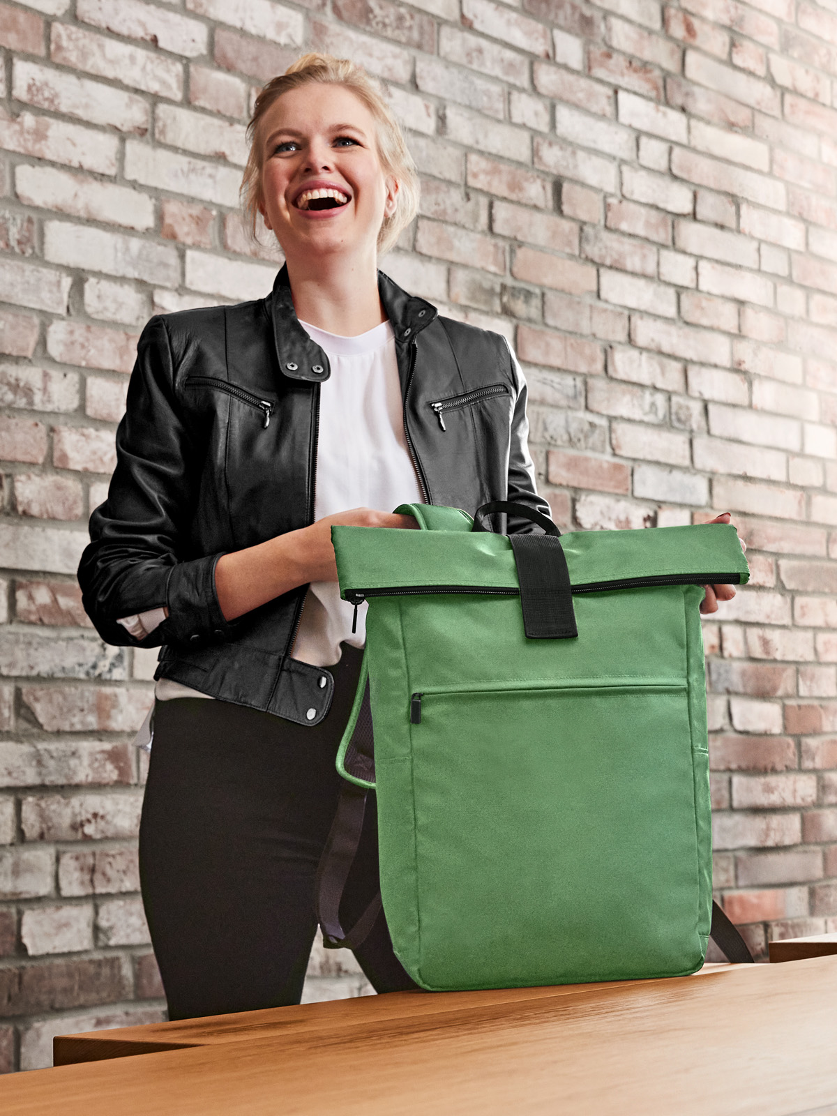 Urban flap backpack; large main compartment with zip and additional hook-and-loop flap; RPET upper material; padded notebook compartment and flat slip-in compartment inside; large front zip pocket; two side slip-in compartments e.g. for water bottles; padded carrying system; handle