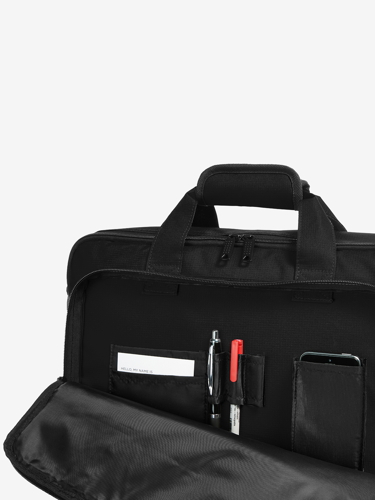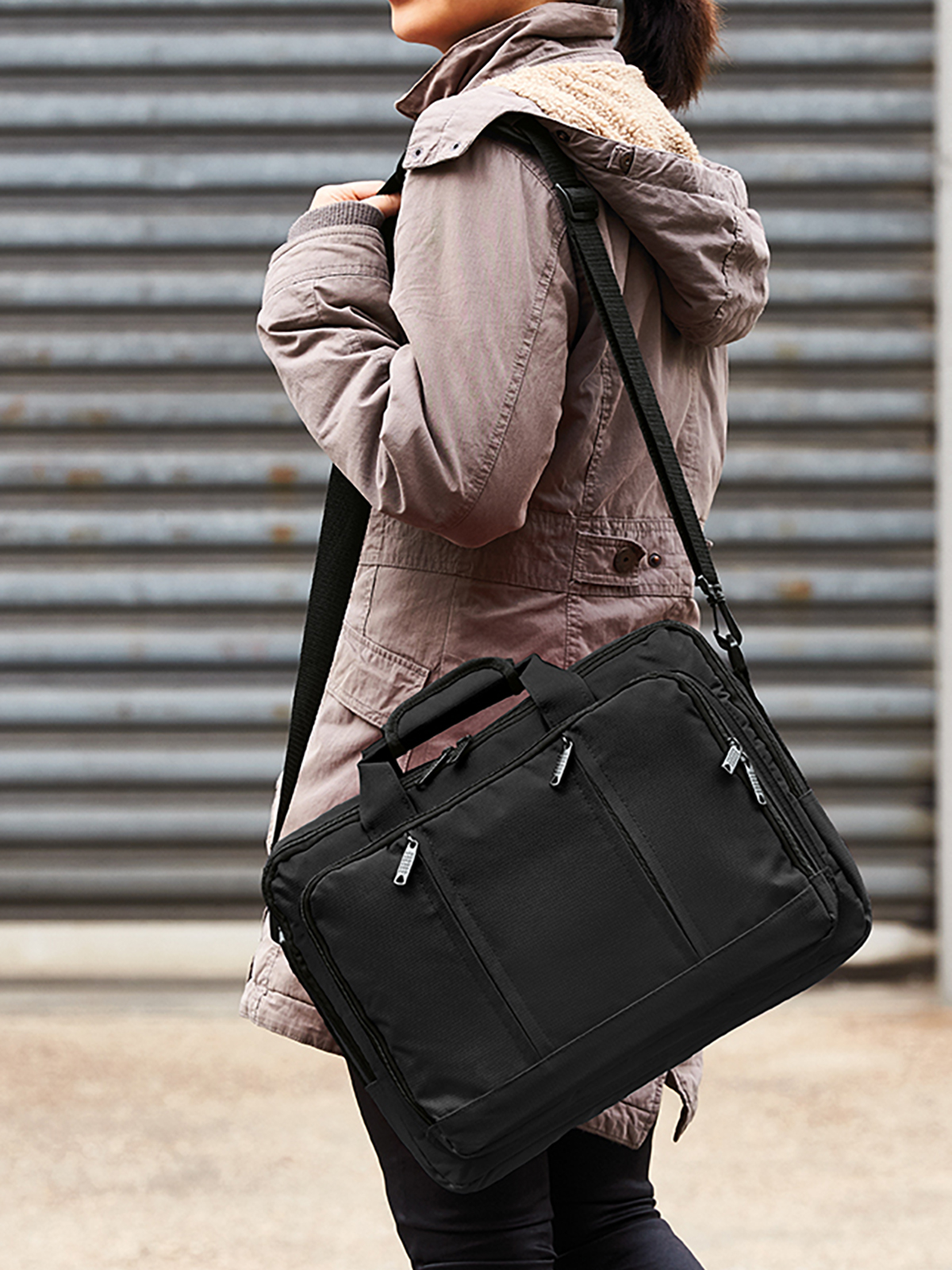 can be used as either backpack or shoulder bag; pocket for backpack straps; several zipper front pockets; organizer features; padded main compartment for notebook; adjustable, detachable shoulder strap with non-slip shoulder pad