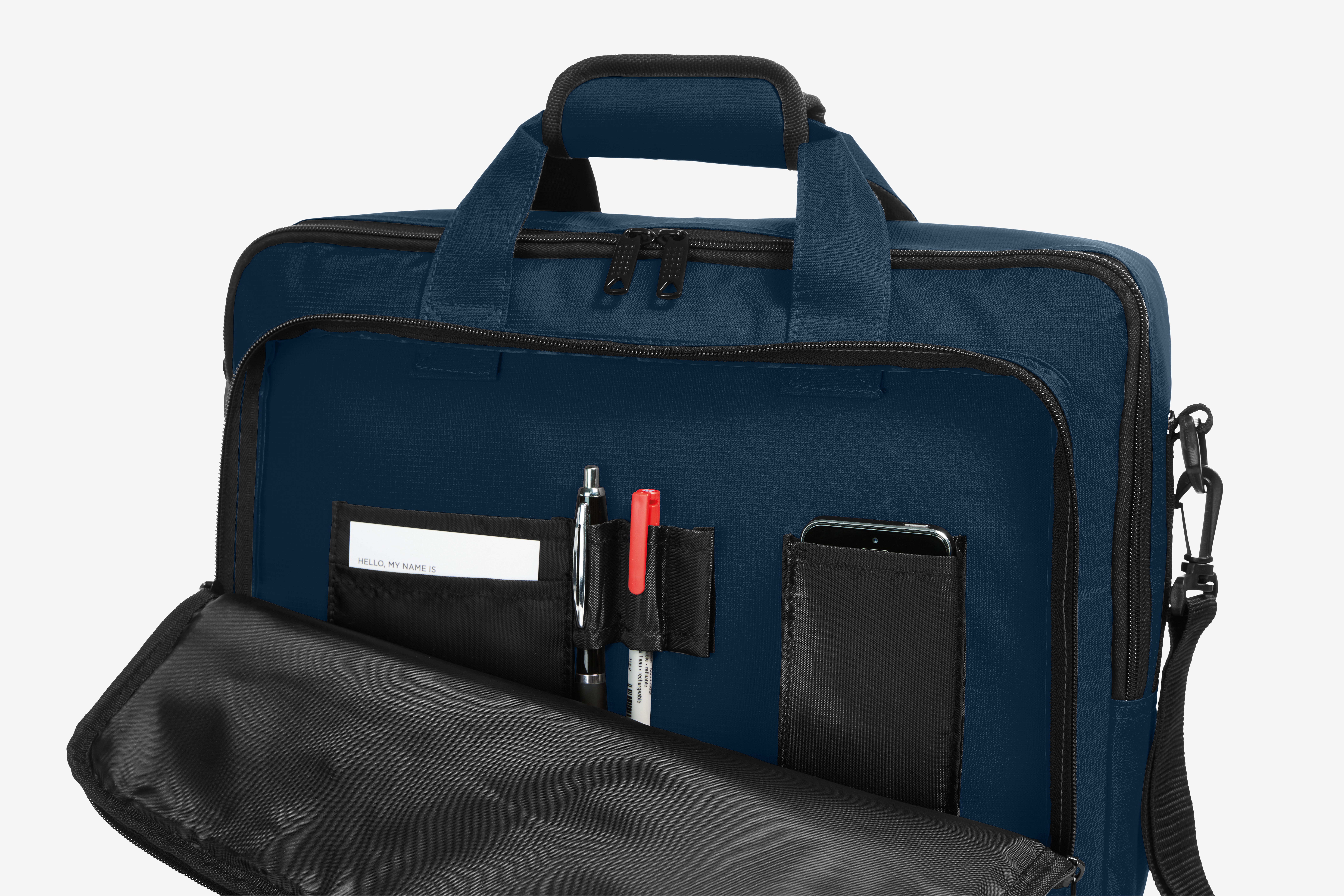 can be used as either backpack or shoulder bag; pocket for backpack straps; several zipper front pockets; organizer features; padded main compartment for notebook; adjustable, detachable shoulder strap with non-slip shoulder pad