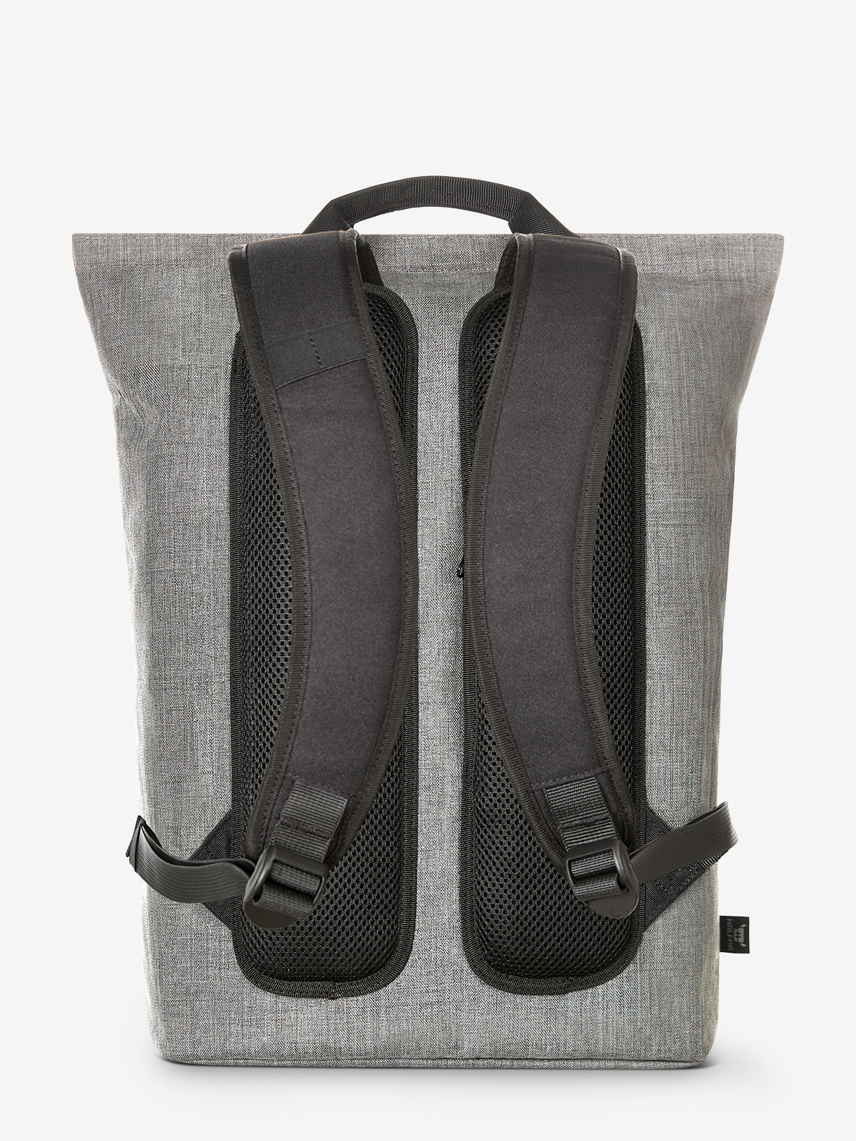 streamlined, modern backpack; main compartment with zip and padded notebook compartment; rPET outer material; high-quality metal accessories; padded base; elaborately padded back with hidden zip compartment; length-adjustable padded shoulder straps with rubber loops to attach items such as sunglasses; handles