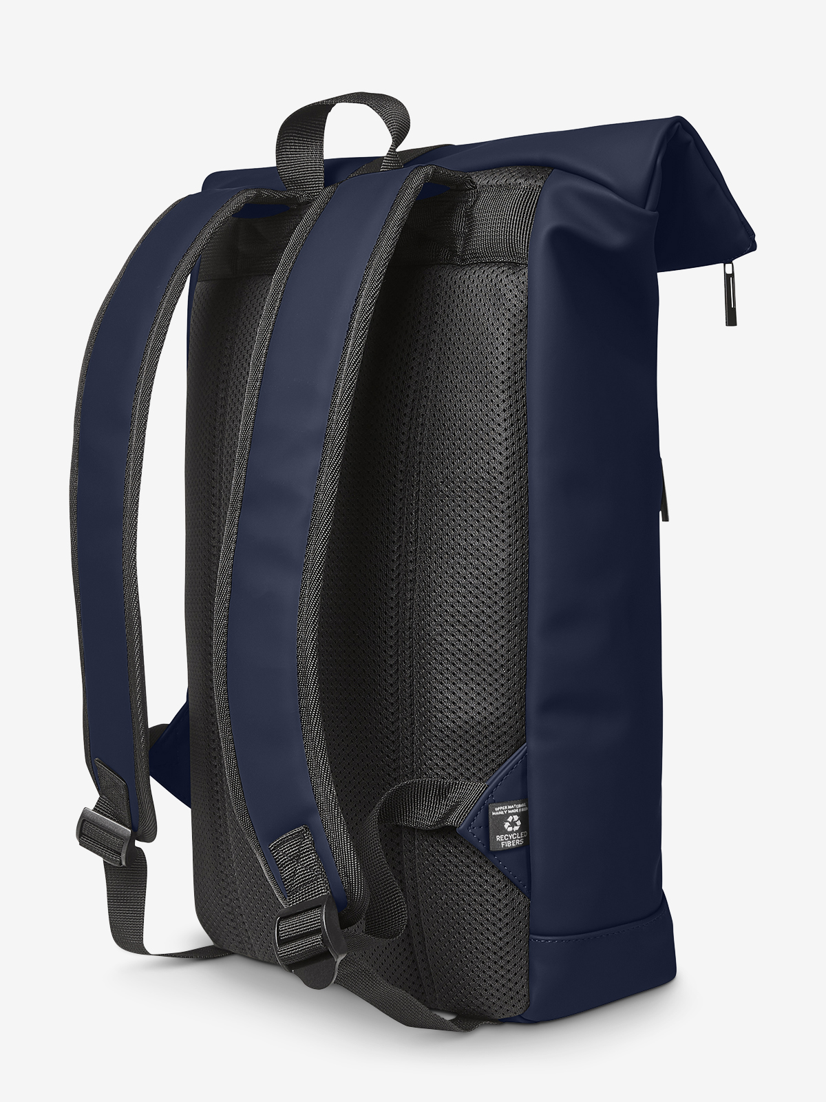 elegant, urban backpack; main compartment with reinforced base; water-repellent zippers, padded notebook compartment with rubber tab; flat zippered compartment; zipped front pocket; padded carrying system; handle