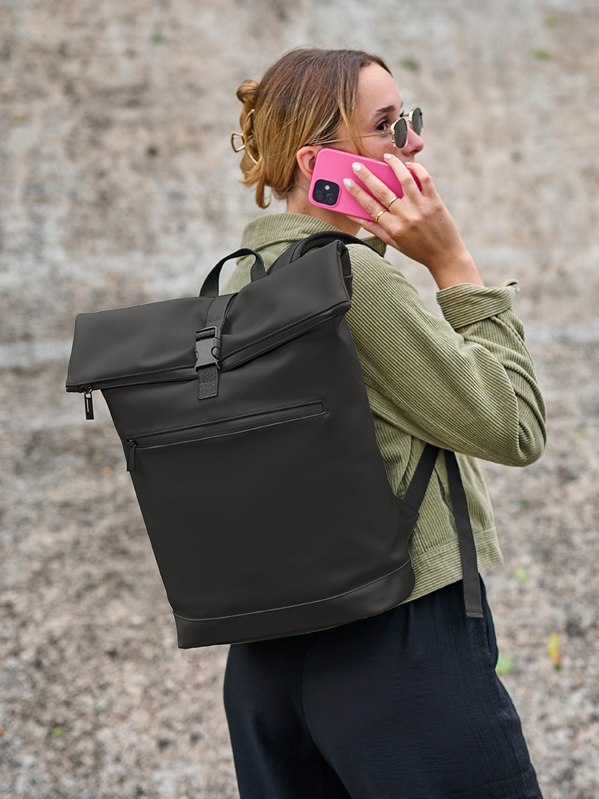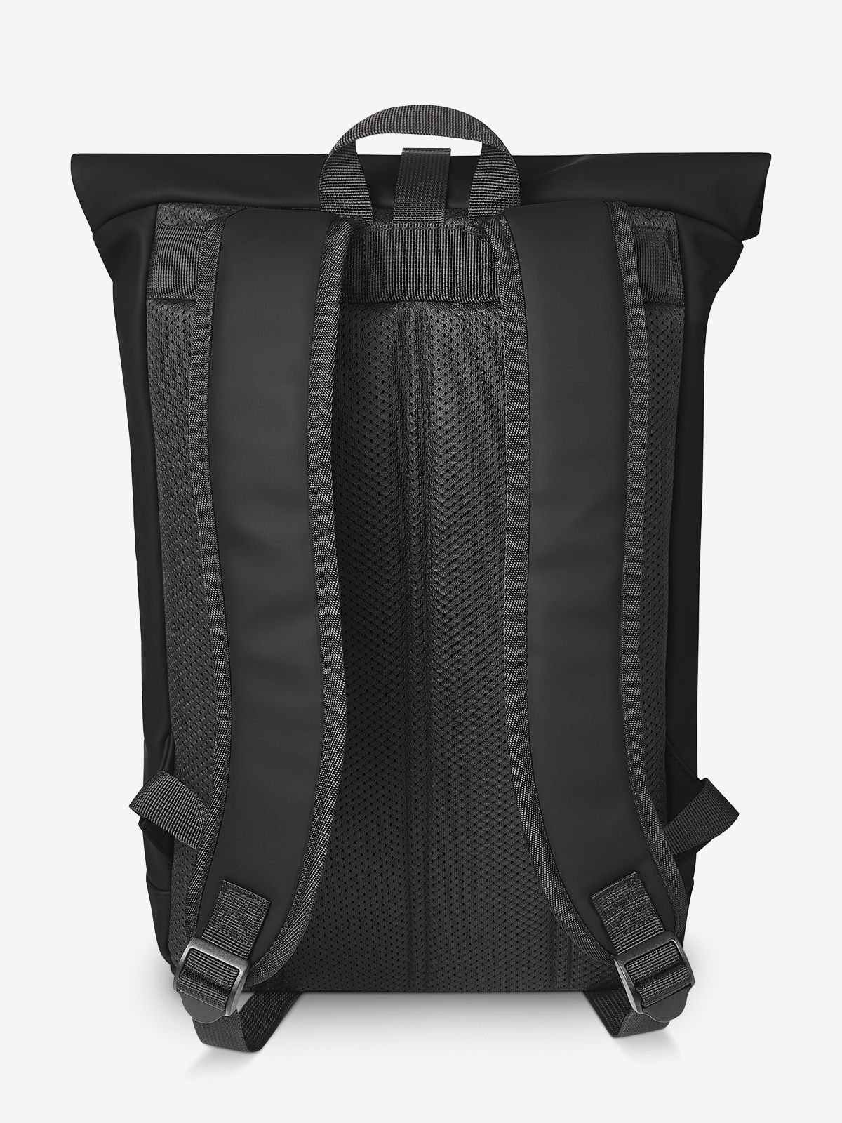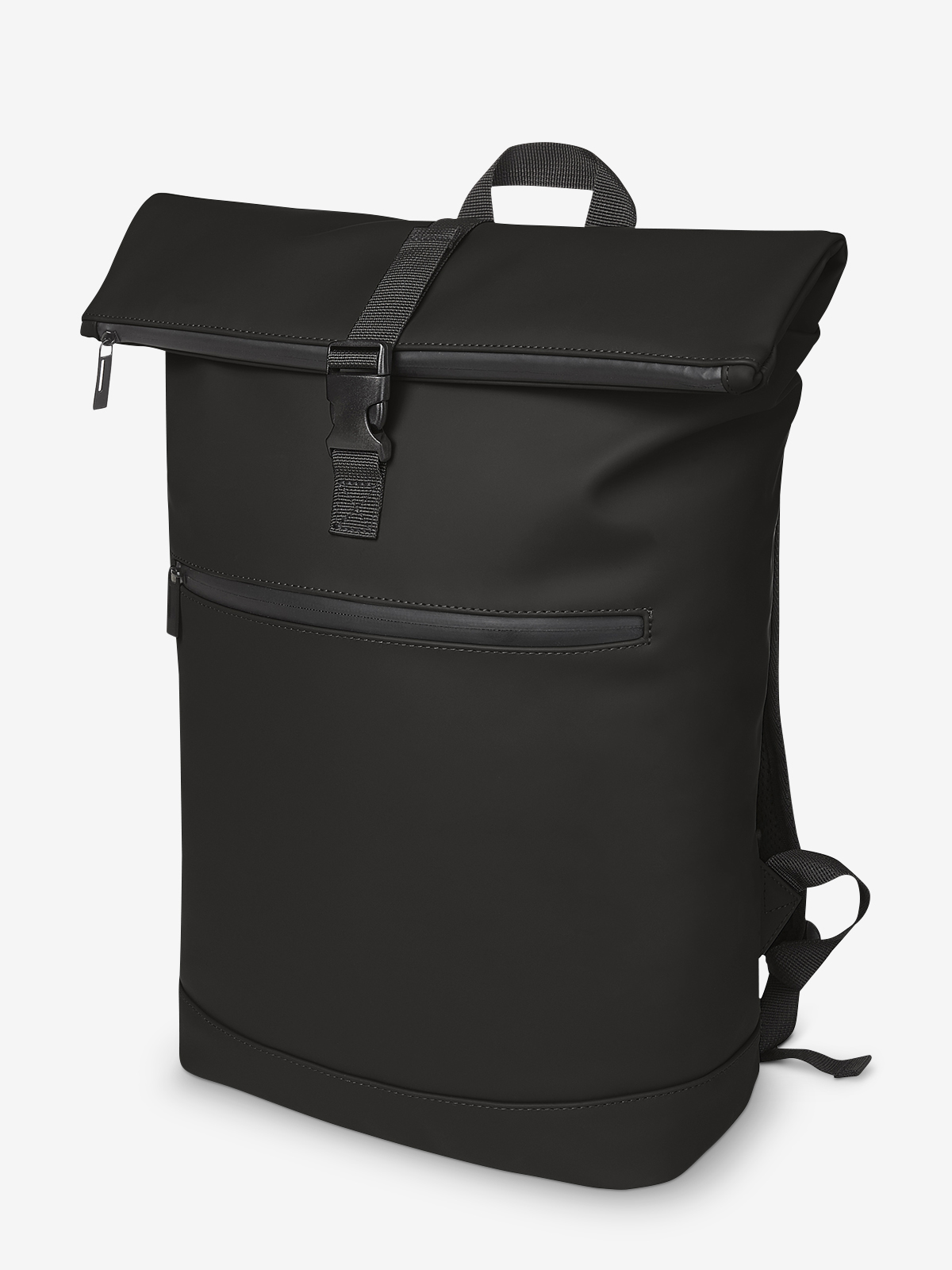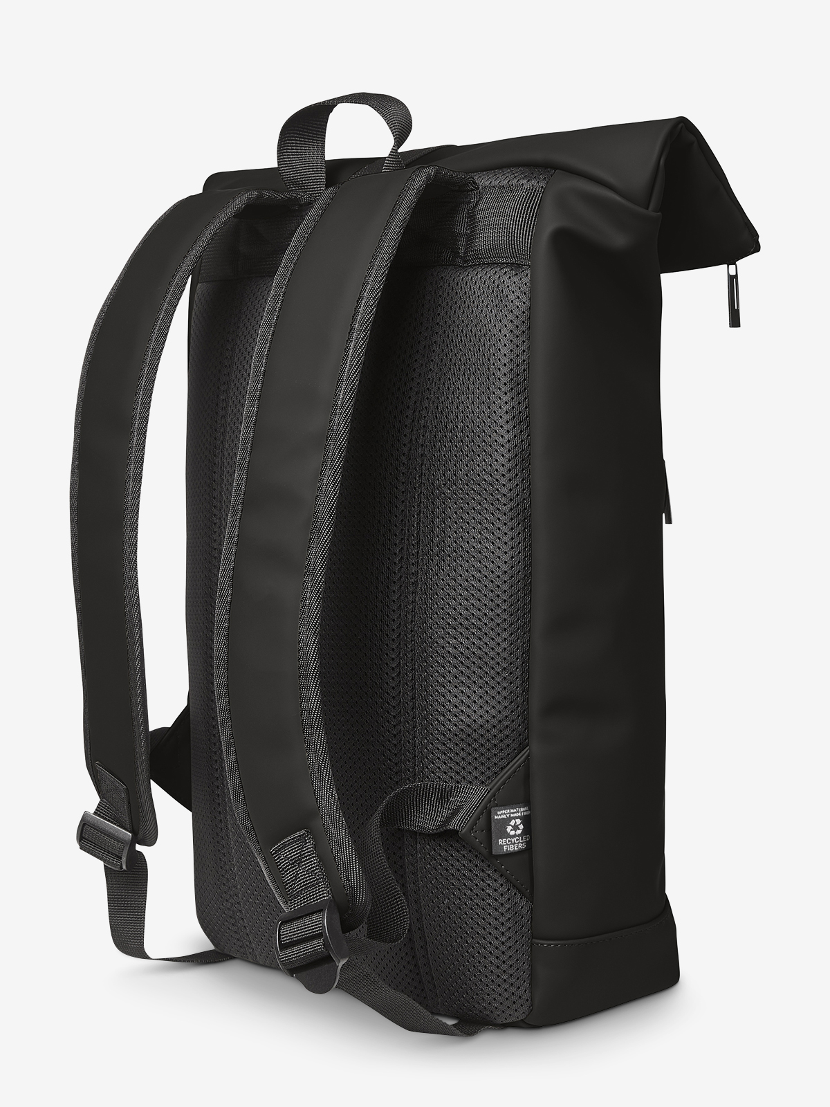 elegant, urban backpack; main compartment with reinforced base; water-repellent zippers, padded notebook compartment with rubber tab; flat zippered compartment; zipped front pocket; padded carrying system; handle