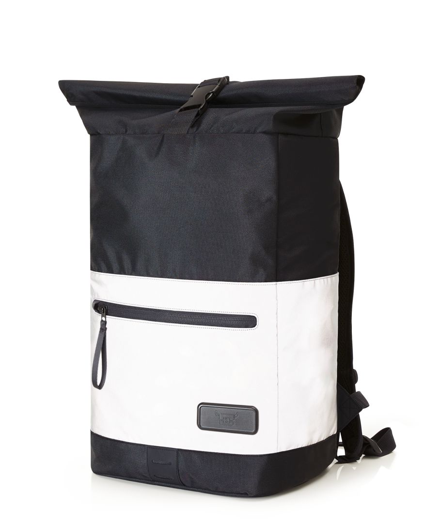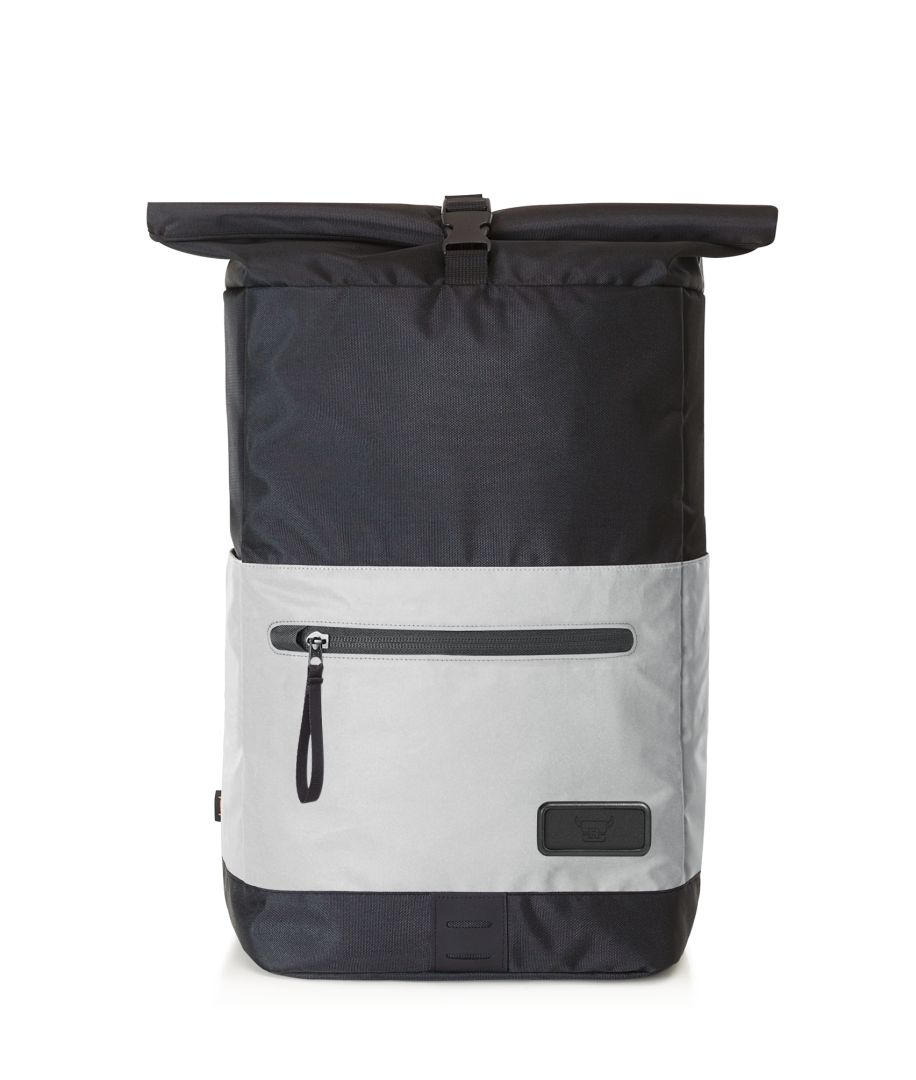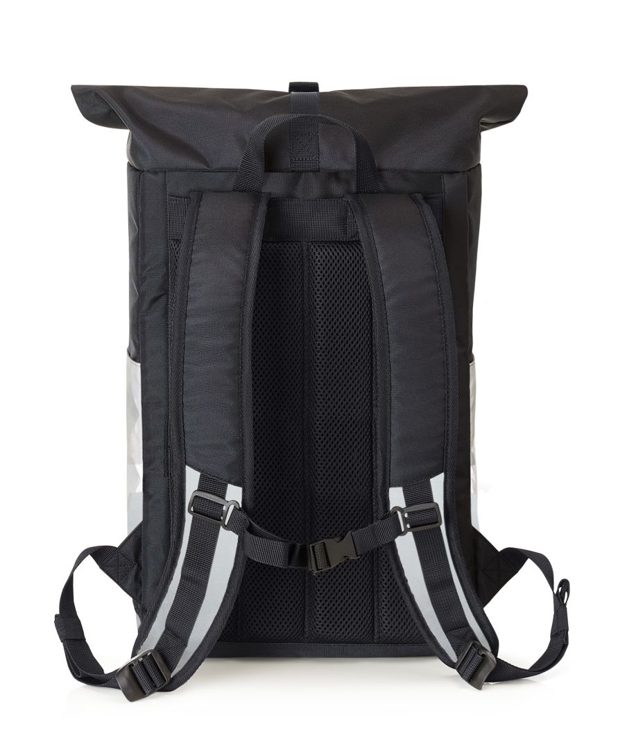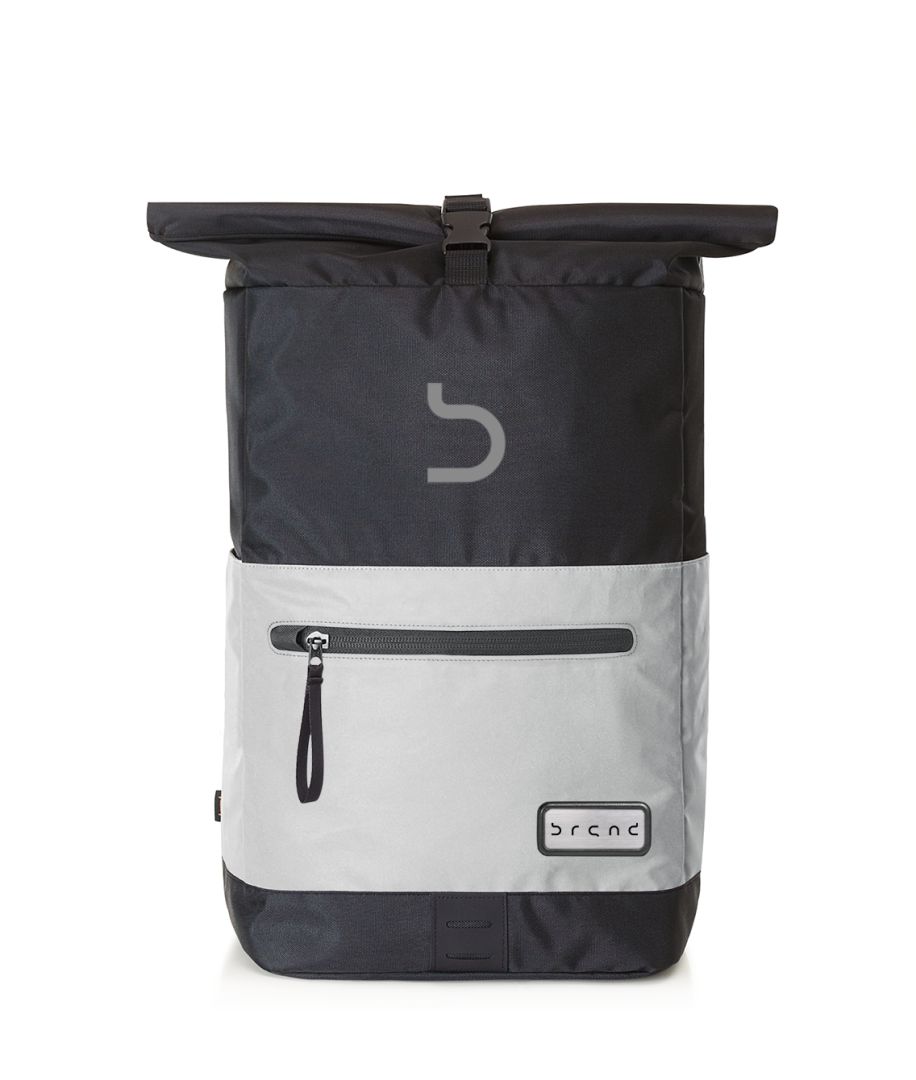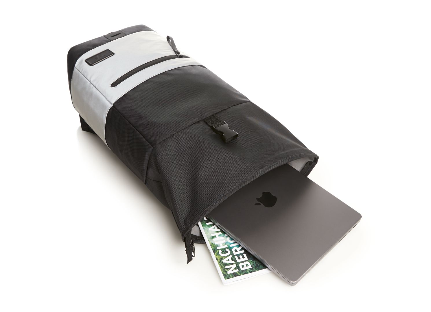 stylish, reflective roll-top backpack with zipped main compartment and buckle; HFL® straps for your logo; padded slip-in pocket and zipped mesh pocket inside; two side slip-in pockets; zipped front pocket; LED bicycle light attachment option; padded carrying system with height-adjustable chest strap; handle