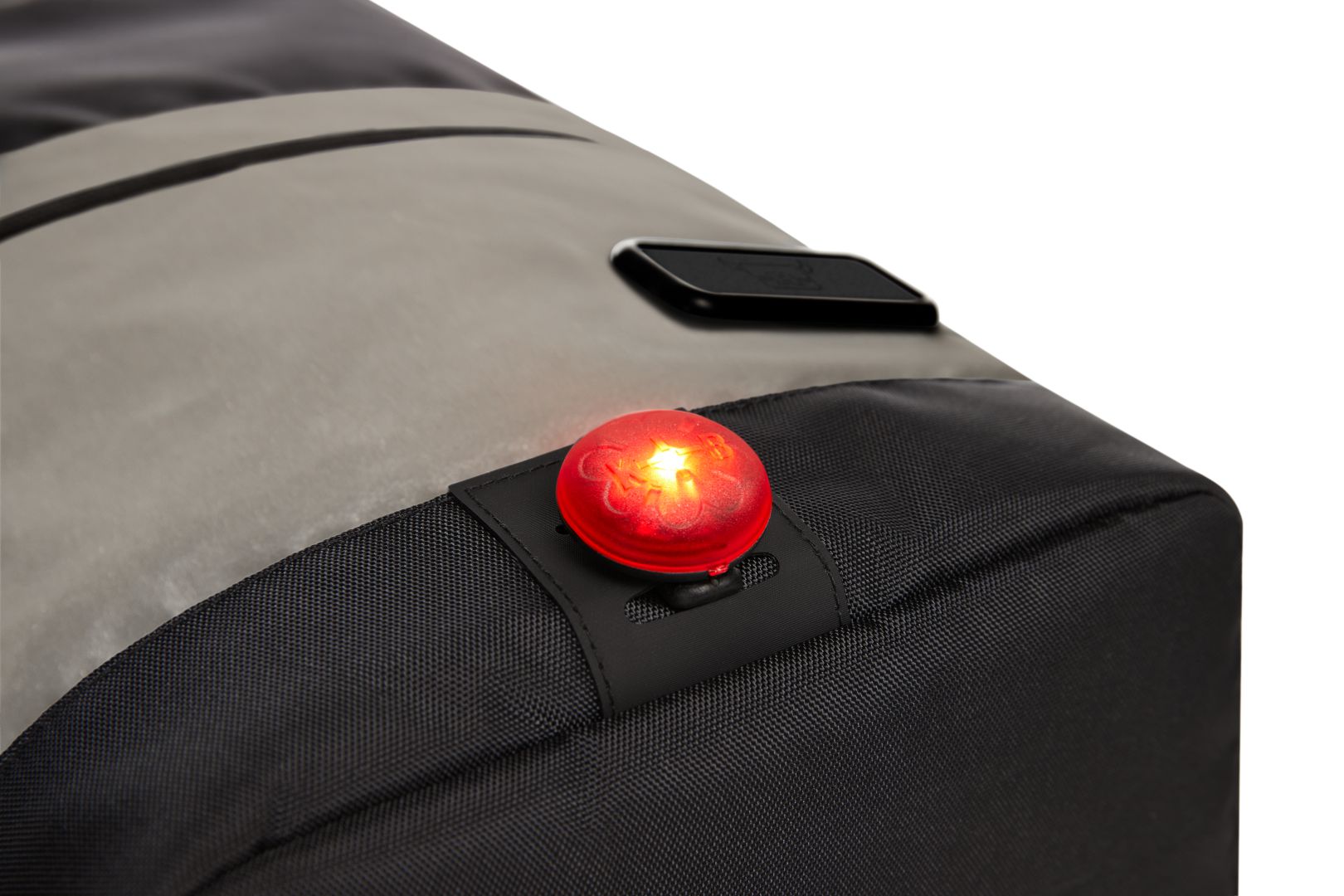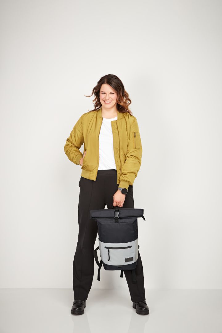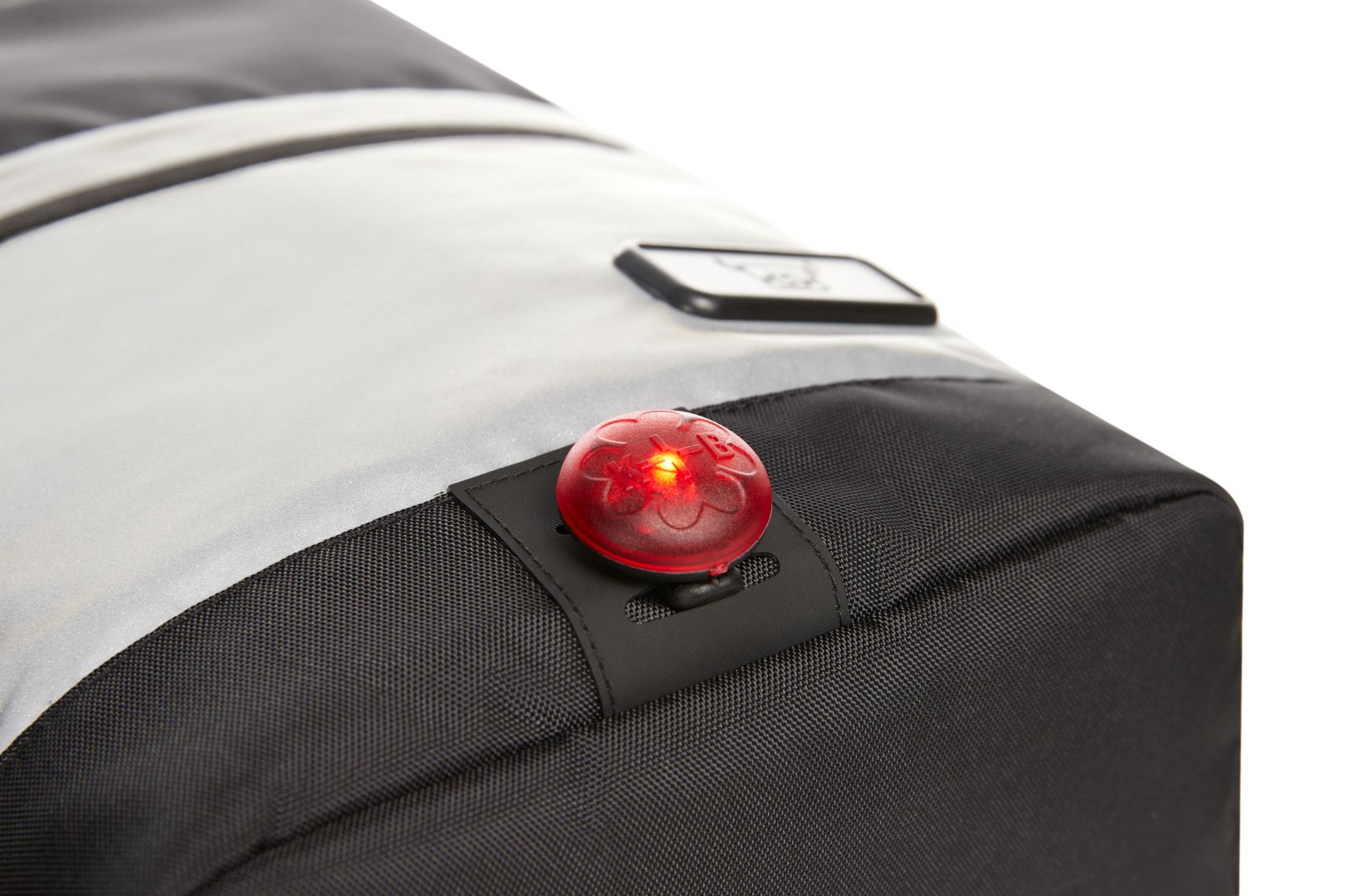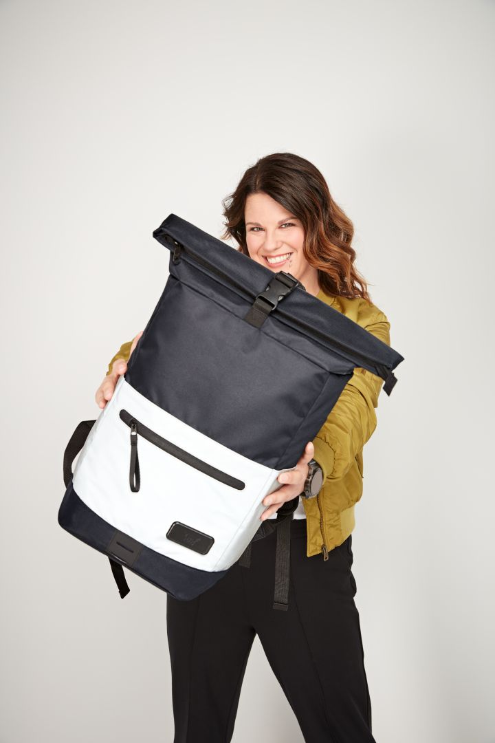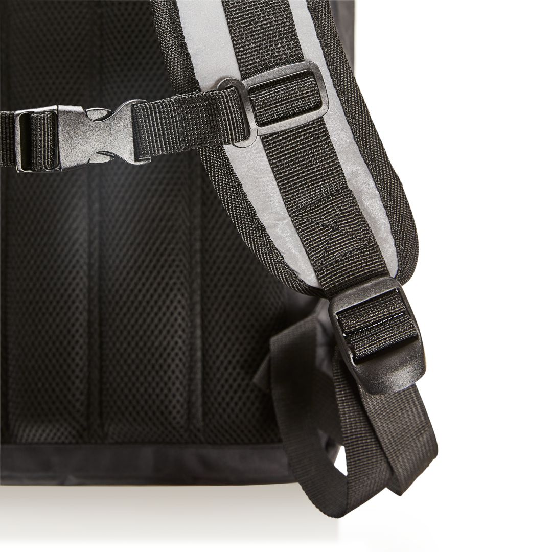 stylish, reflective roll-top backpack with zipped main compartment and buckle; HFL® straps for your logo; padded slip-in pocket and zipped mesh pocket inside; two side slip-in pockets; zipped front pocket; LED bicycle light attachment option; padded carrying system with height-adjustable chest strap; handle