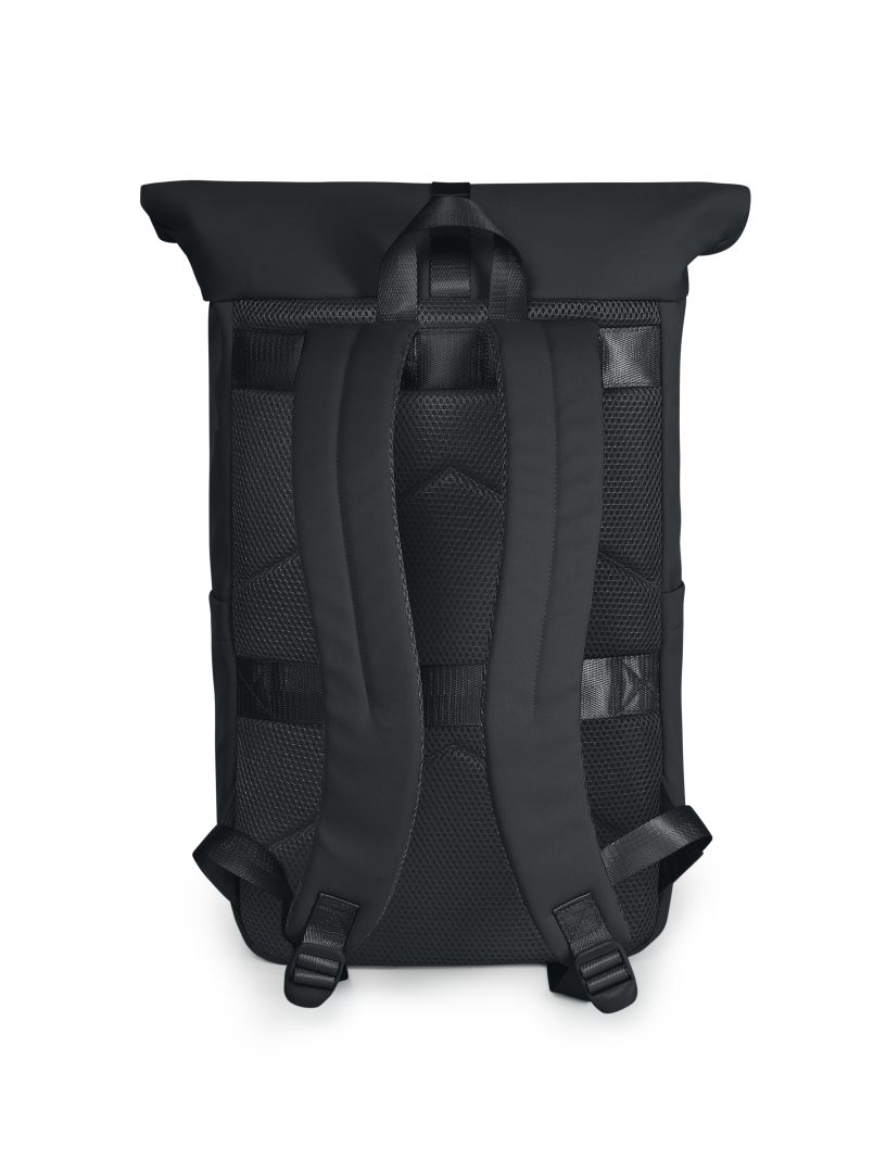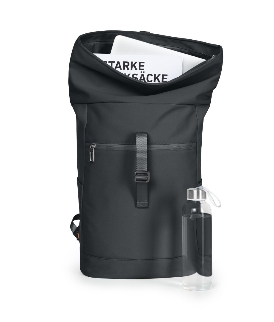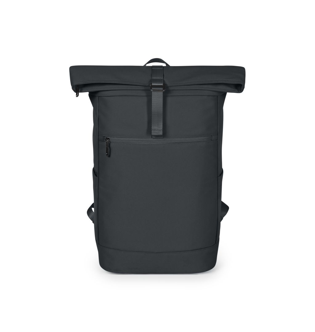 fashionable roll-top backpack; zippered main compartment with adjustable fastening system; loop strap on the lid; high-quality metal accessories; padded notebook compartment; zippered front pocket; two side pockets; padded base; padded carrying system; fastening loop on the back for trolley handle; handle