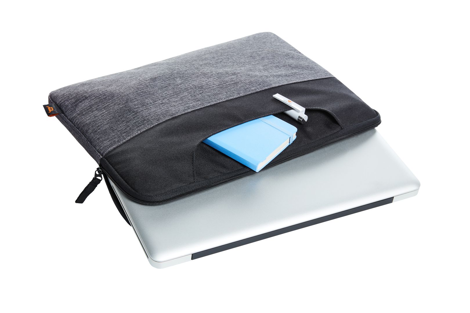 attractive, two-coloured laptop case; padded main compartment with 2-way zipper on the side for easy filling; front zipper pocket; flat pocket on the front and back; retractable carrying handles