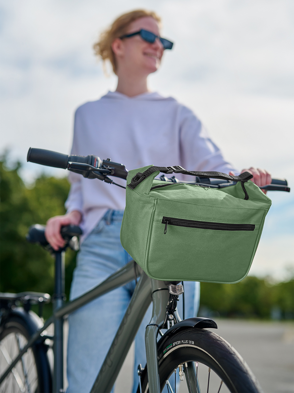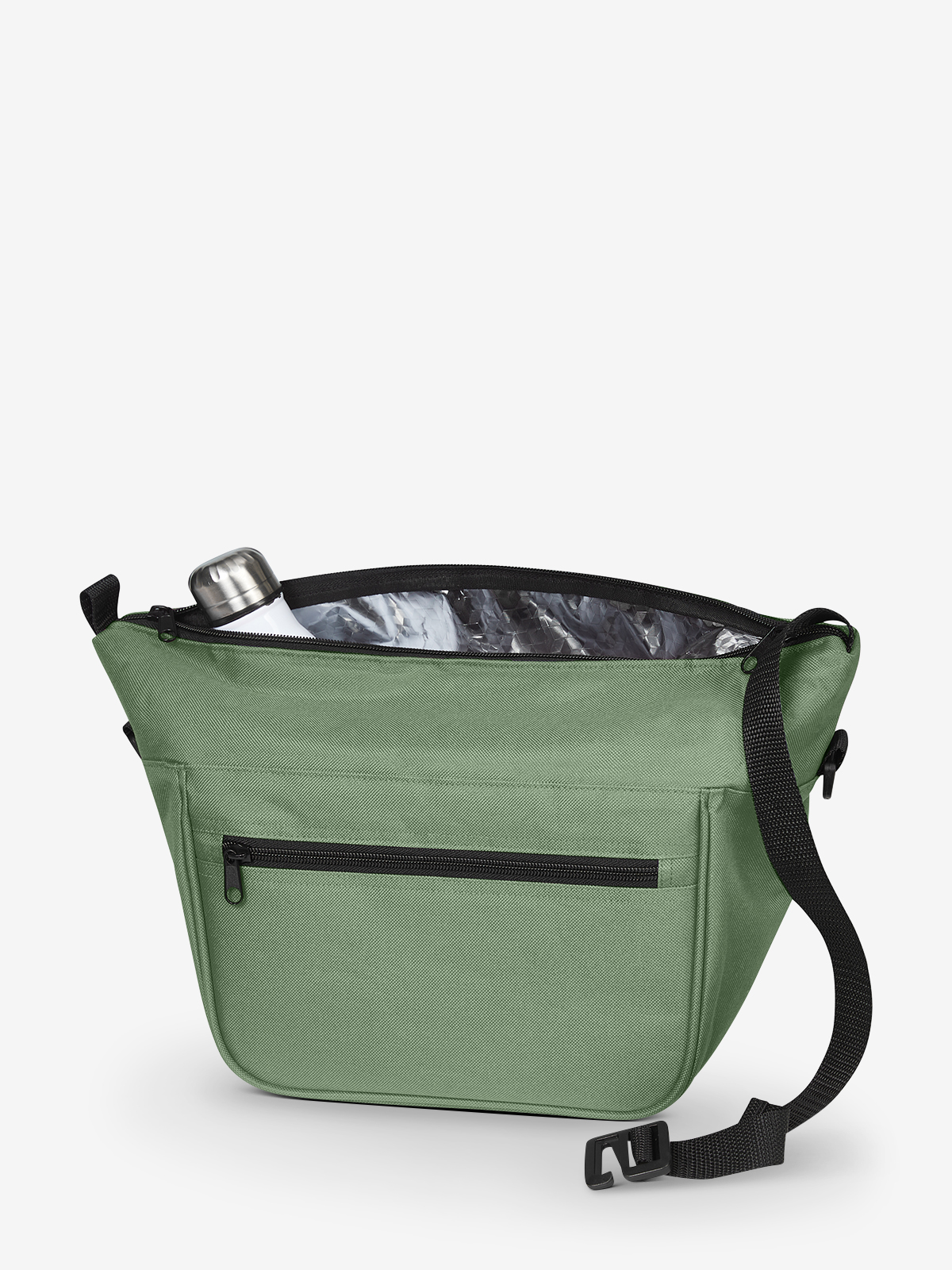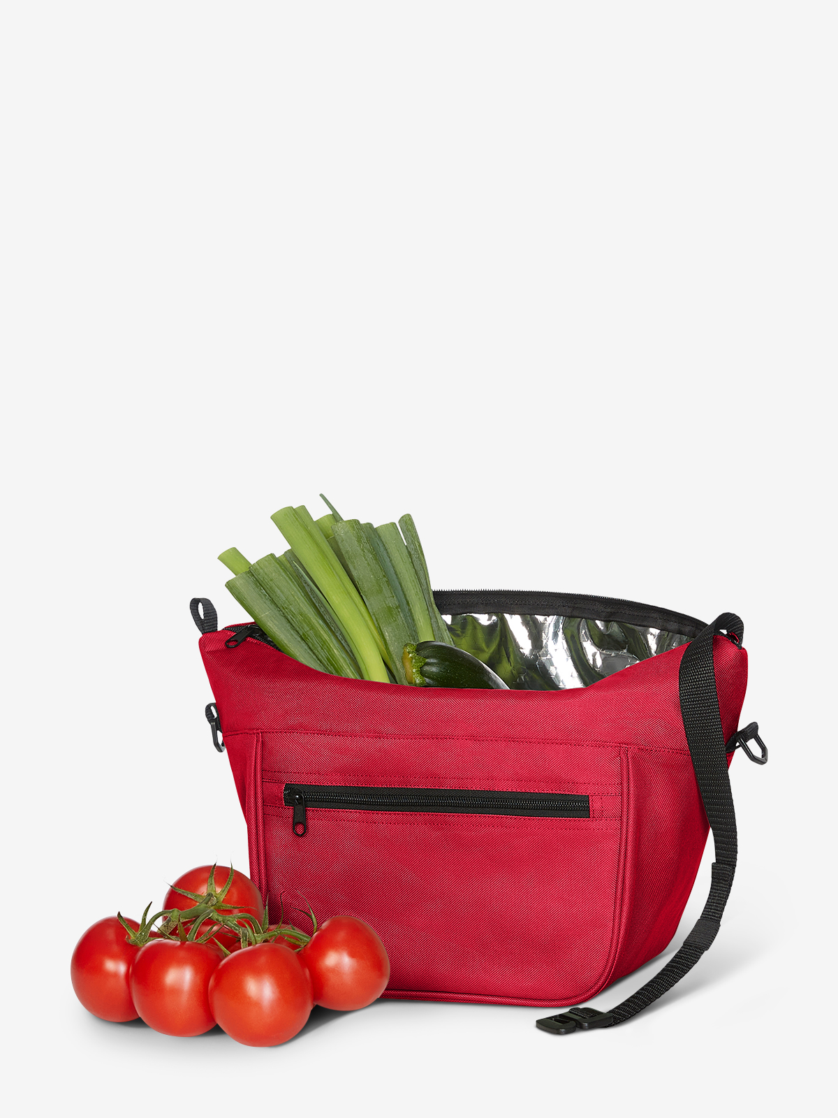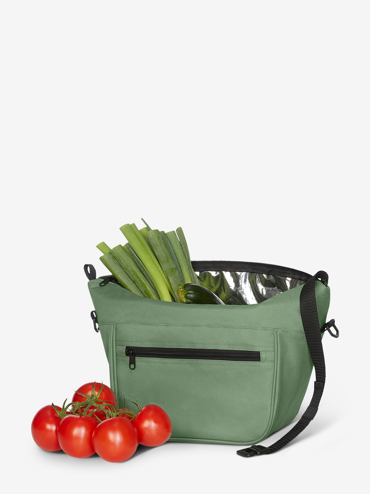 Stylish cooling bag; main compartment with 2-way zipper; generously padded; washable interior; detachable, adjustable strap on one side with G-hook and rubber tab for strap attachment; D-rings on both sides for attachment of e.g.: optional shoulder strap* or keys; bottom feet; loops on back for attaching to bike handlebars (*not included)