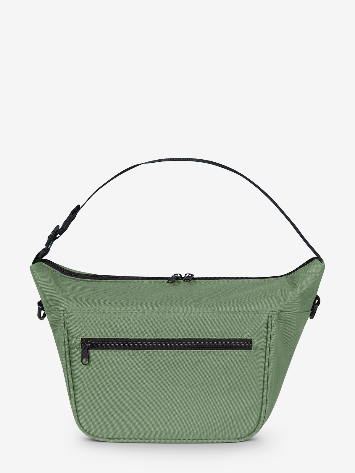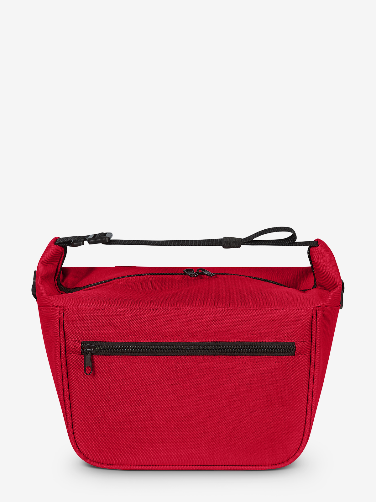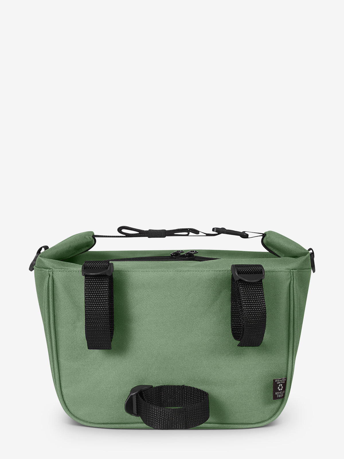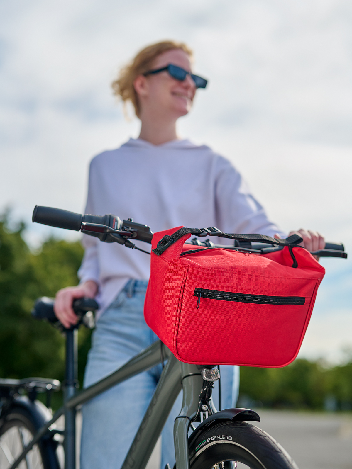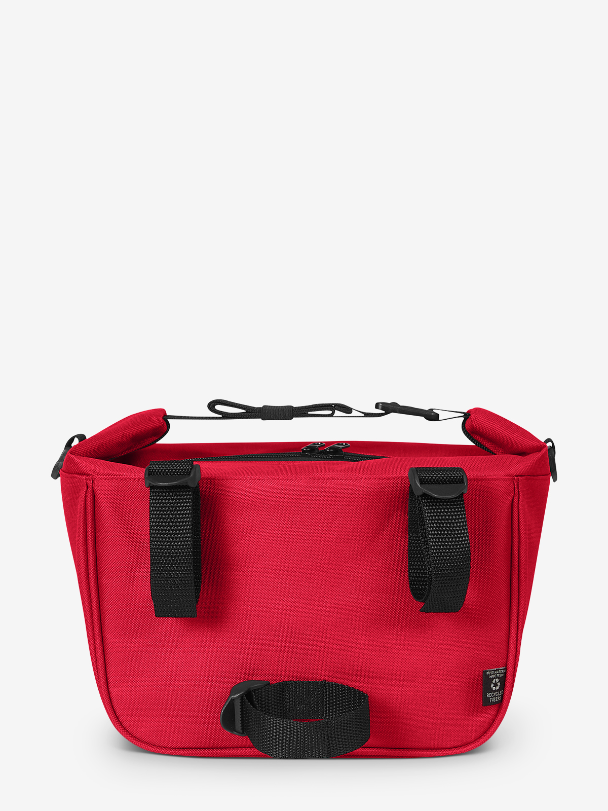 Stylish cooling bag; main compartment with 2-way zipper; generously padded; washable interior; detachable, adjustable strap on one side with G-hook and rubber tab for strap attachment; D-rings on both sides for attachment of e.g.: optional shoulder strap* or keys; bottom feet; loops on back for attaching to bike handlebars (*not included)