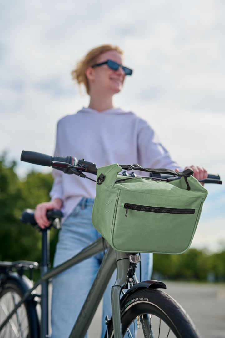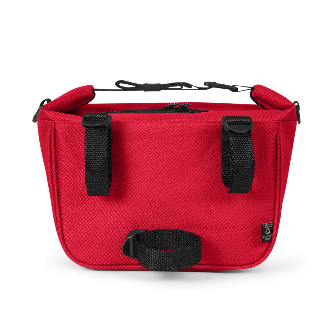 Stylish cooling bag; main compartment with 2-way zipper; generously padded; washable interior; detachable, adjustable strap on one side with rubber flap for strap attachment; D-rings on both sides for attachment of e.g.: optional shoulder strap* or keys; bottom feet; loops on back for attaching to bike handlebars
