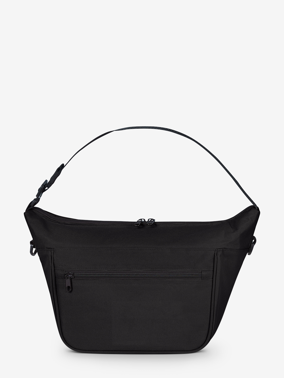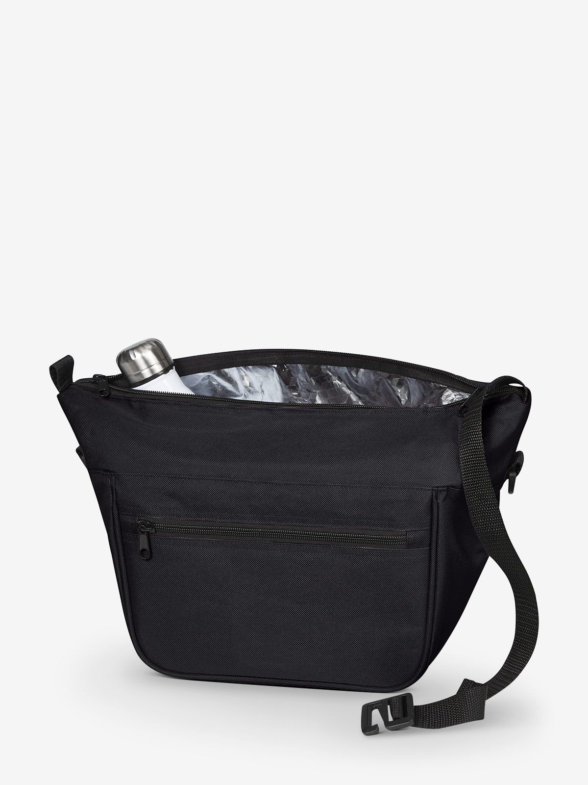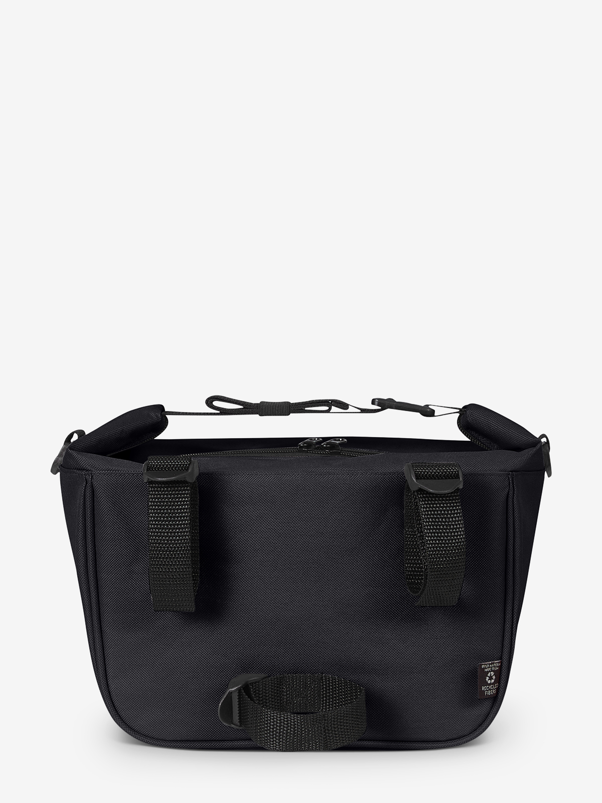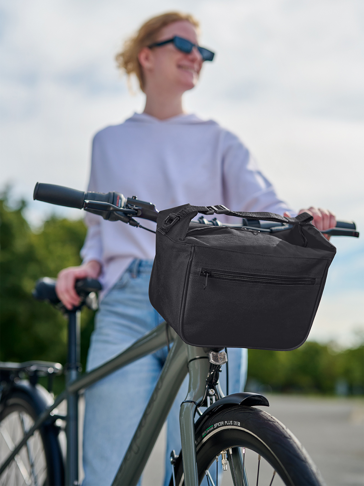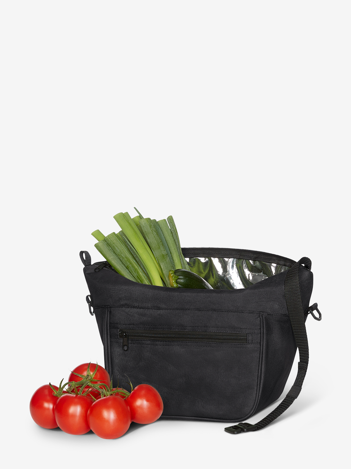 Stylish cooling bag; main compartment with 2-way zipper; generously padded; washable interior; detachable, adjustable strap on one side with G-hook and rubber tab for strap attachment; D-rings on both sides for attachment of e.g.: optional shoulder strap* or keys; bottom feet; loops on back for attaching to bike handlebars (*not included)