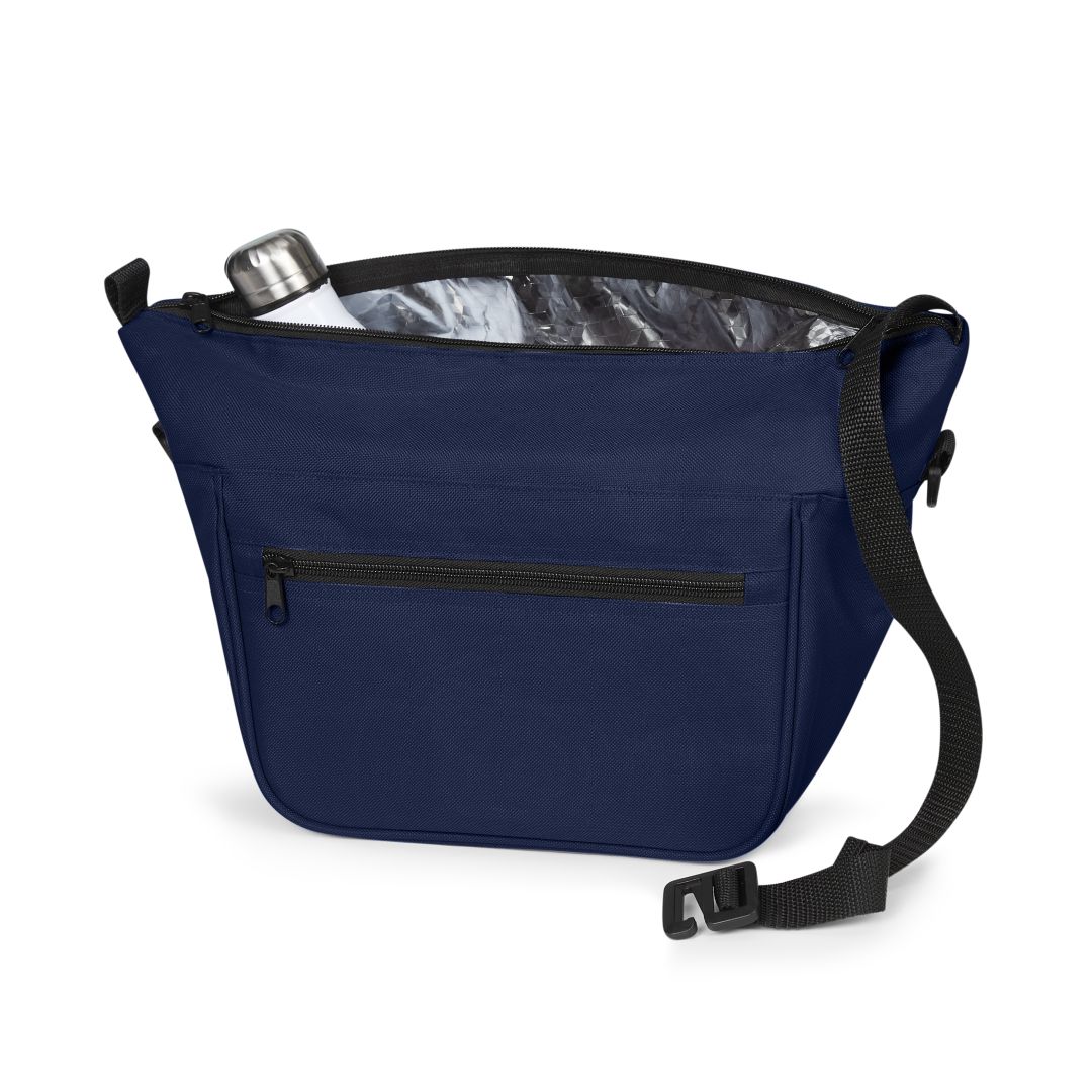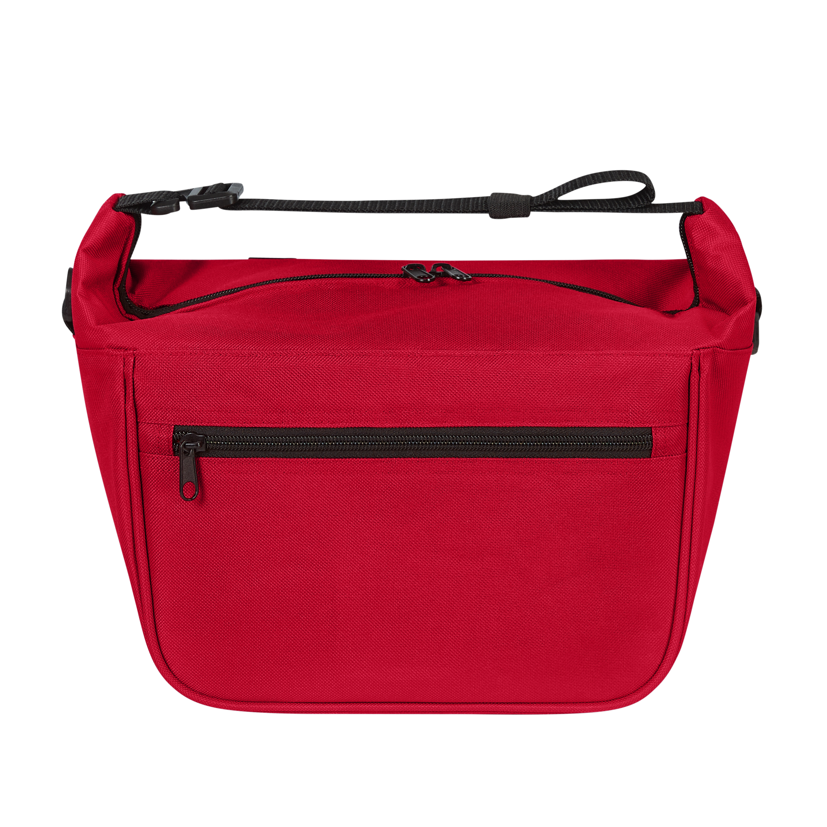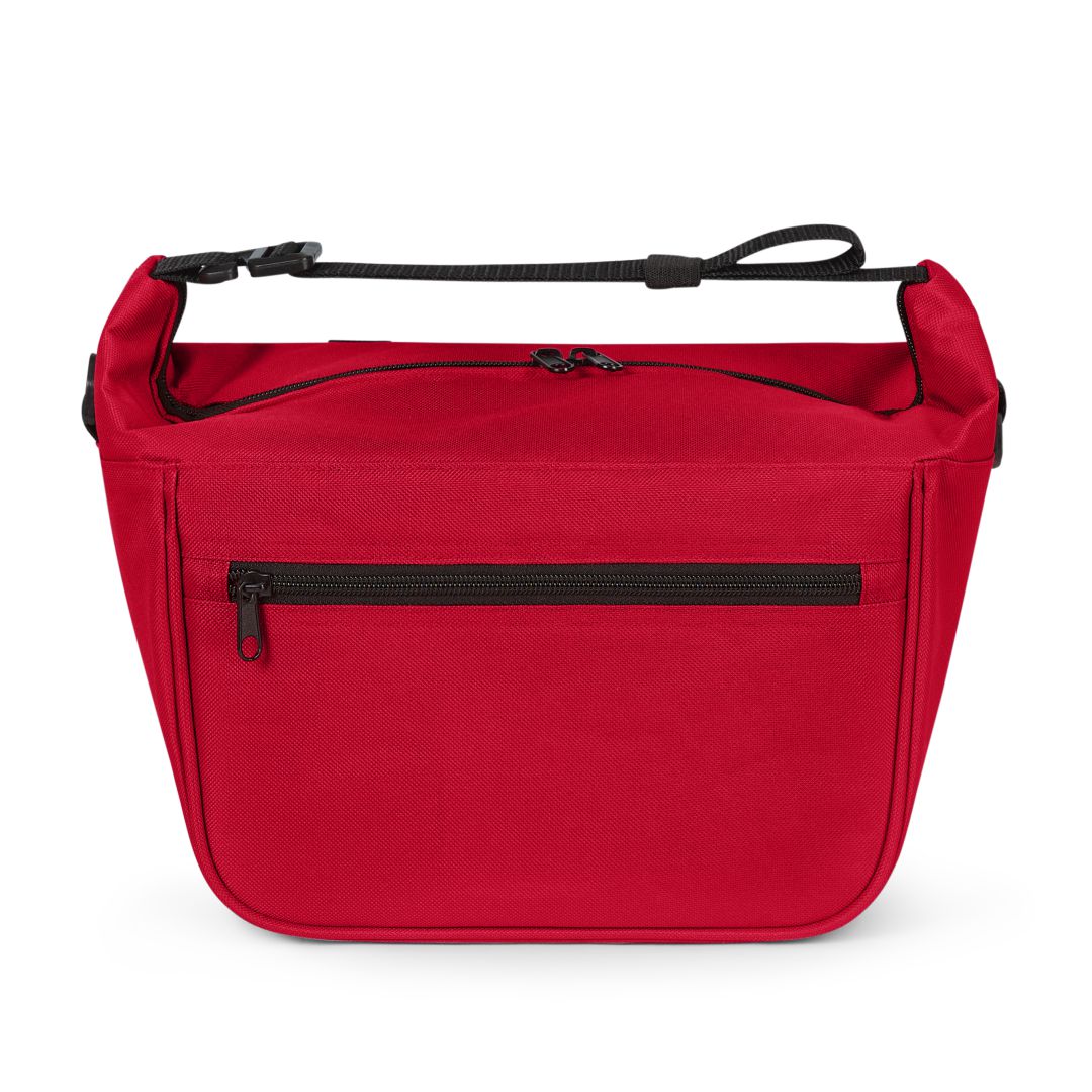 Stylish cooling bag; main compartment with 2-way zipper; generously padded; washable interior; detachable, adjustable strap on one side with rubber flap for strap attachment; D-rings on both sides for attachment of e.g.: optional shoulder strap* or keys; bottom feet; loops on back for attaching to bike handlebars