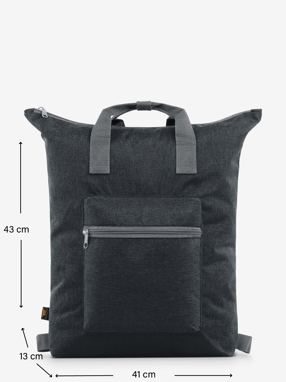 modern backpack shopper; main compartment with zipper; front zipper pocket; inside zipper pocket; handles with press stud cuff; adjustable, breathable carrying system; folding and stowage function