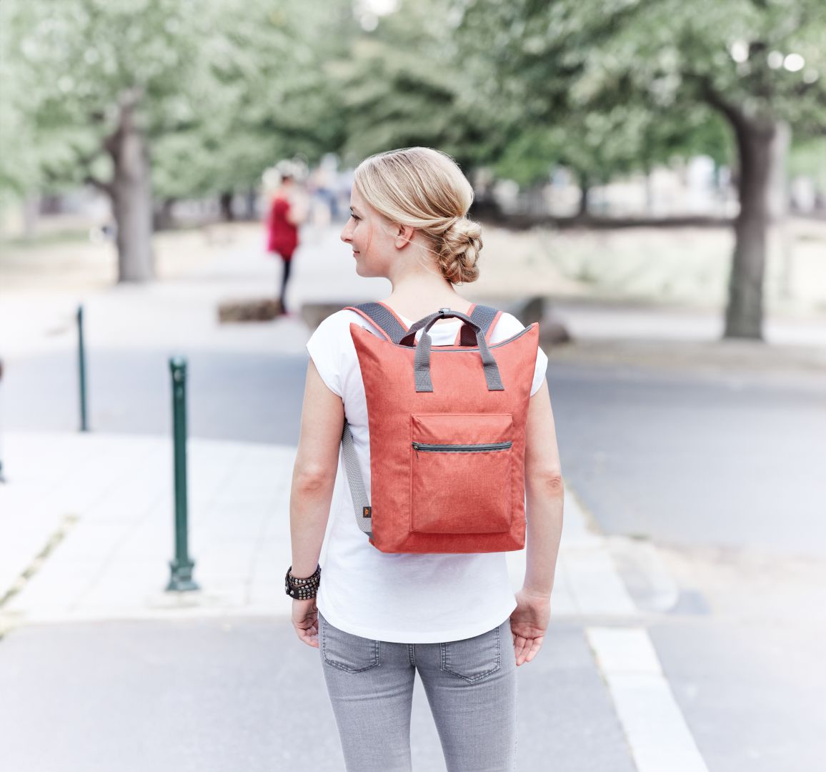 modern backpack shopper; main compartment with zipper; front zipper pocket; inside zipper pocket; handles with press stud cuff; adjustable, breathable carrying system; folding and stowage function