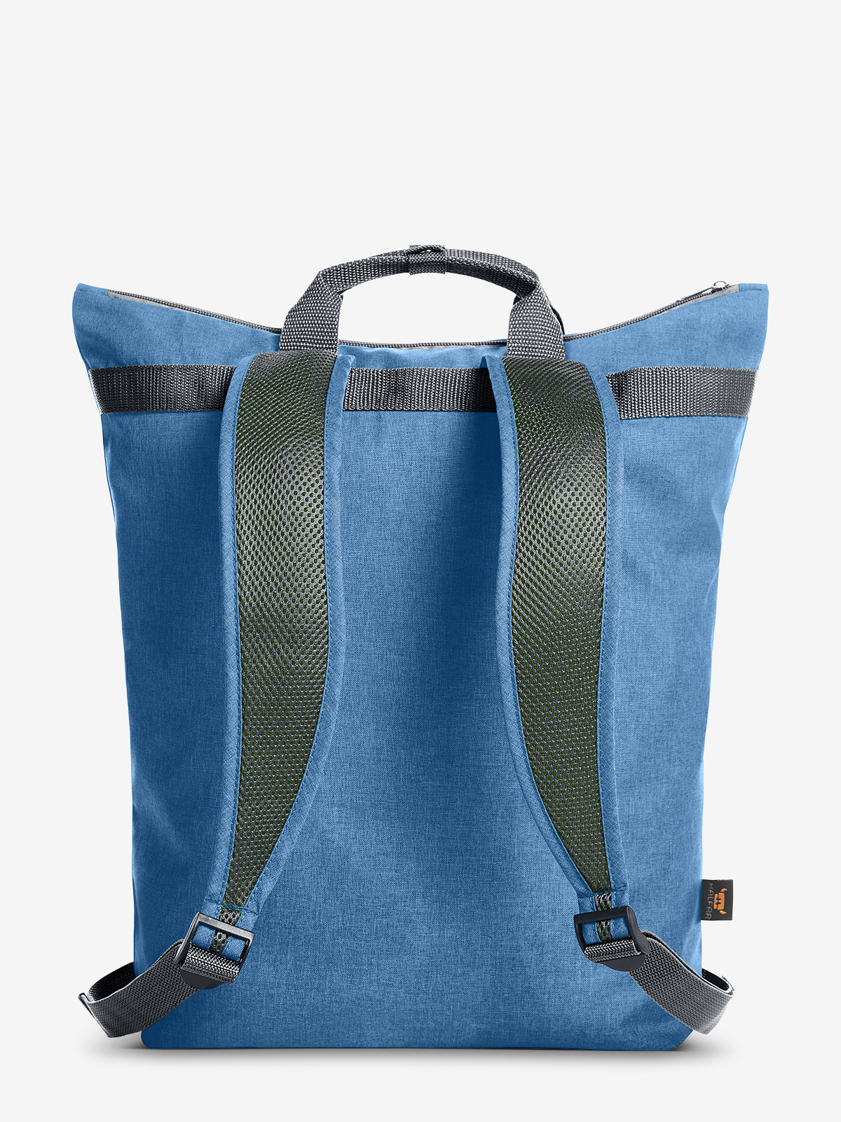 modern backpack shopper; main compartment with zipper; front zipper pocket; inside zipper pocket; handles with press stud cuff; adjustable, breathable carrying system; folding and stowage function