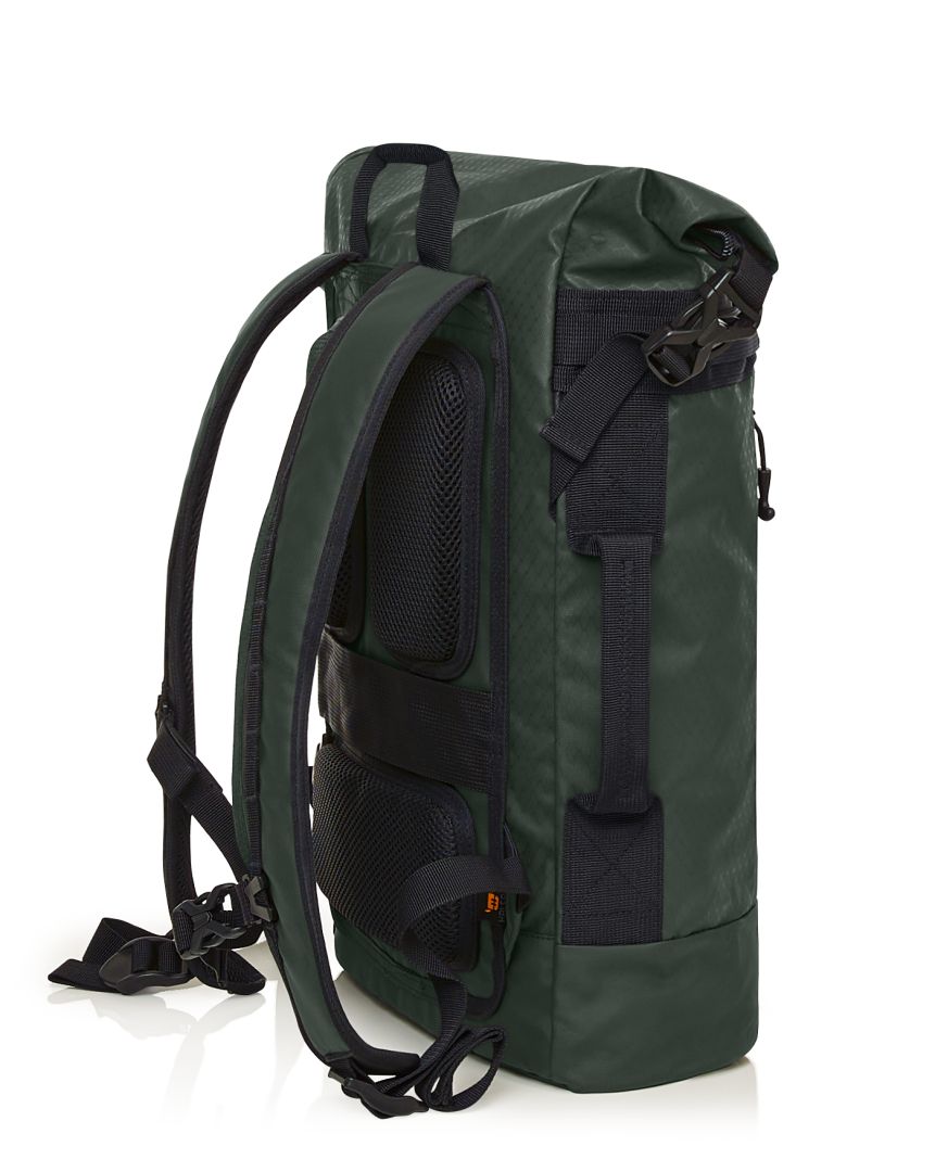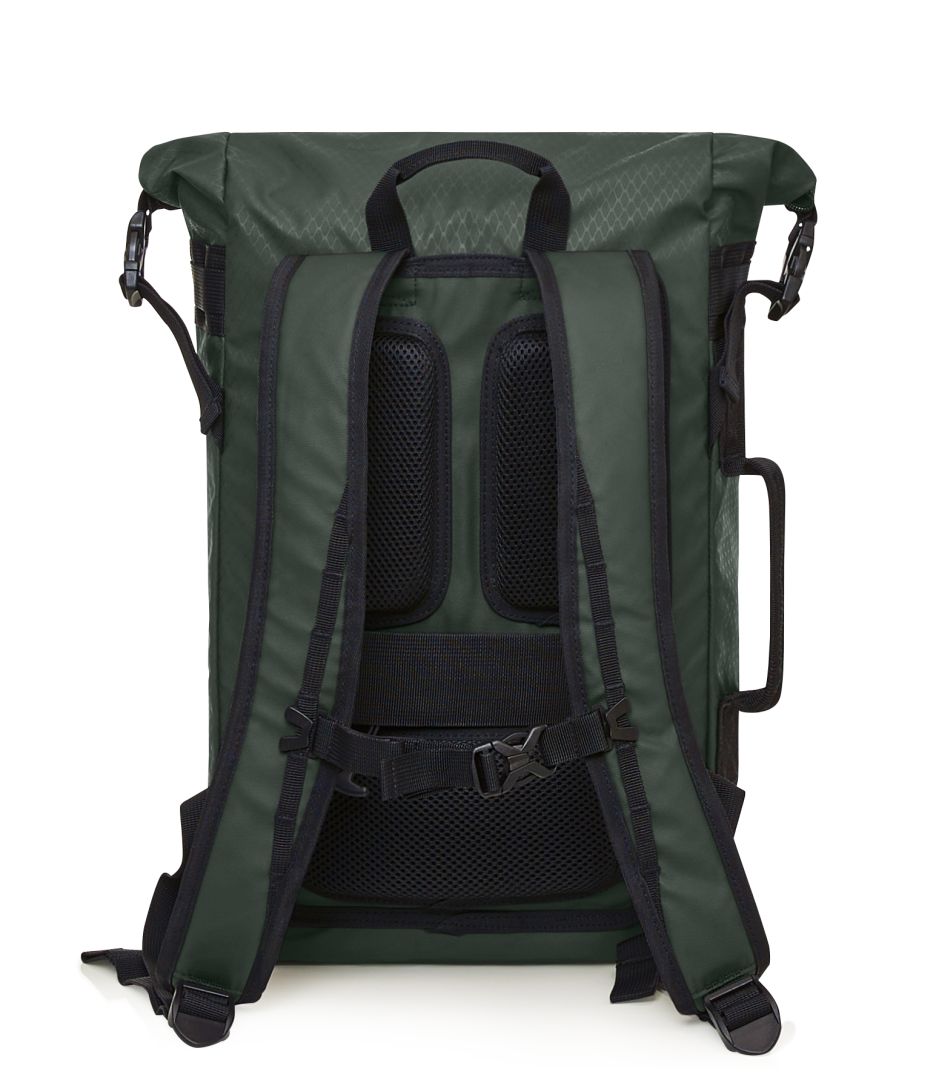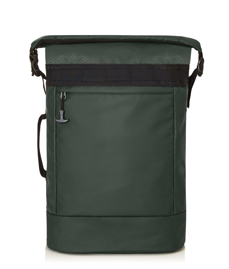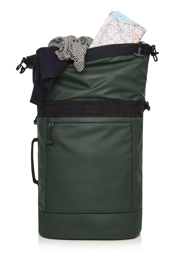 Elaborately made roll-top backpack; zipped main compartment with side buckles; padded slip-in pocket inside; large zipped front pocket; functional strap band on the front; attachment loop for trolley handle on the back; concealed zipped compartment; padded carrying system with height-adjustable chest strap; handle on both sides and back