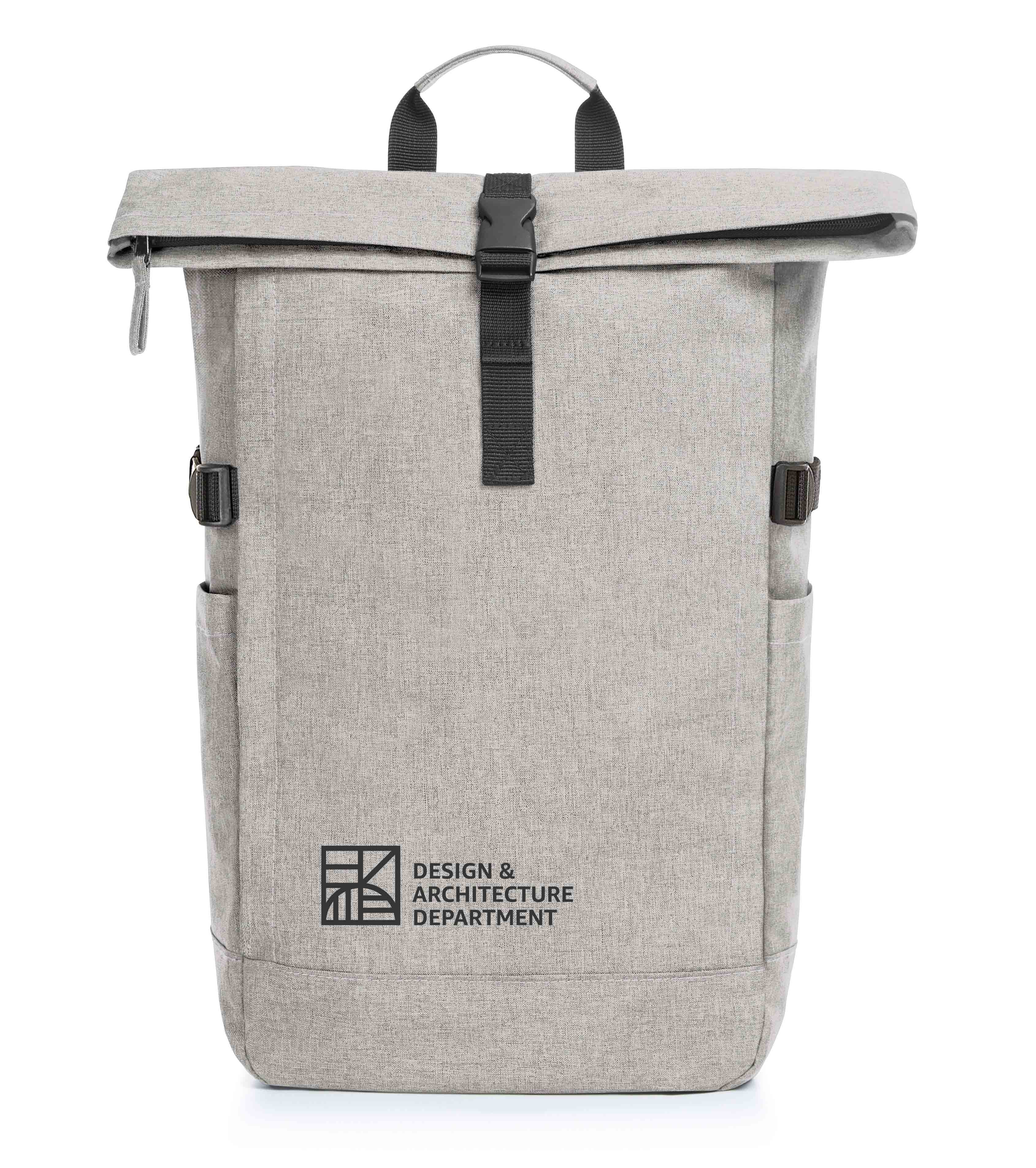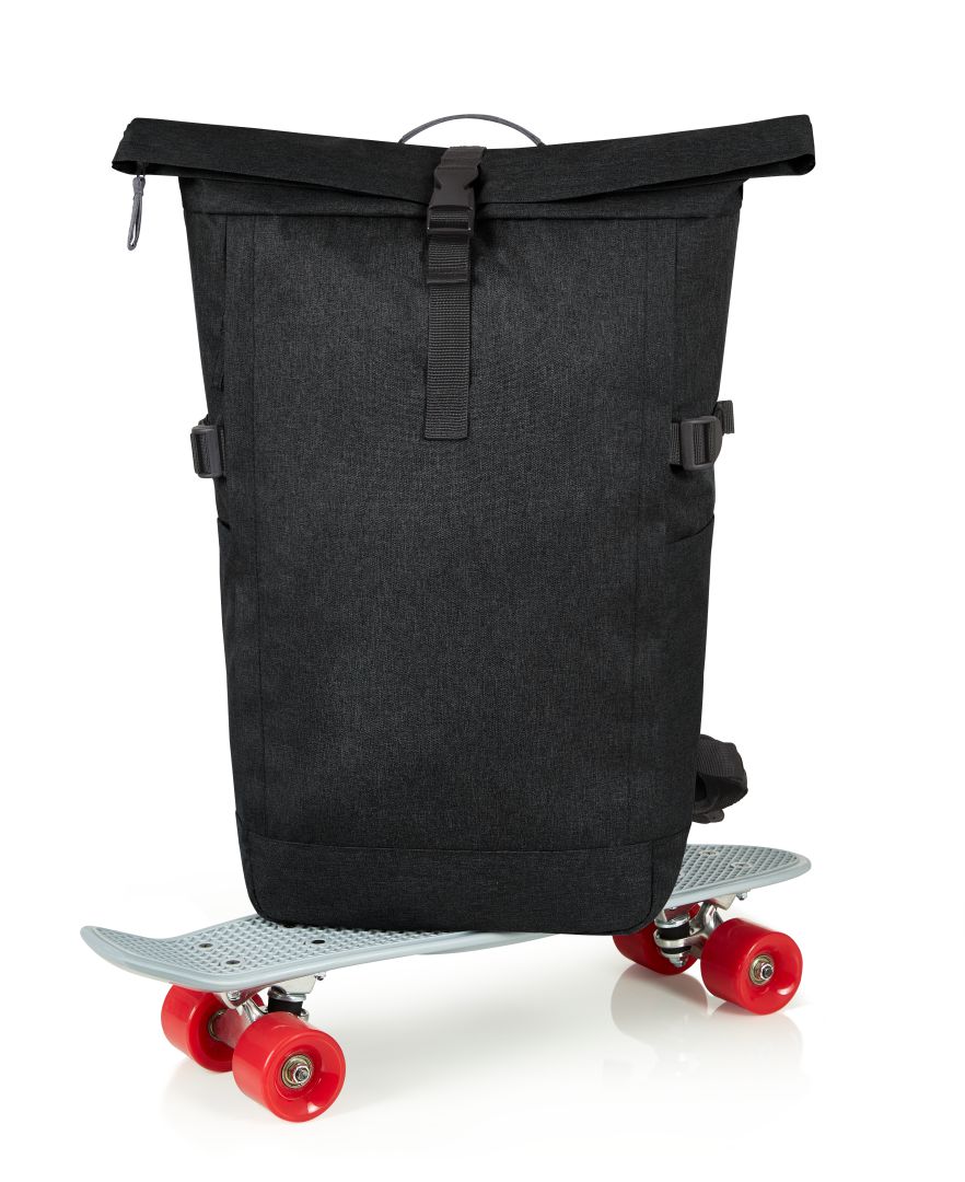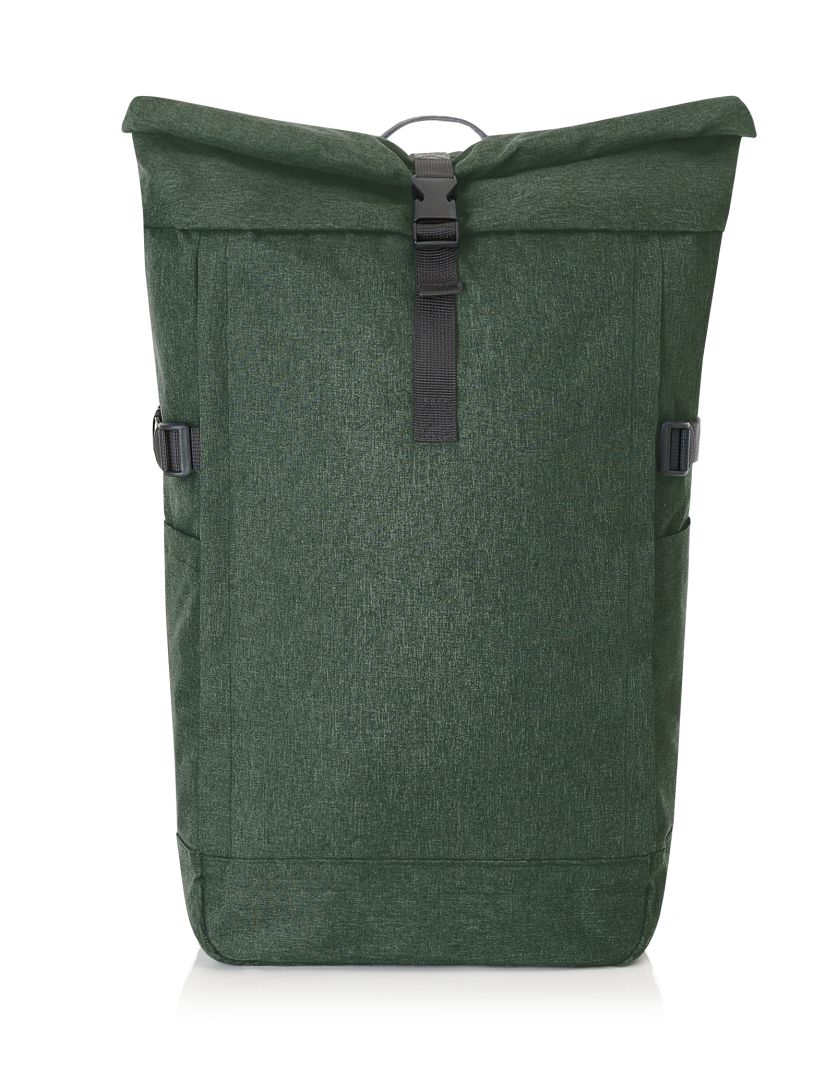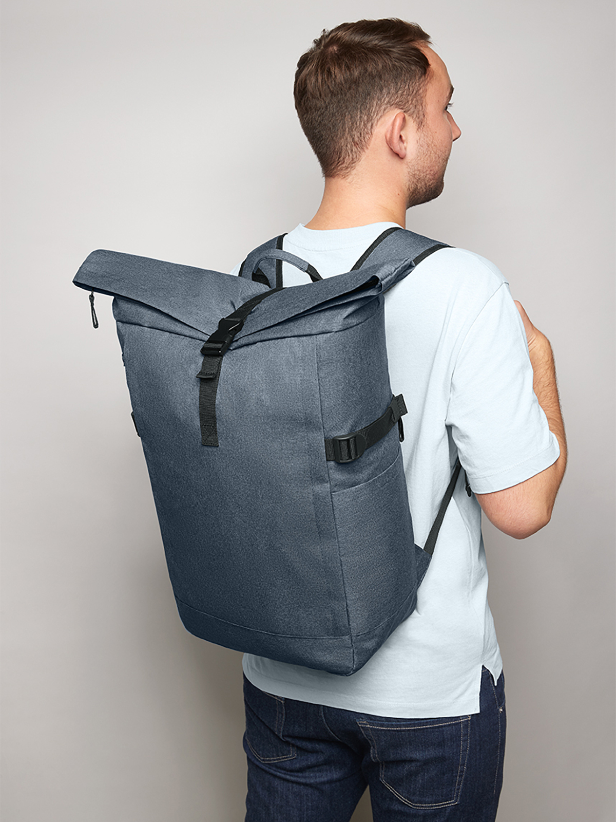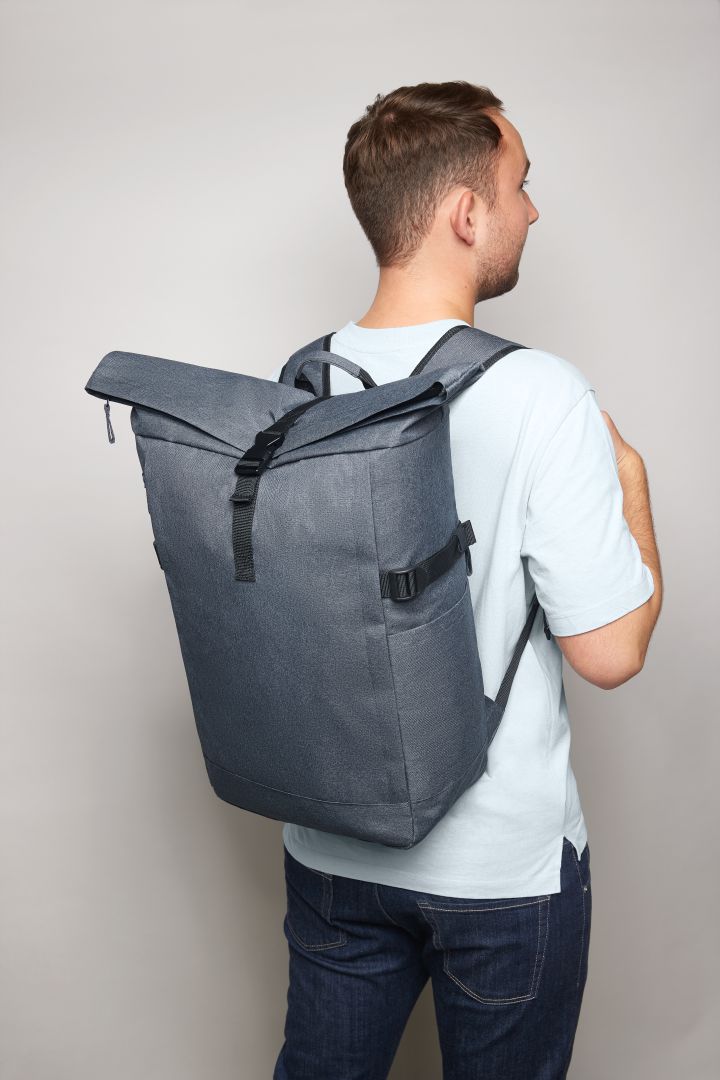 Urban backpack with zipped main compartment and buckle; RPET upper material; padded slip-in pocket and organiser elements inside; side zipped front pocket; two side slip-in pockets; fixing straps; rear zipped pocket; padded carrying system with height-adjustable chest strap; handle