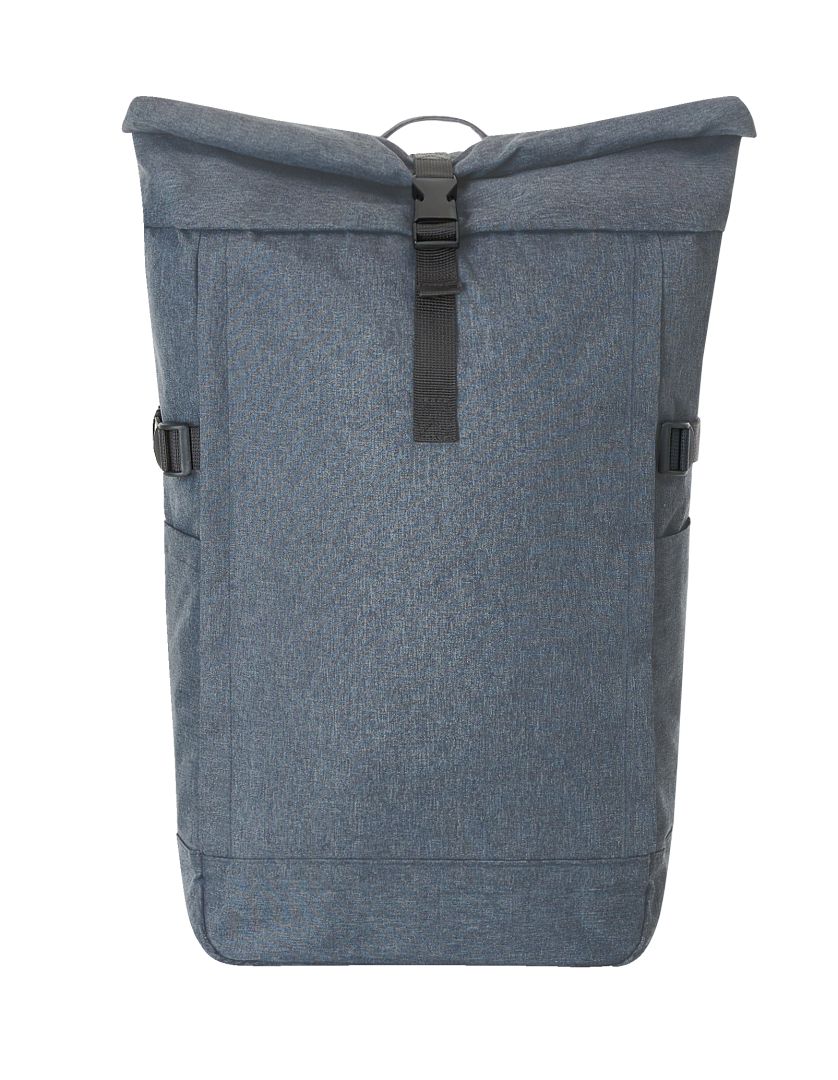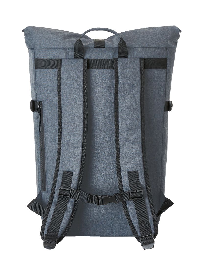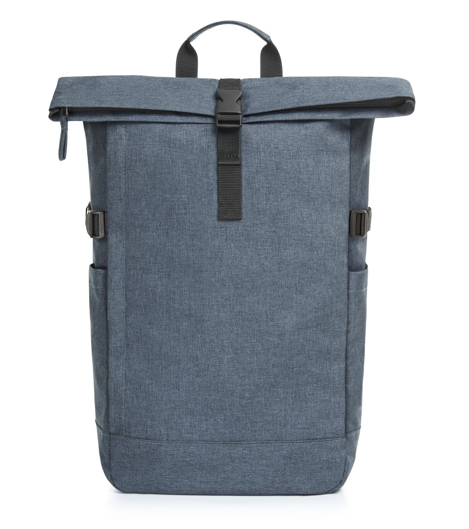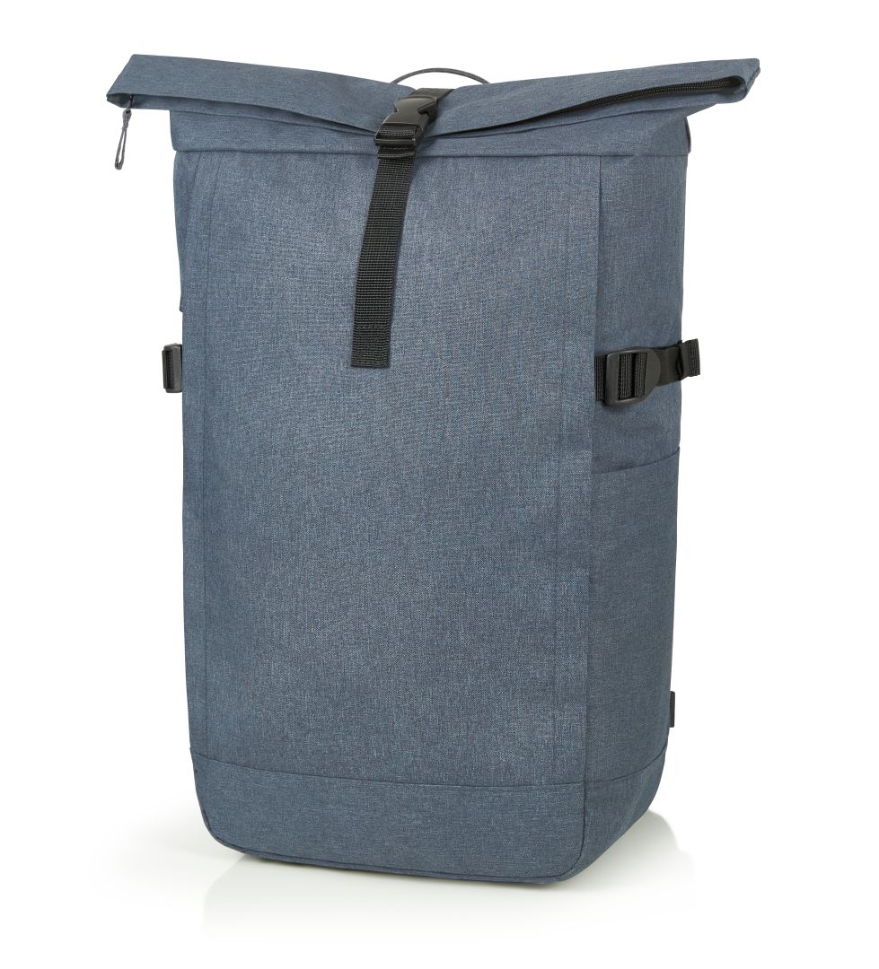 Urban backpack with zipped main compartment and buckle; RPET upper material; padded slip-in pocket and organiser elements inside; side zipped front pocket; two side slip-in pockets; fixing straps; rear zipped pocket; padded carrying system with height-adjustable chest strap; handle
