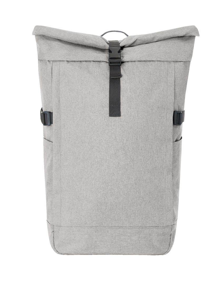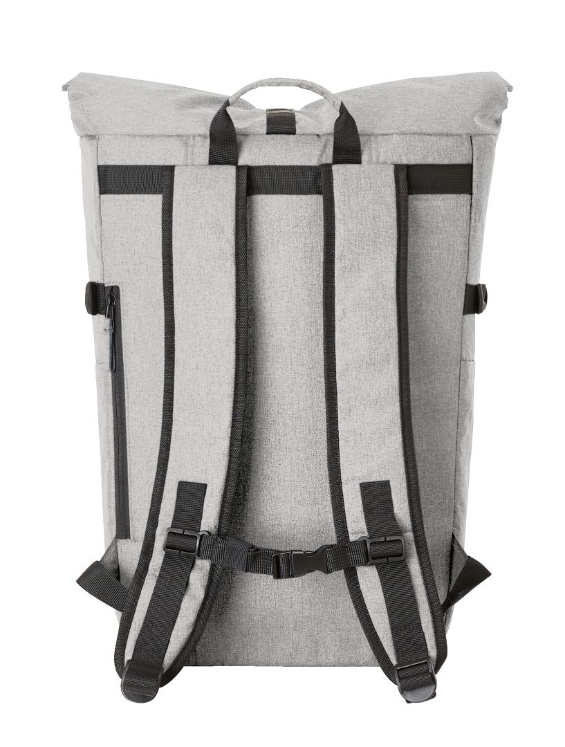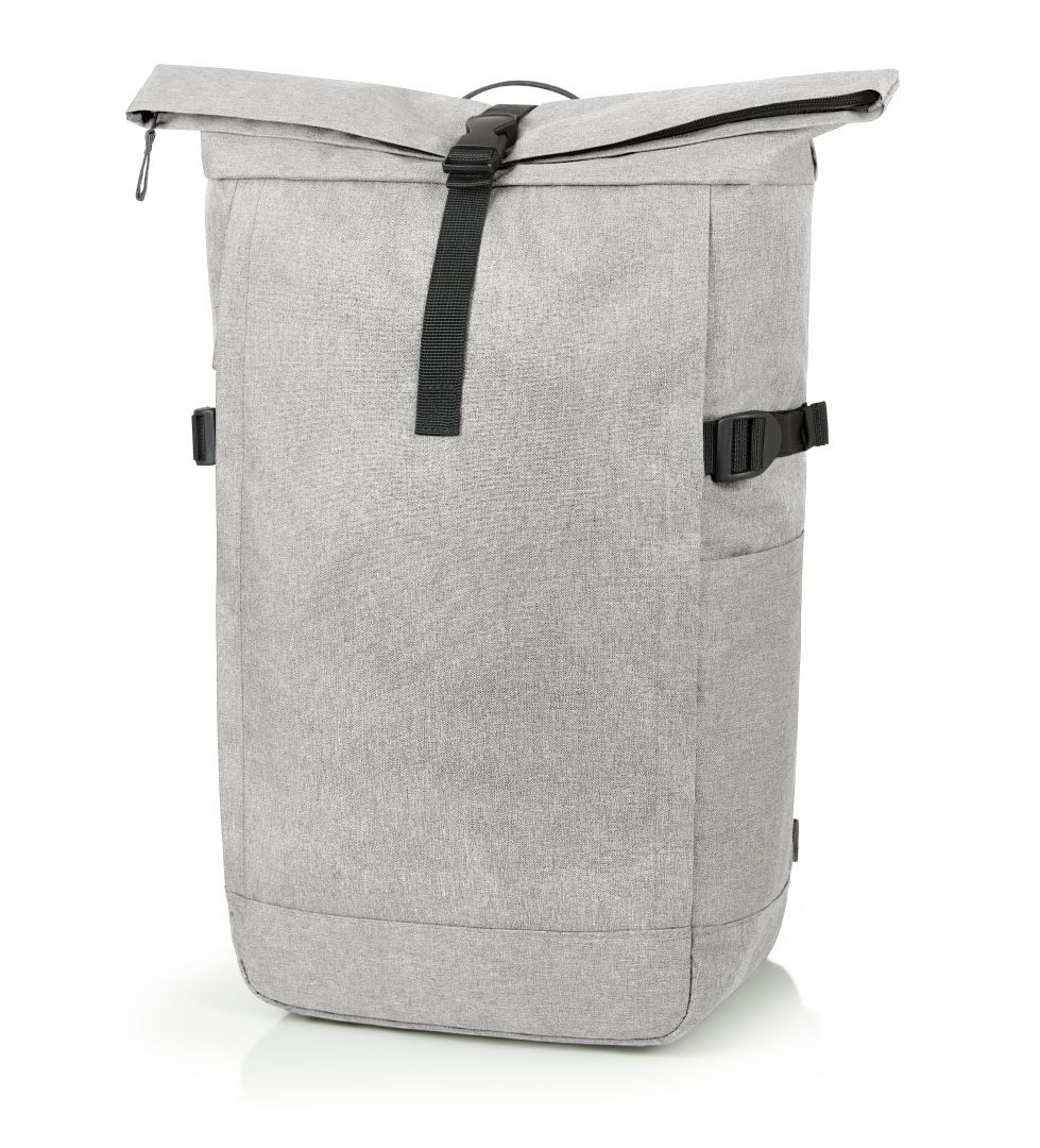 Urban backpack with zipped main compartment and buckle; RPET upper material; padded slip-in pocket and organiser elements inside; side zipped front pocket; two side slip-in pockets; fixing straps; rear zipped pocket; padded carrying system with height-adjustable chest strap; handle