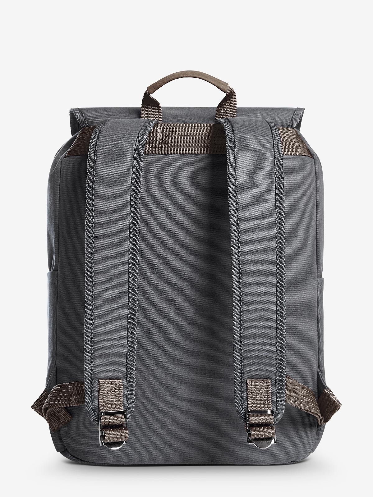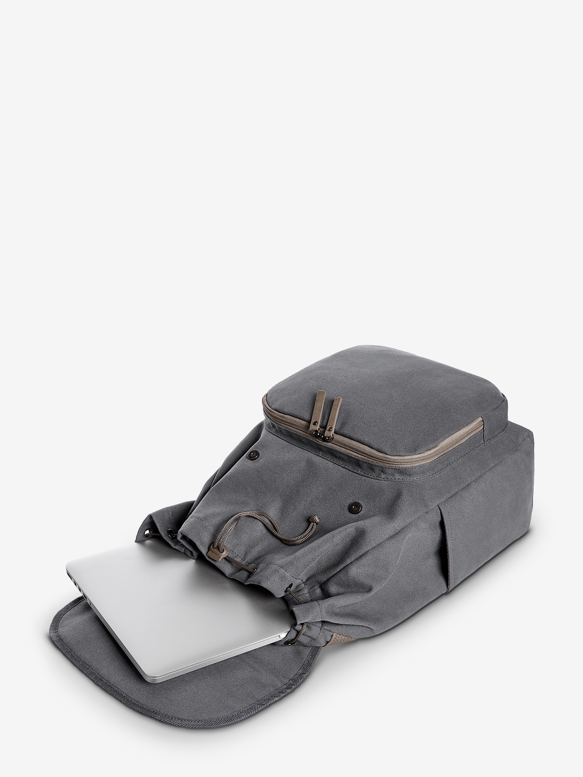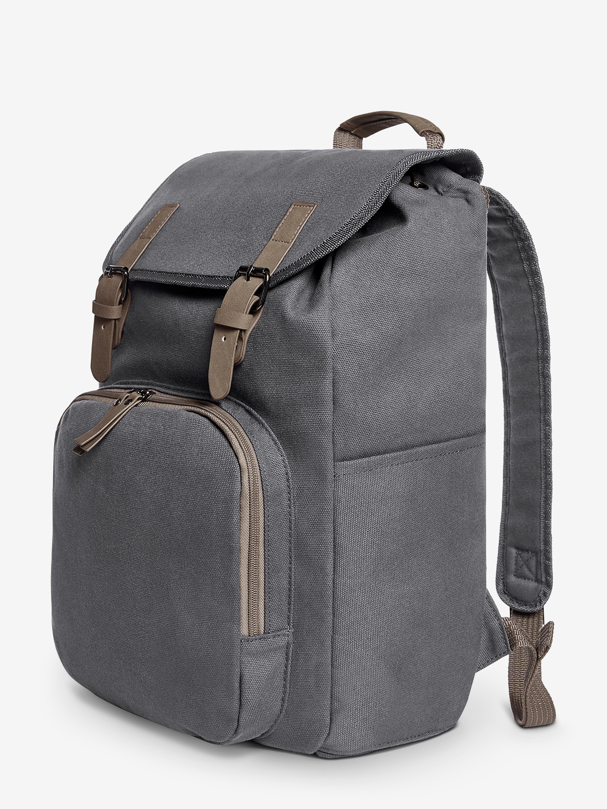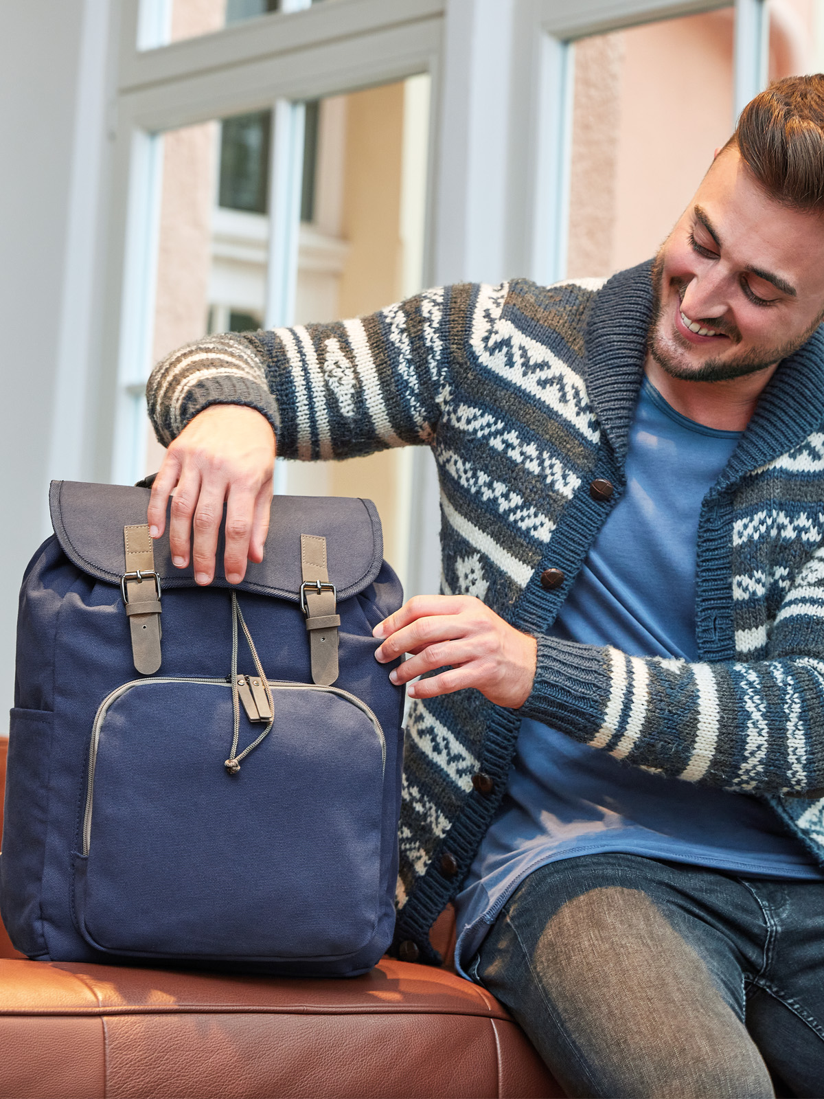 flap with adjustable decorative buckles and magnetic clasp; large main compartment with drawstring fastener; padded notebook compartment; front pocket with 2-way zipper; two flat insert pockets; handle with grip cuff; padded, adjustable shoulder straps; high-quality metal and PU suede faux leather accessories
