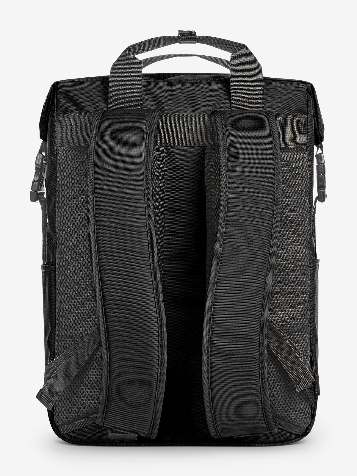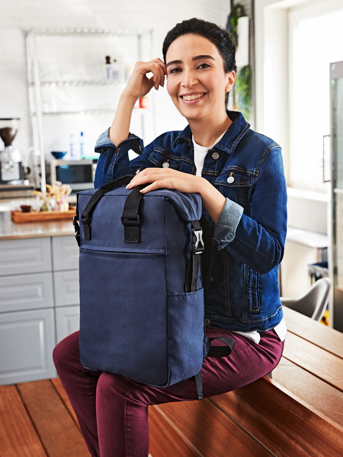 Charming rectangular-shaped backpack; RPET upper material; spacious main compartment with 2-way zip; padded notebook compartment; flat slip-in compartment inside; side snap buckles for convenient opening; snap buckles can be connected to make a handle; large zipped front pocket; two side slip-in compartments e.g. for water bottles; padded carrying system; handles with press stud cuff