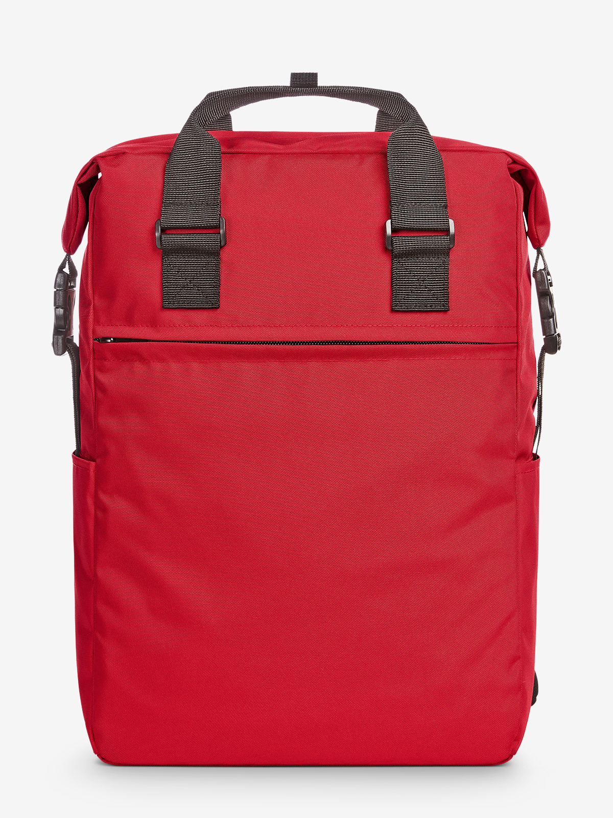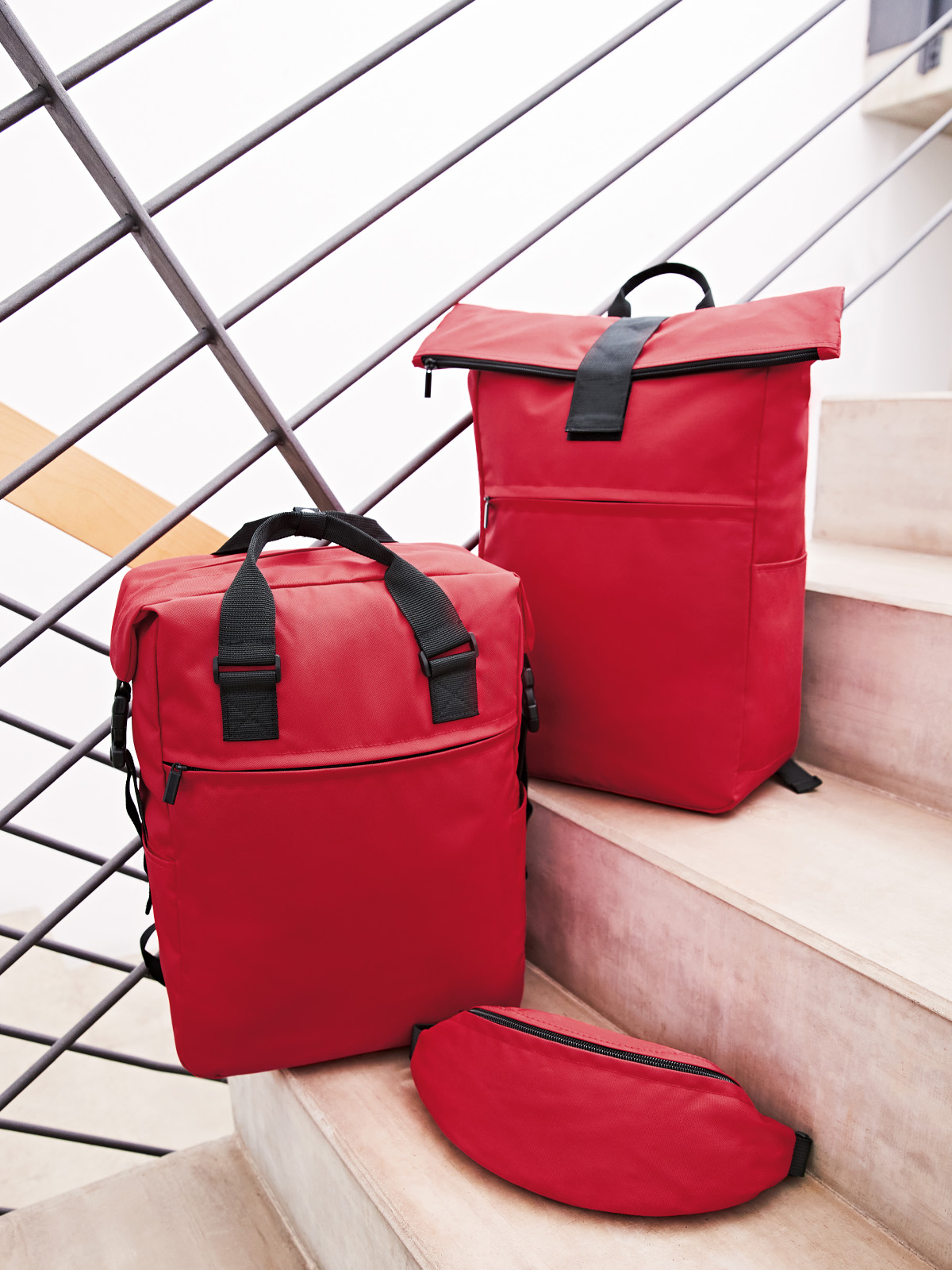 Charming rectangular-shaped backpack; RPET upper material; spacious main compartment with 2-way zip; padded notebook compartment; flat slip-in compartment inside; side snap buckles for convenient opening; snap buckles can be connected to make a handle; large zipped front pocket; two side slip-in compartments e.g. for water bottles; padded carrying system; handles with press stud cuff
