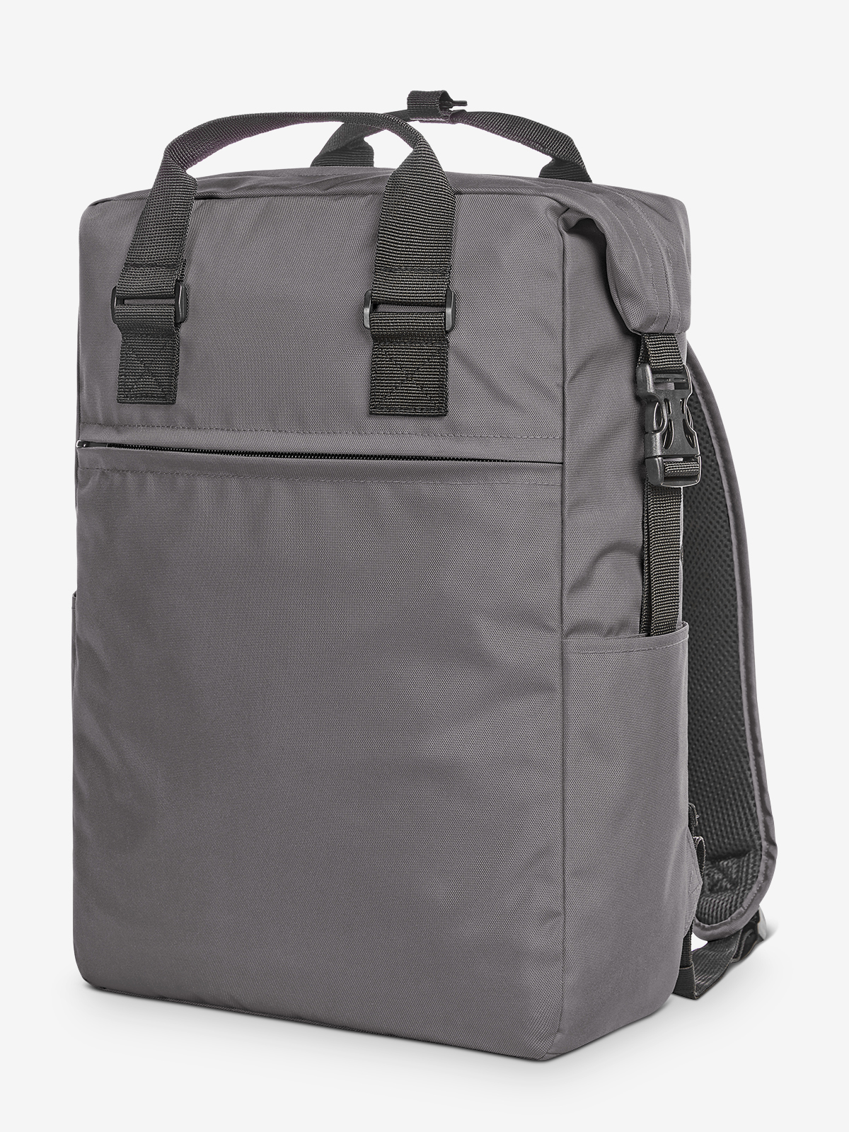 Charming rectangular-shaped backpack; RPET upper material; spacious main compartment with 2-way zip; padded notebook compartment; flat slip-in compartment inside; side snap buckles for convenient opening; snap buckles can be connected to make a handle; large zipped front pocket; two side slip-in compartments e.g. for water bottles; padded carrying system; handles with press stud cuff