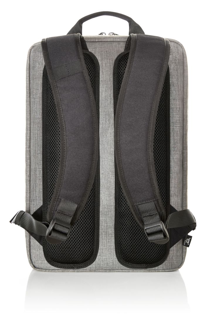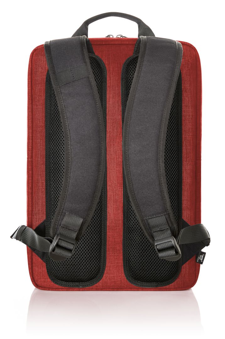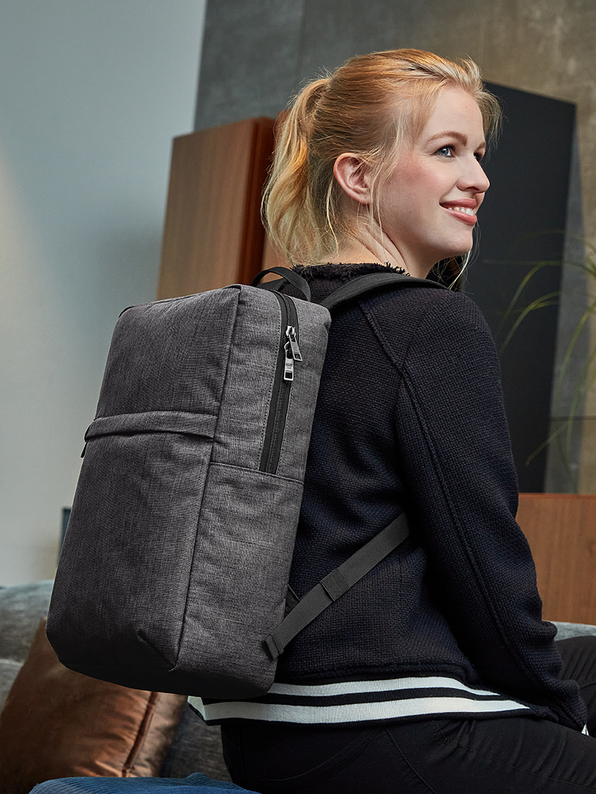 streamlined backpack: rPET outer material; large main compartment with 2-way zip and padded notebook compartment; front pocket with zip; elaborately padded back with hidden zip compartment; length-adjustable padded shoulder straps with rubber loops to attach items such as sunglasses; handle
