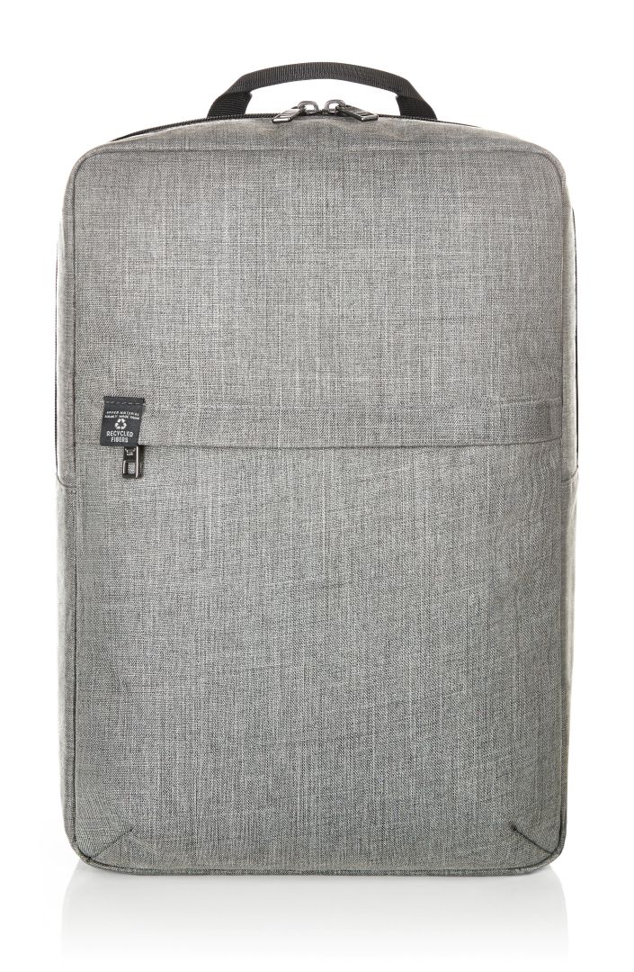 streamlined backpack: rPET outer material; large main compartment with 2-way zip and padded notebook compartment; front pocket with zip; elaborately padded back with hidden zip compartment; length-adjustable padded shoulder straps with rubber loops to attach items such as sunglasses; handle