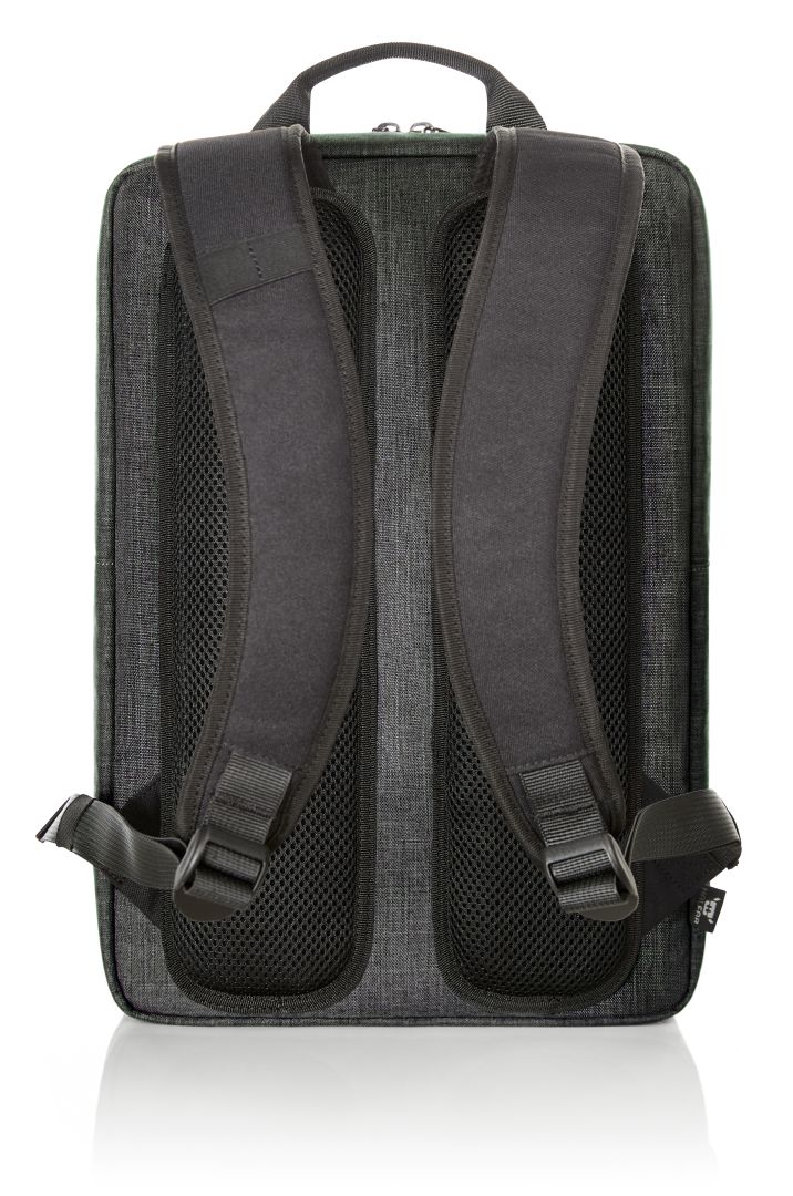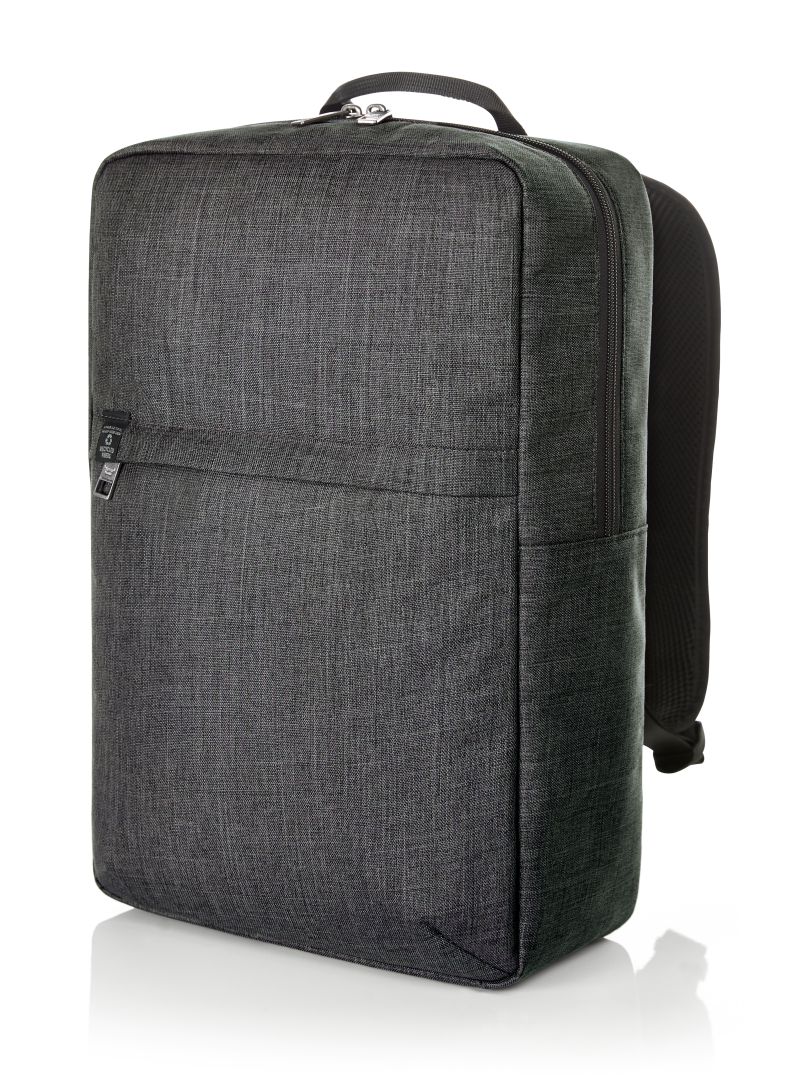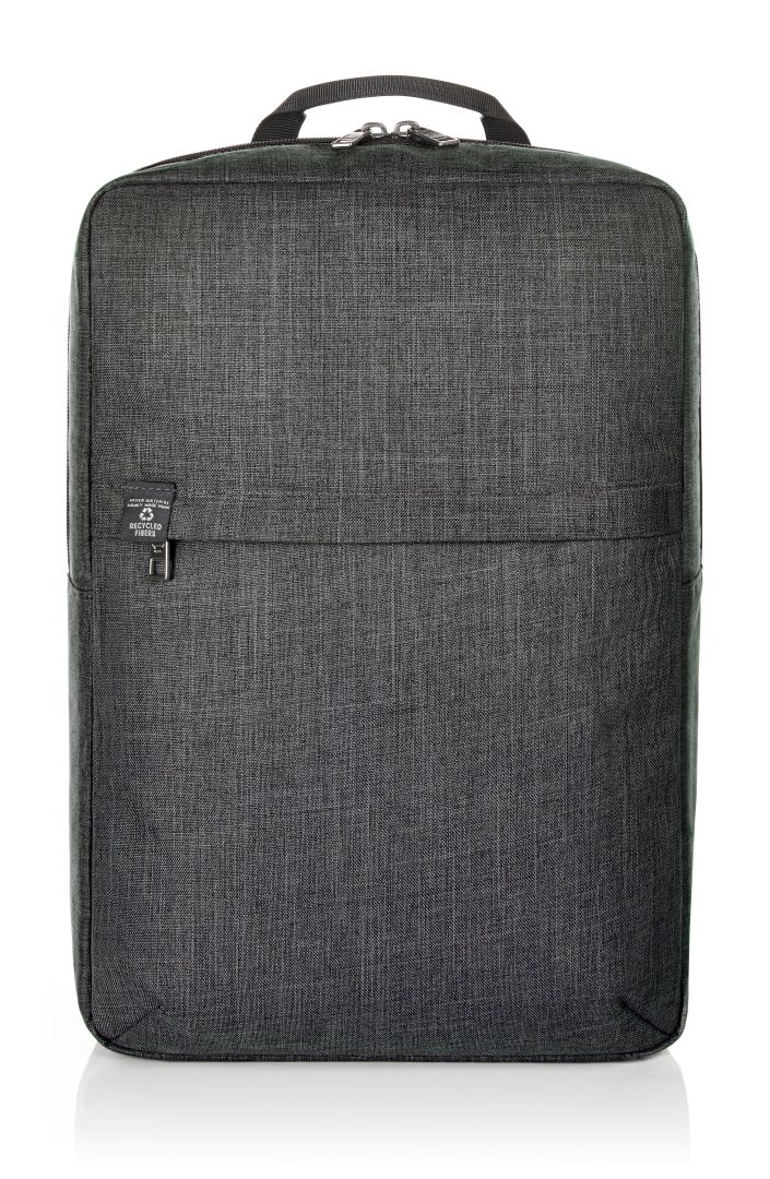 streamlined backpack: rPET outer material; large main compartment with 2-way zip and padded notebook compartment; front pocket with zip; elaborately padded back with hidden zip compartment; length-adjustable padded shoulder straps with rubber loops to attach items such as sunglasses; handle