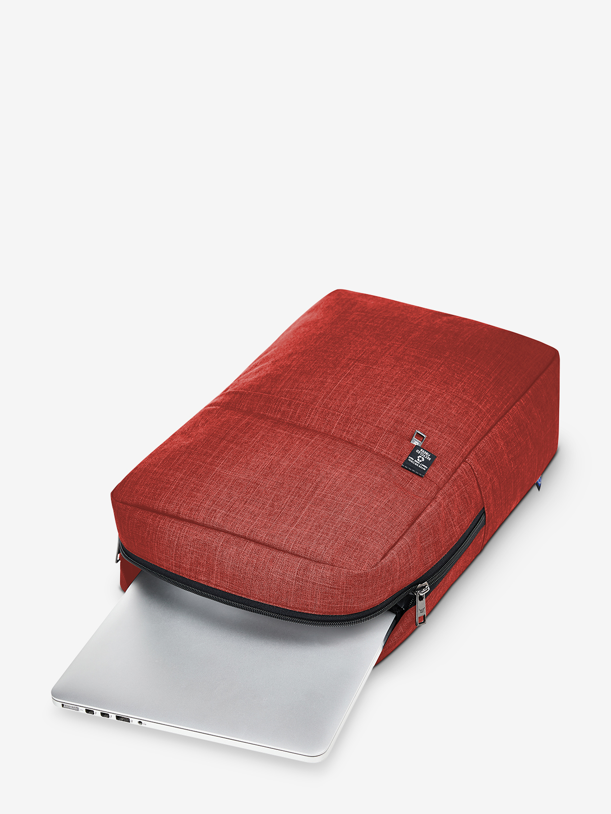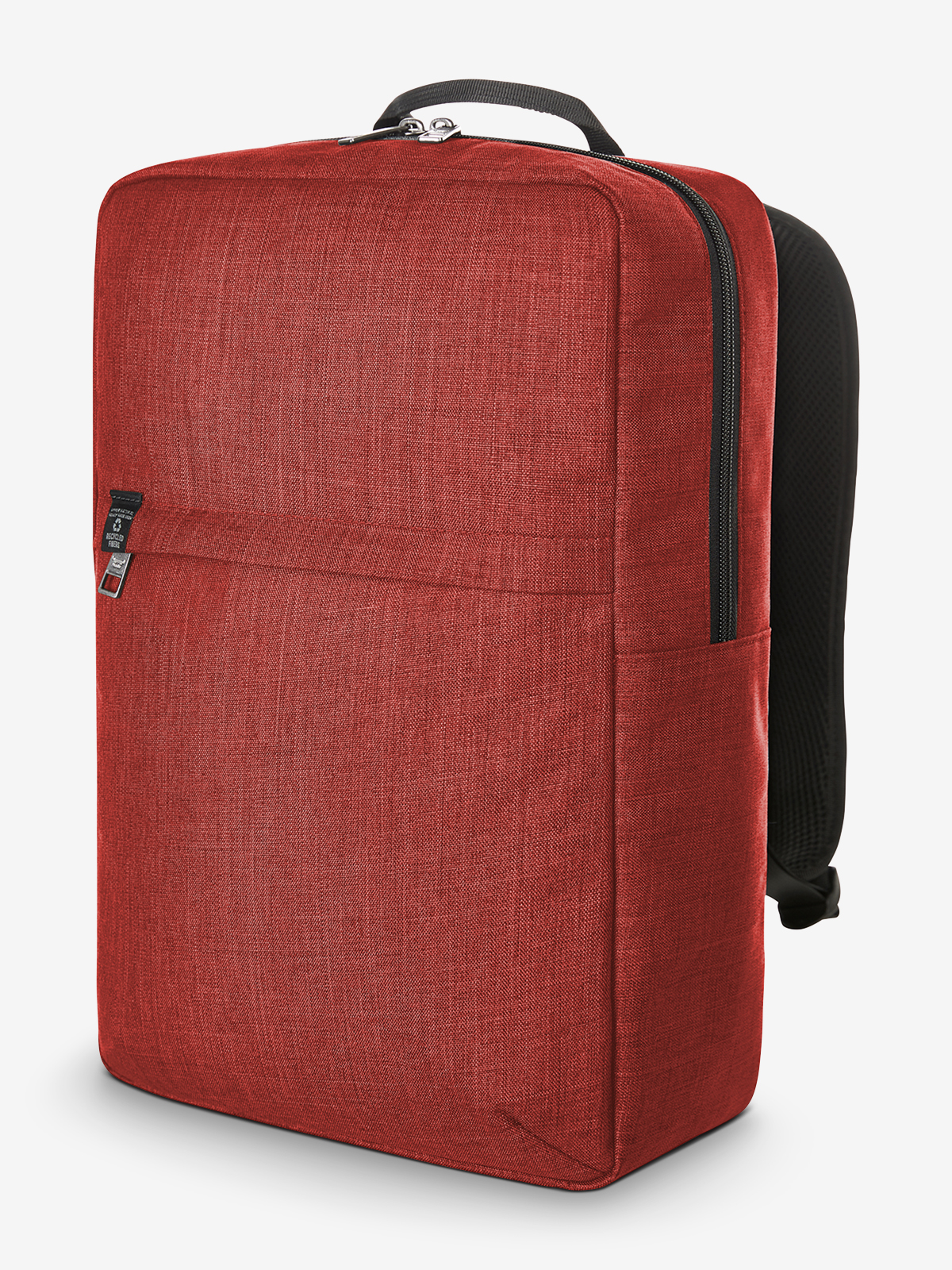 streamlined backpack: rPET outer material; large main compartment with 2-way zip and padded notebook compartment; front pocket with zip; elaborately padded back with hidden zip compartment; length-adjustable padded shoulder straps with rubber loops to attach items such as sunglasses; handle