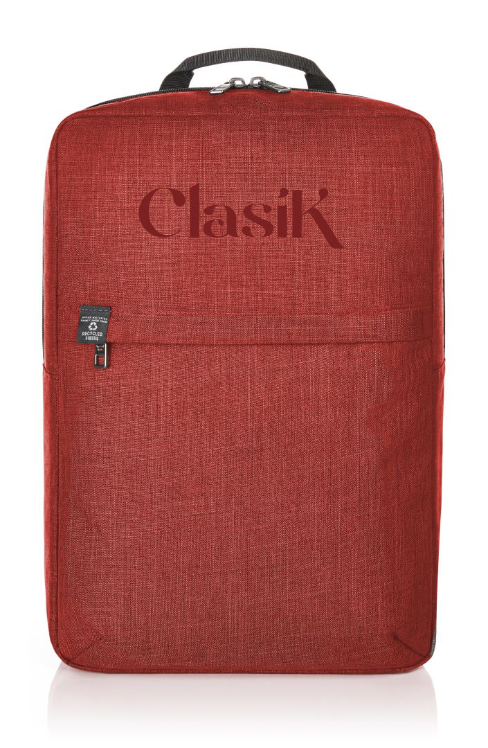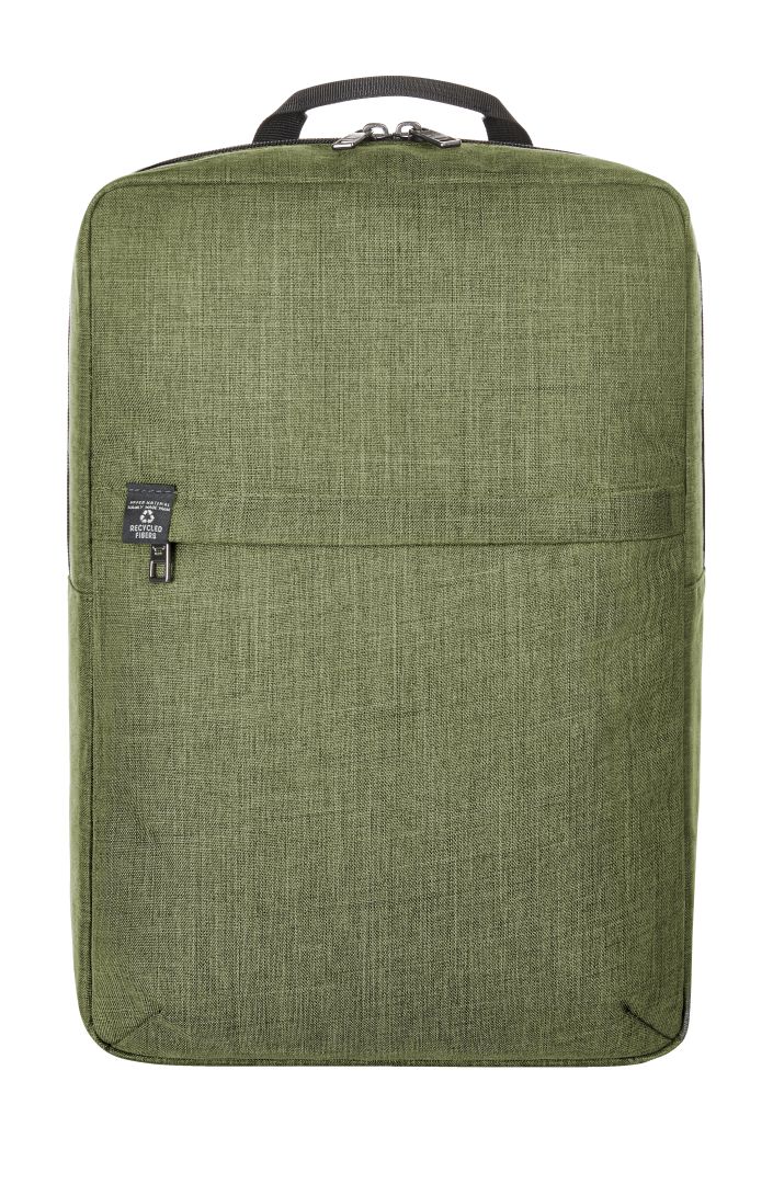 streamlined backpack: rPET outer material; large main compartment with 2-way zip and padded notebook compartment; front pocket with zip; elaborately padded back with hidden zip compartment; length-adjustable padded shoulder straps with rubber loops to attach items such as sunglasses; handle