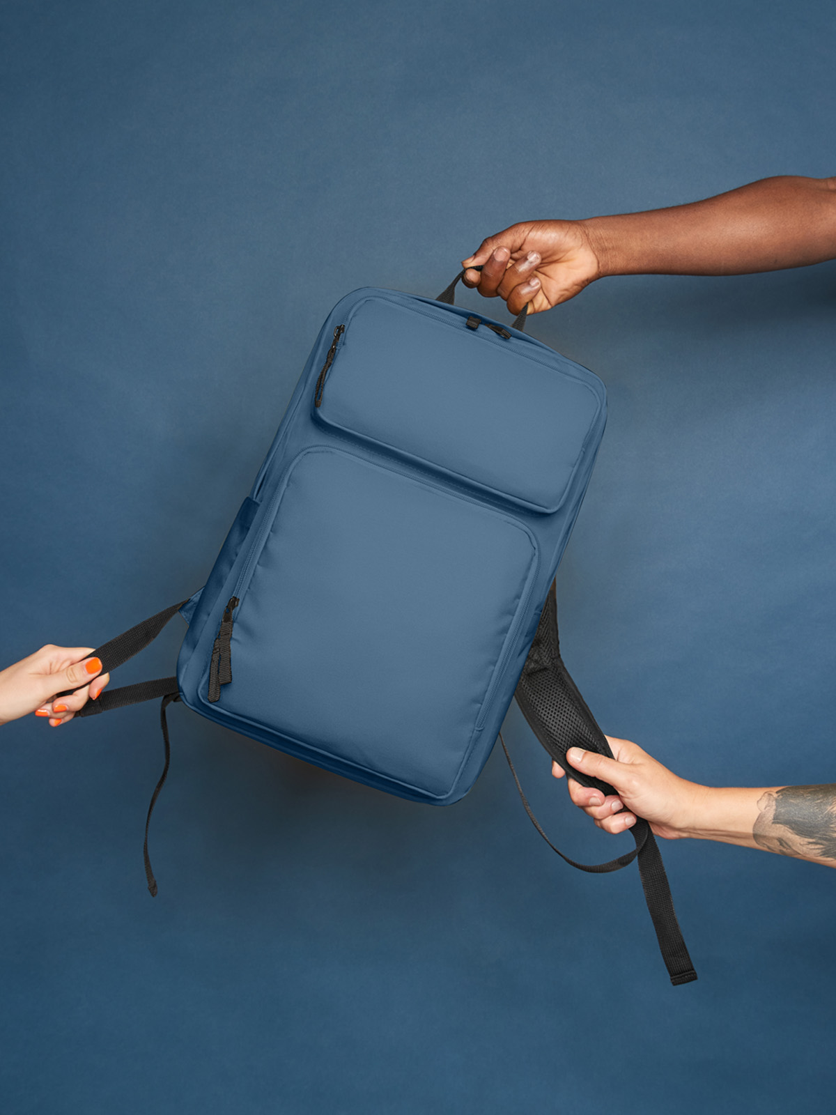 Streamlined shape. Young colours. Beautiful functions. Recycled material. The FELLOW notebook backpack is perfect for university, office, leisure and for anyone who is on the move in an urban and fashionable way. The two patch front pockets are an eye-catcher, providing a geometric cargo style. In addition to the fine aesthetics, it offers hard-hitting function with a padded back, adjustable chest and shoulder straps, flat side pockets and 15-inch notebook compartment. The polyester fabric of the outer fabric is made from recycled PET bottles and is as robust and elegant as you could wish for in your everyday life.