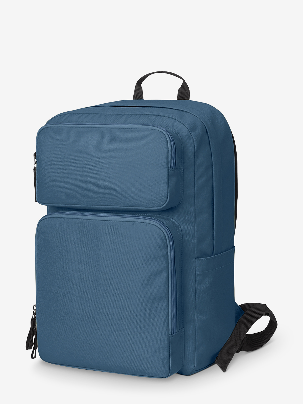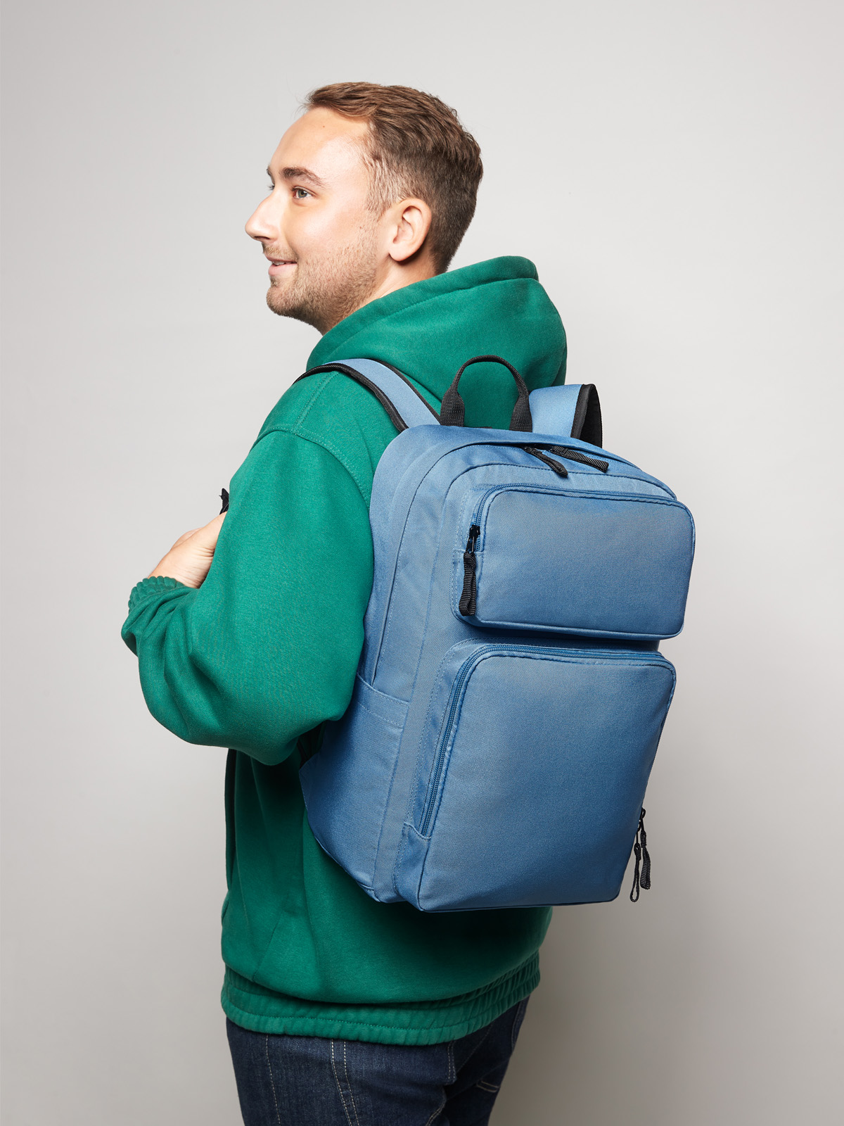 Spacious main compartment with 2-way zip: padded notebook compartment; 2 zipped front pockets; two side slip-in pockets; back and shoulder straps padded with height-adjustable chest belt; handle