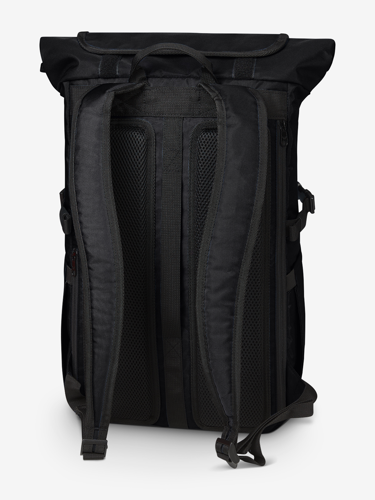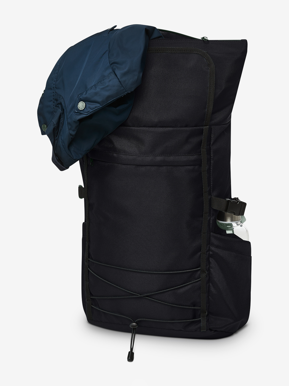 Versatile backpack with innovative volume expansion; rPET upper material; spacious main compartment with zip; flat slip-in pocket inside; large zipped front pocket; functional loop strap with elasticated cord; two side slip-in pockets for drink bottles, for example; fixing straps; separately accessible notebook compartment with velour lining on the back; padded carrying system; concealed zipped pocket on the back; padded base; handles on the back also for use as a fastening loop for trolley bares; carrying handle