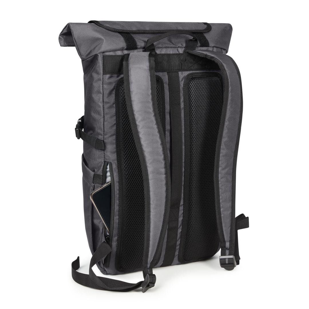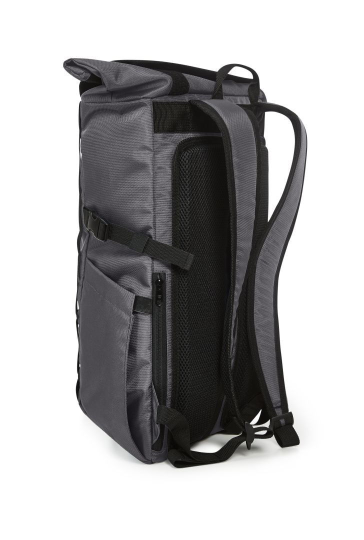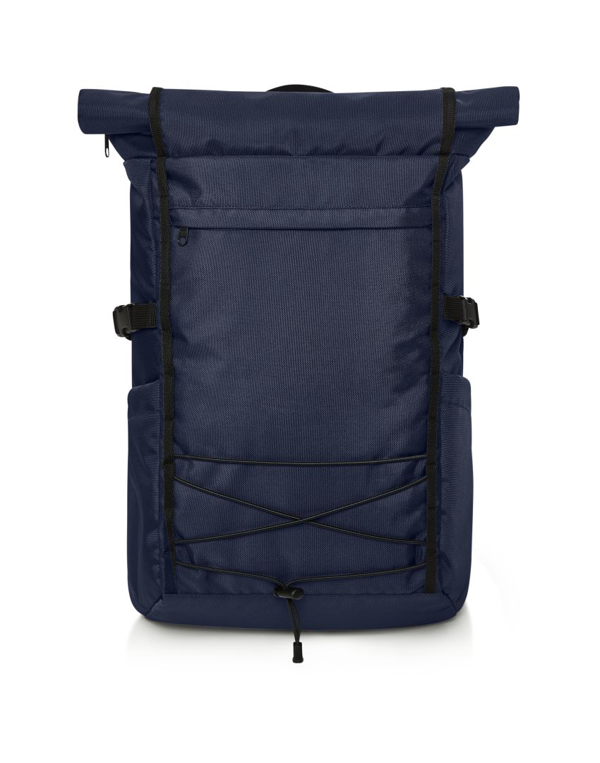 Versatile backpack with innovative volume expansion; rPET upper material; spacious main compartment with zip; flat slip-in pocket inside; large zipped front pocket; functional loop strap with elasticated cord; two side slip-in pockets for drink bottles, for example; fixing straps; separately accessible notebook compartment with velour lining on the back; padded carrying system; concealed zipped pocket on the back; padded base; handles on the back also for use as a fastening loop for trolley bares; carrying handle