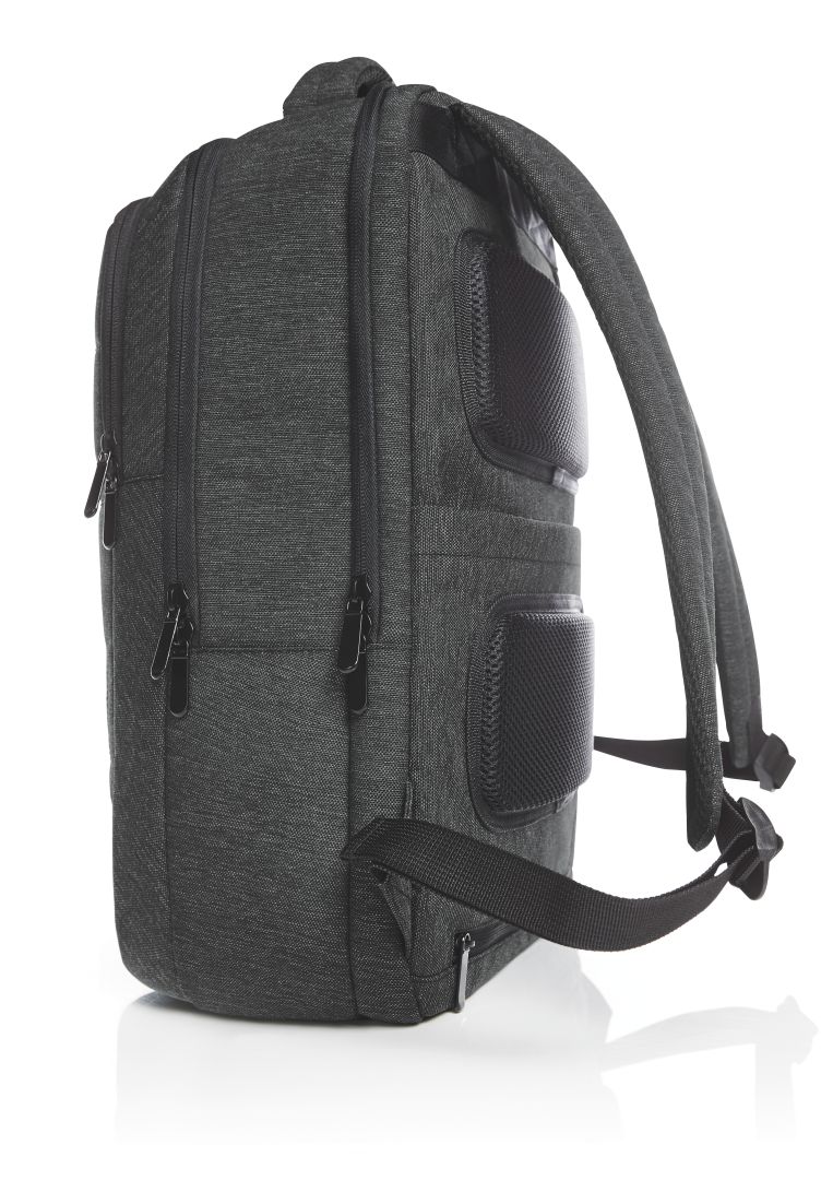 padded business backpack with elaborately-stitched front and HFL® carrier for your logo; padded main compartment with flat insert compartment suitable for A4 documents; zip front pocket, with two flat insert pockets; padded zip notebook compartment; padded back with hidden zip compartment, also suitable for attachment to trolley rods; adjustable padded shoulder straps; padded handle