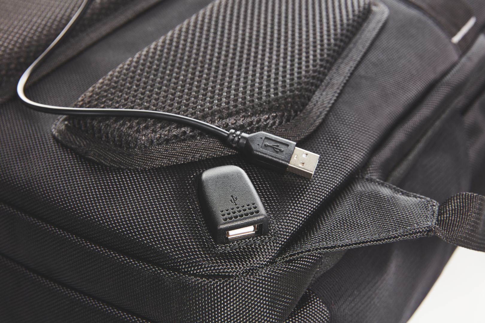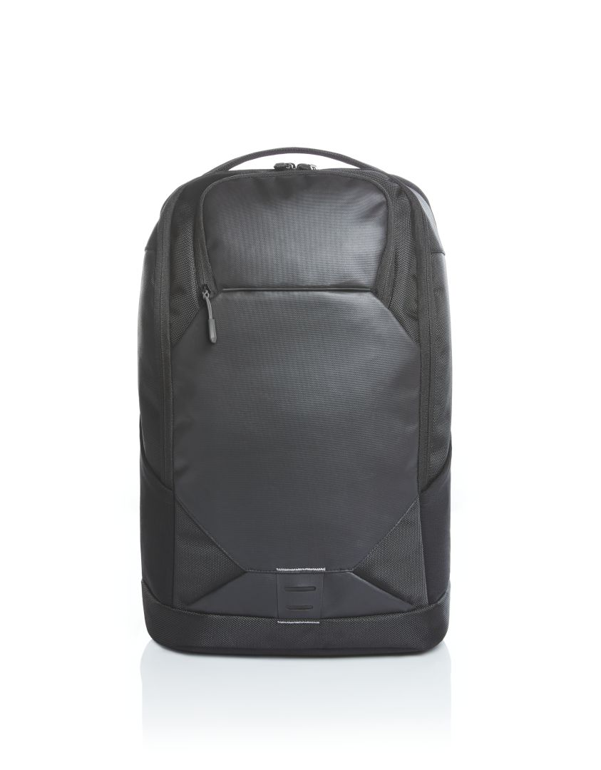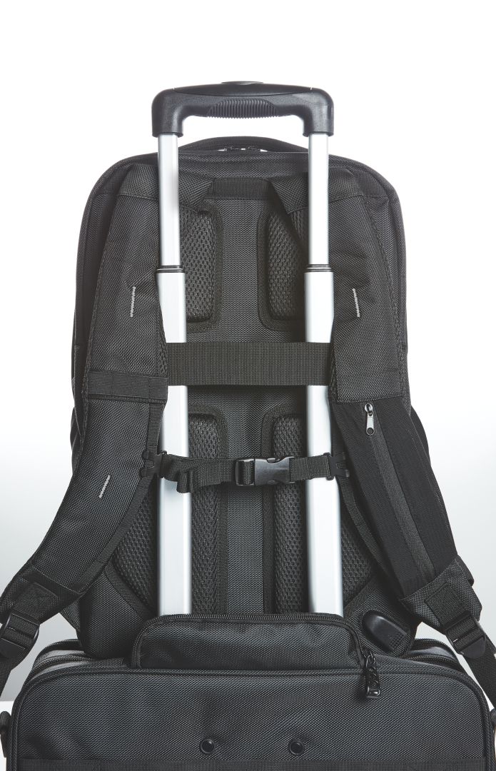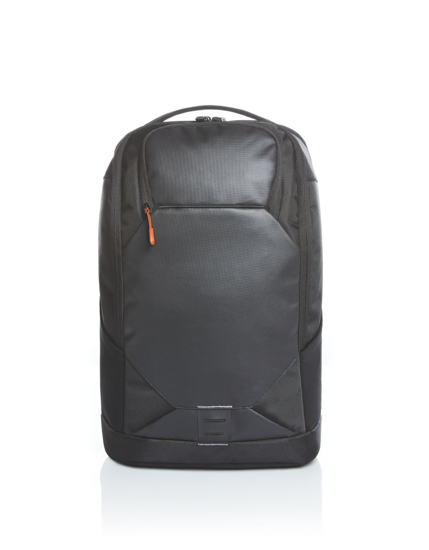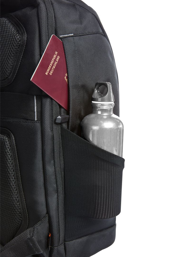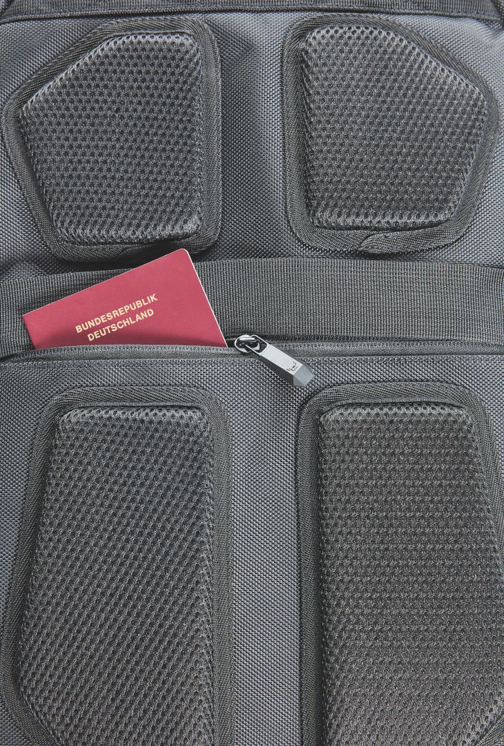elaborately-crafted business backpack, with reflective trim and LED bicycle light fastening option; large main compartment with 2-way zipper, notebook compartment for 15"" notebooks, padded zipped inner pocket and flat zipped pocket; large 2-way zipped compartment with velour lining, suitable for 17"" notebook; zipper pocket on the front; two elastic mesh pockets on the side, two hidden zipper pockets; rear fastening loop for trolley poles, hidden zipper pocket, USB port with integrated connecting cable; padded carrying system with removable, length-adjustable and elastic chest strap, elastic loops, e.g. for spectacle earpiece and elastic zipper mesh pocket; padded handle; zipper puller (on front) available in colours shown