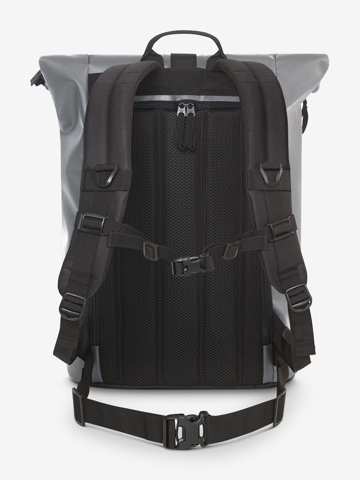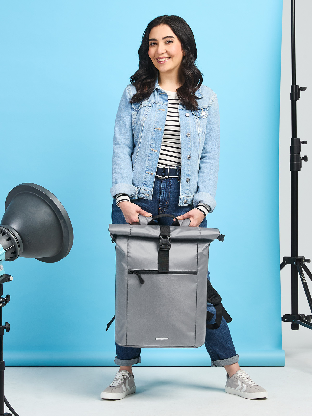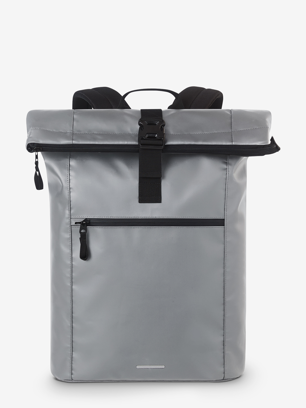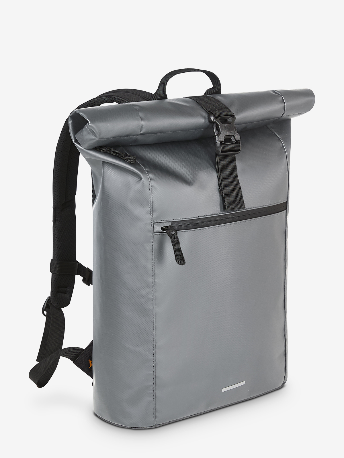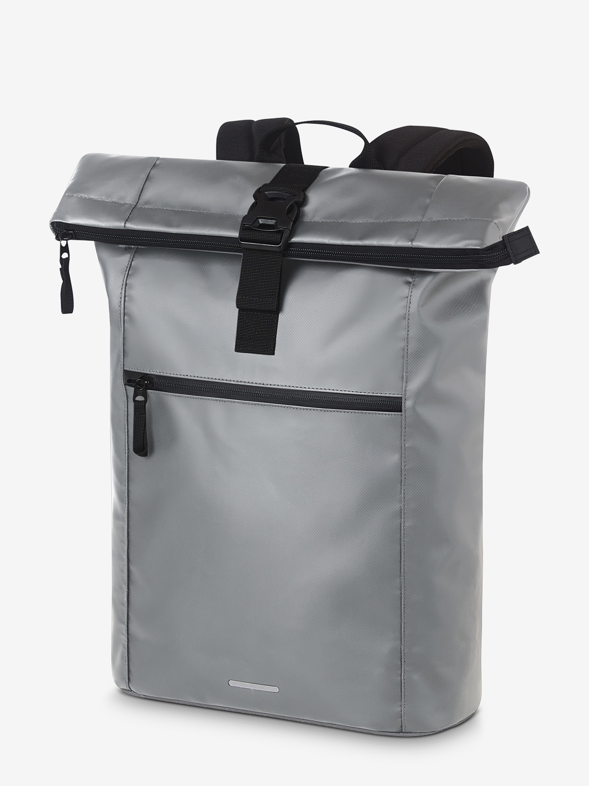 large courier-style backpack; main compartment with zipper and additional buckle; large front pocket with zipper; decorative reflective print on the front; flat pocket inside; airtag compartment; notebook compartment, also accessible from the back; reinforced base; padded carrying system with height adjustable chest strap; waist strap; handle