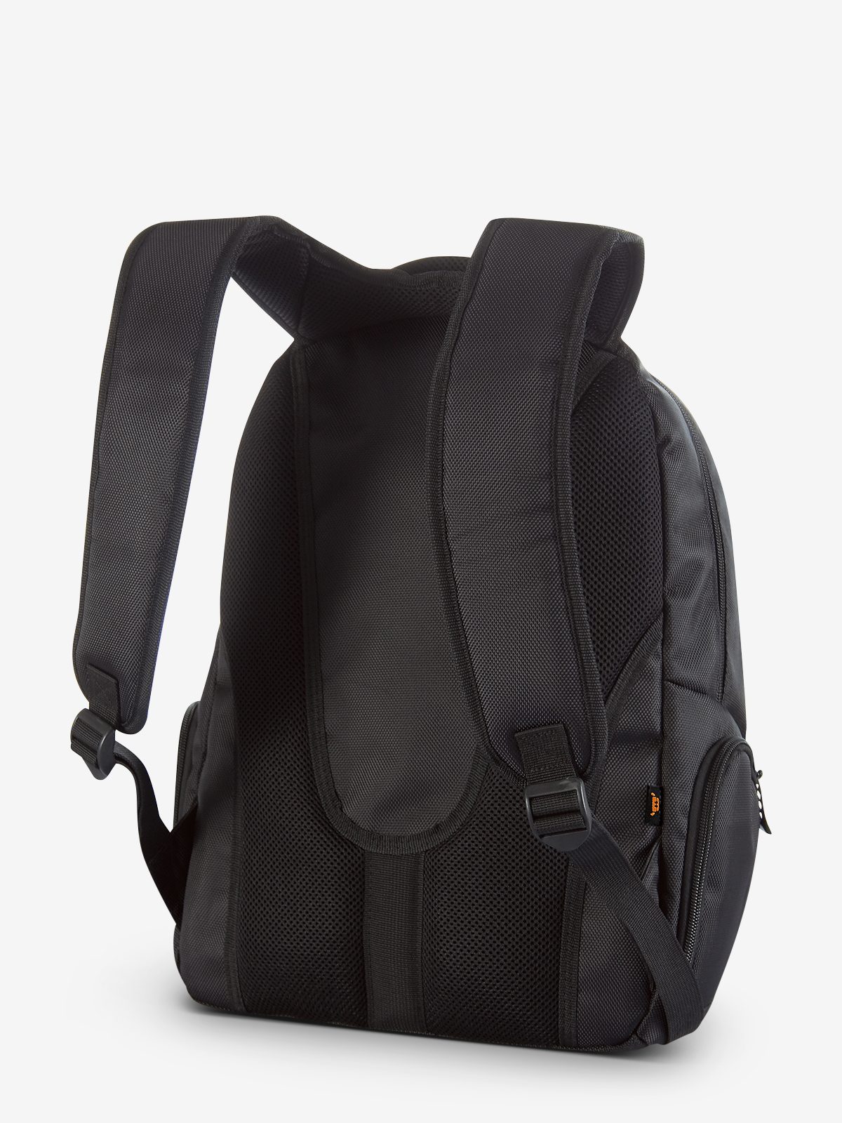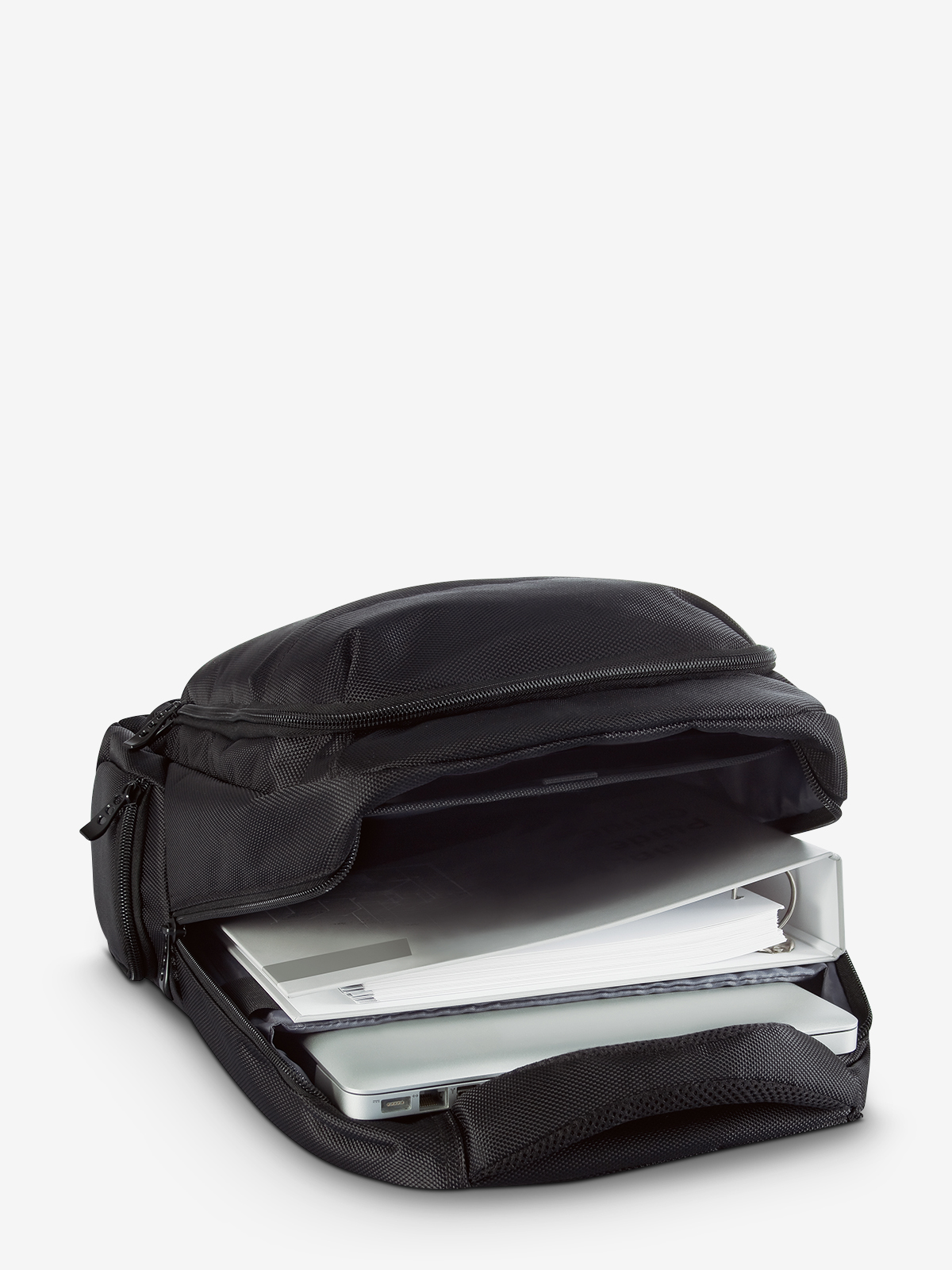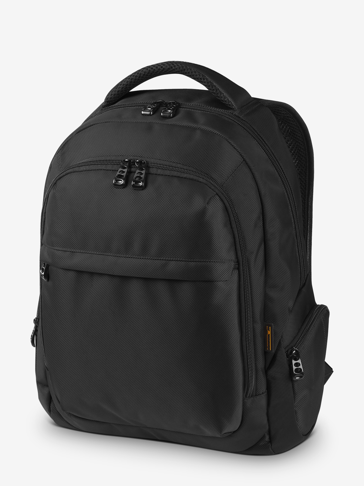 versatile notebook backpack; main compartment with padded laptop compartment and inside open pocket; large padded zippered front pocket with various sewn in pouches, key ring and mobile phone pocket; zipper front pocket; zipper side pockets; padded back and shoulder straps; padded handle