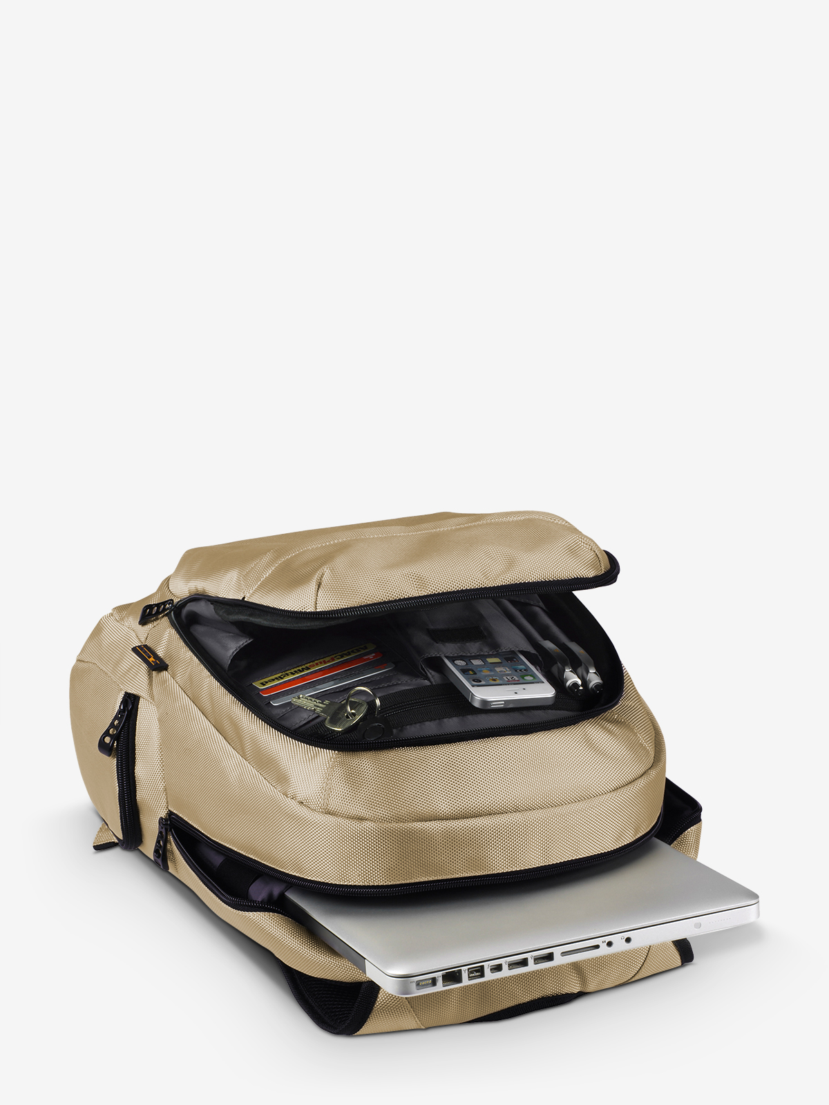 versatile notebook backpack; main compartment with padded laptop compartment and inside open pocket; large padded zippered front pocket with various sewn in pouches, key ring and mobile phone pocket; zipper front pocket; zipper side pockets; padded back and shoulder straps; padded handle