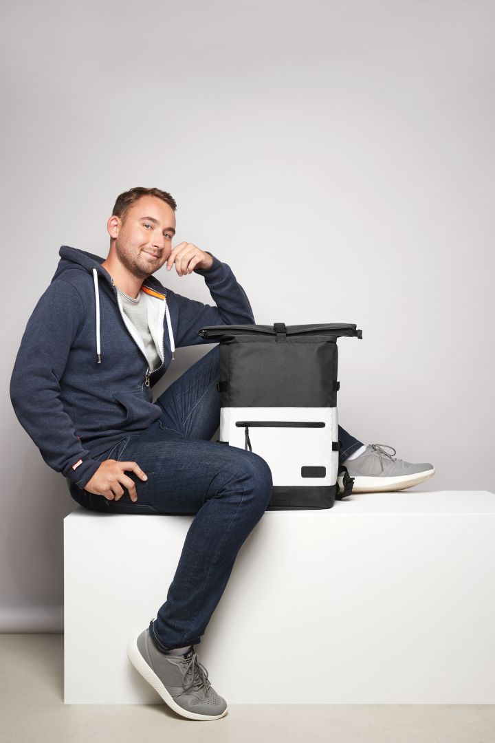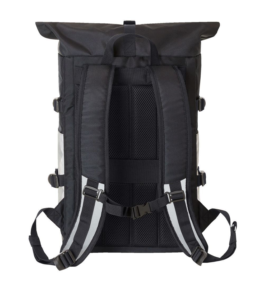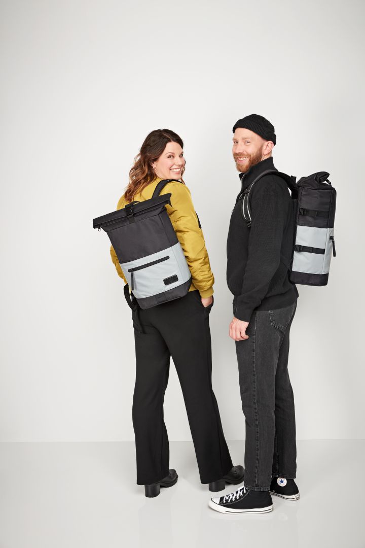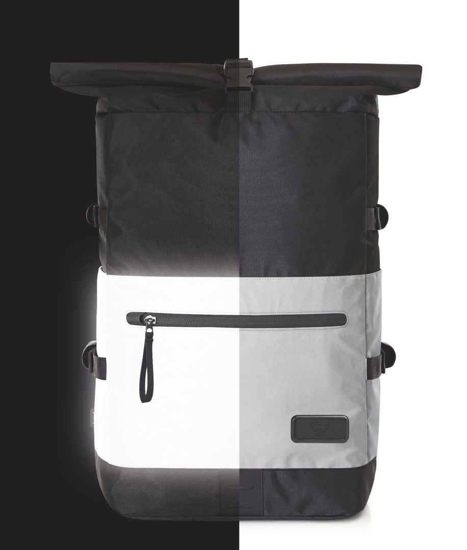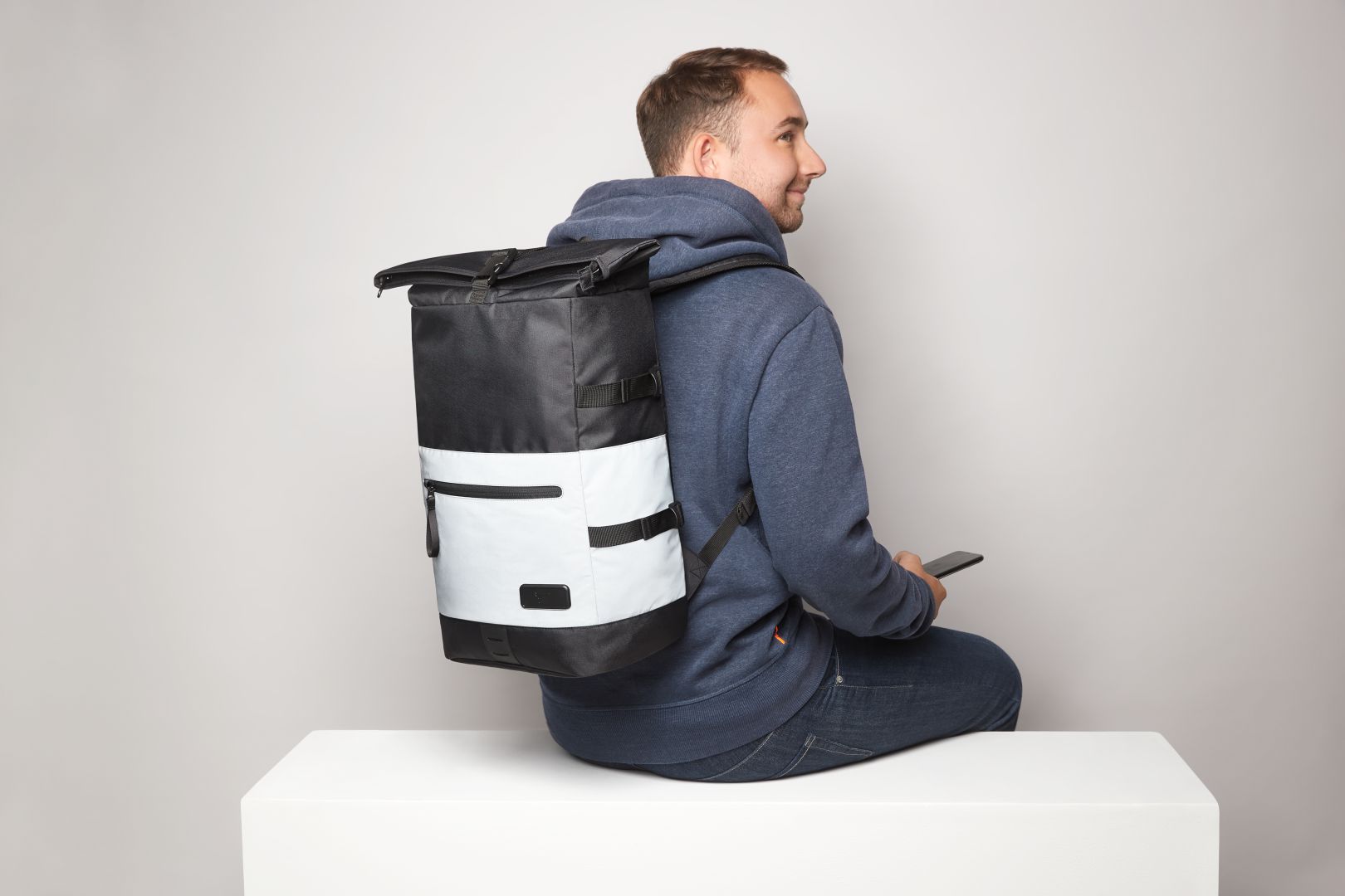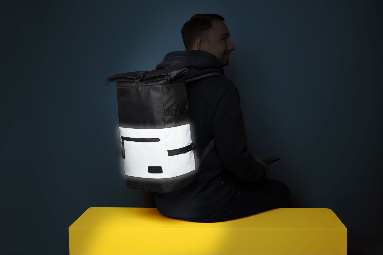 Stylish, reflective roll-top backpack with zipped main compartment and buckle; HFL® straps for your logo; padded slip-in pocket and zipped mesh pocket inside; two side slip-in pockets; fixing straps; zipped front pocket; LED bicycle light attachment option; rear attachment loop for trolley handle; concealed zipped pocket; padded carrying system with height-adjustable chest strap; handle