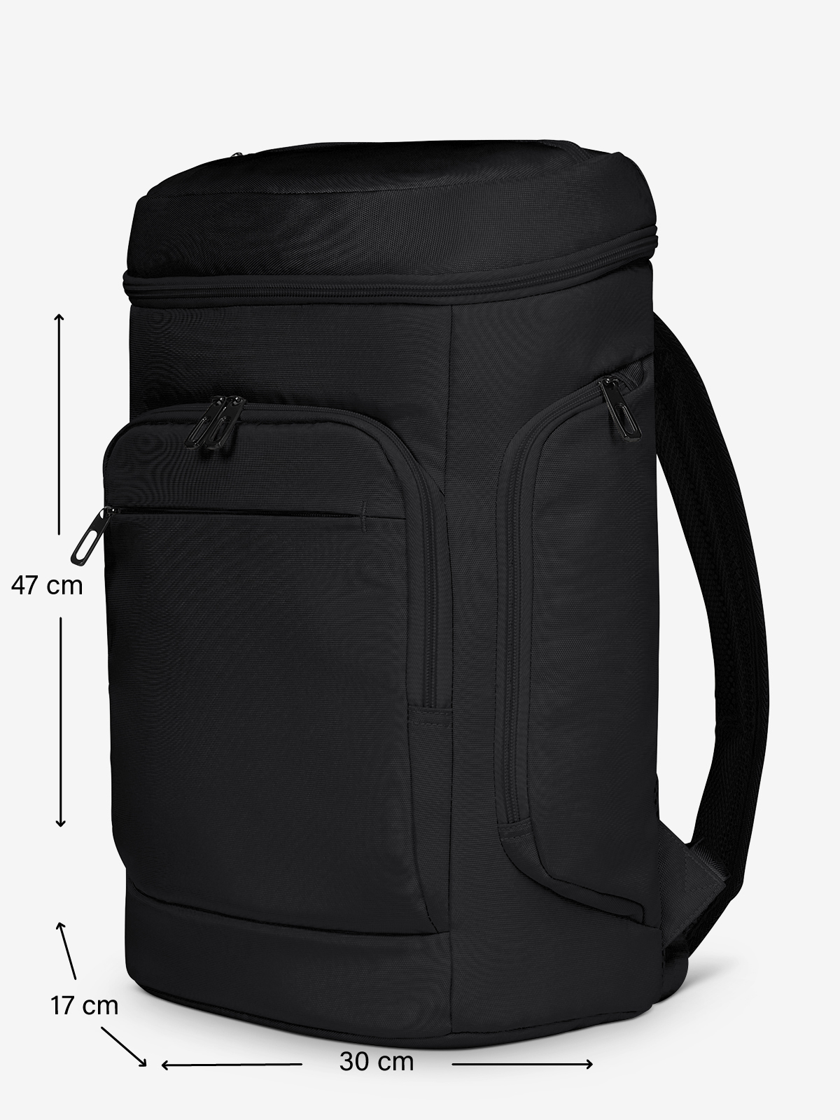 high-quality, modern notebook backpack with recycled outer fabric; fully padded main compartment with three-sided 2-way zipper for convenient packing; bright inner lining for optimal visibility; large padded front pocket with 2-way zipper and insulating function, ideal e.g. for a lunchbox; additional flat zipper pouch; flat zipper pocket on the lid; two zipper side pockets; inside: padded notebook compartment with fastening strap, concealed AirTag pouch, zipper mesh pocket; ergonomically padded carrying system with adjustable chest strap; strap for fastening to trolley bar; handle