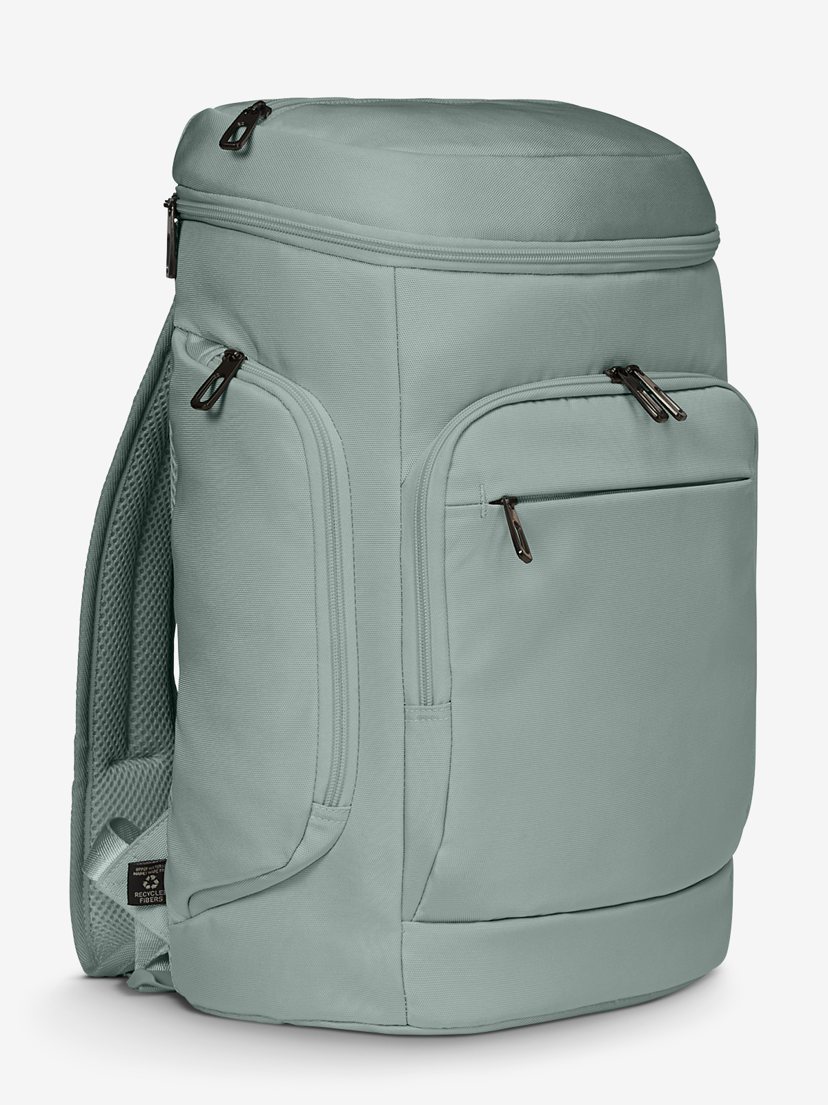 high-quality, modern notebook backpack with recycled outer fabric; fully padded main compartment with three-sided 2-way zipper for convenient packing; bright inner lining for optimal visibility; large padded front pocket with 2-way zipper and insulating function, ideal e.g. for a lunchbox; additional flat zipper pouch; flat zipper pocket on the lid; two zipper side pockets; inside: padded notebook compartment with fastening strap, concealed AirTag pouch, zipper mesh pocket; ergonomically padded carrying system with adjustable chest strap; strap for fastening to trolley bar; handle