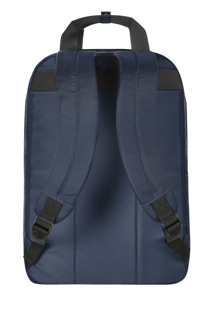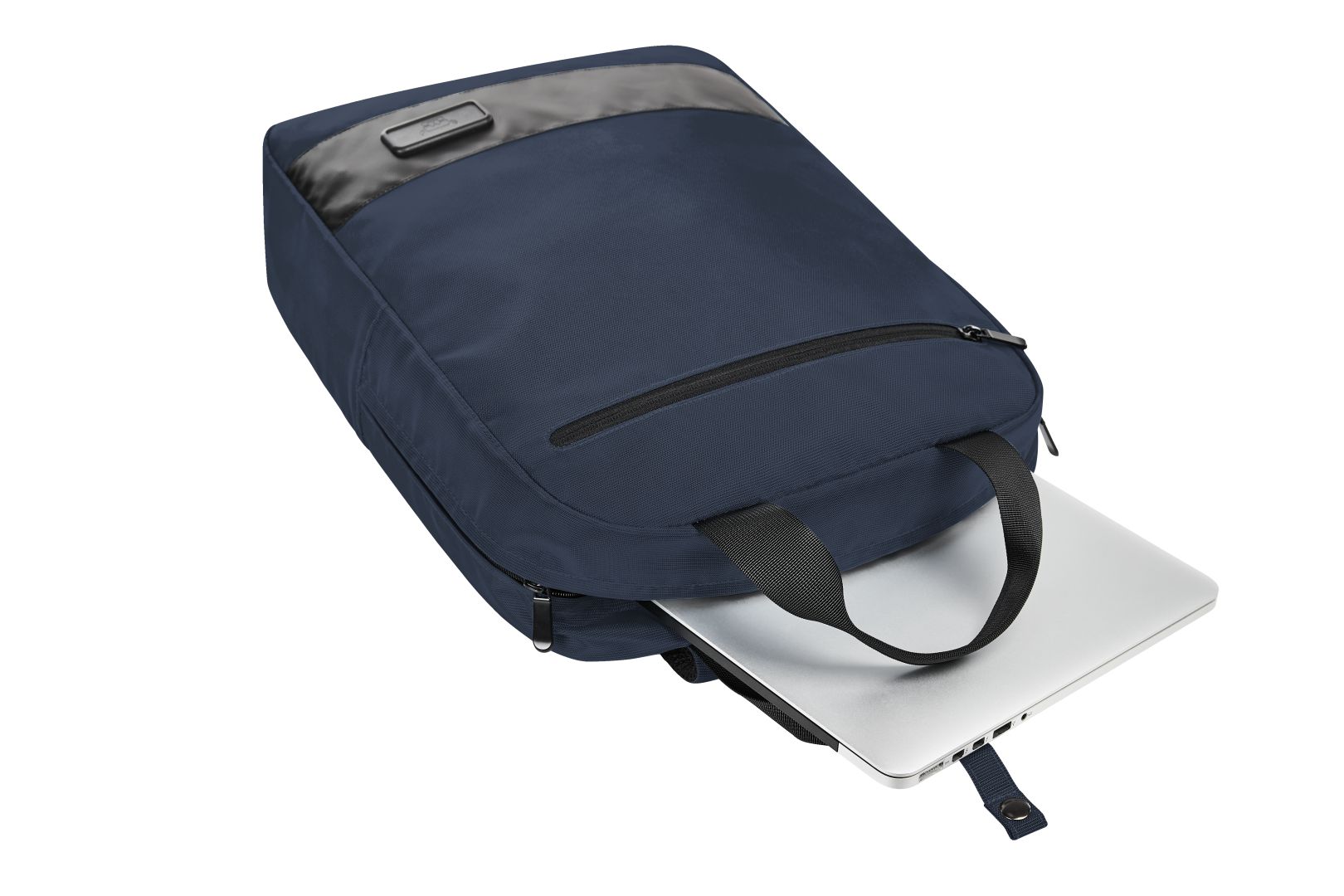modern backpack with contrasting stripes; HFL® carrier for your logo; large main compartment with 2-way zip; padded notebook compartment; pockets; pen loops; large front pocket with zip, padded back and shoulder straps; handles with press stud cuff