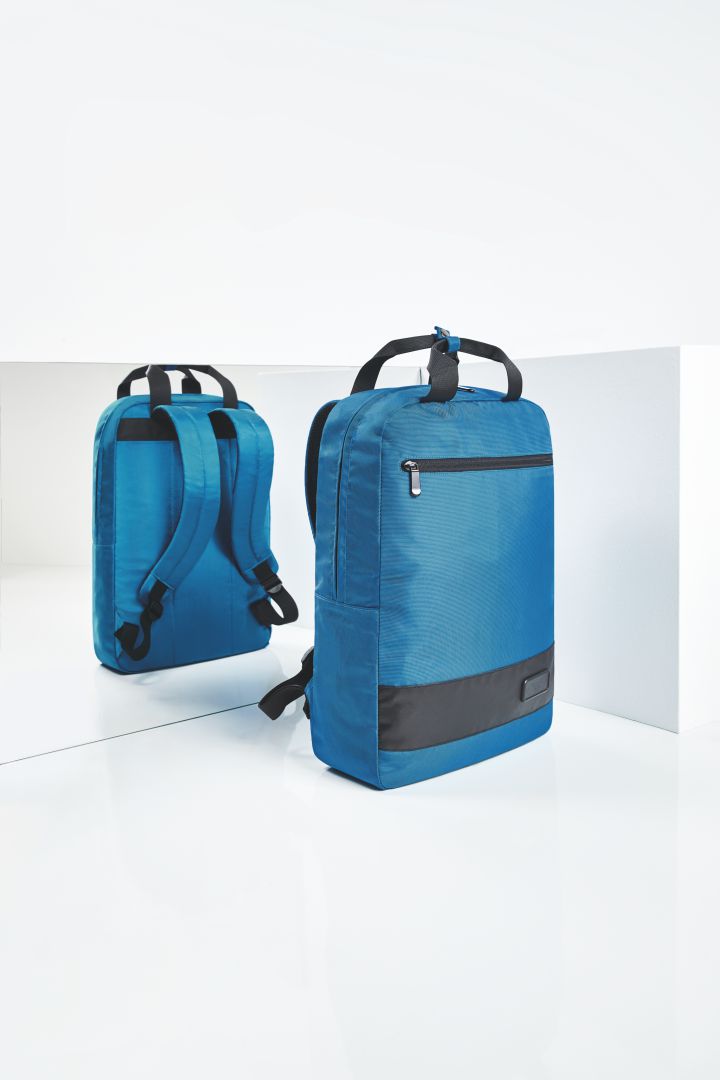 modern backpack with contrasting stripes; HFL® carrier for your logo; large main compartment with 2-way zip; padded notebook compartment; pockets; pen loops; large front pocket with zip, padded back and shoulder straps; handles with press stud cuff