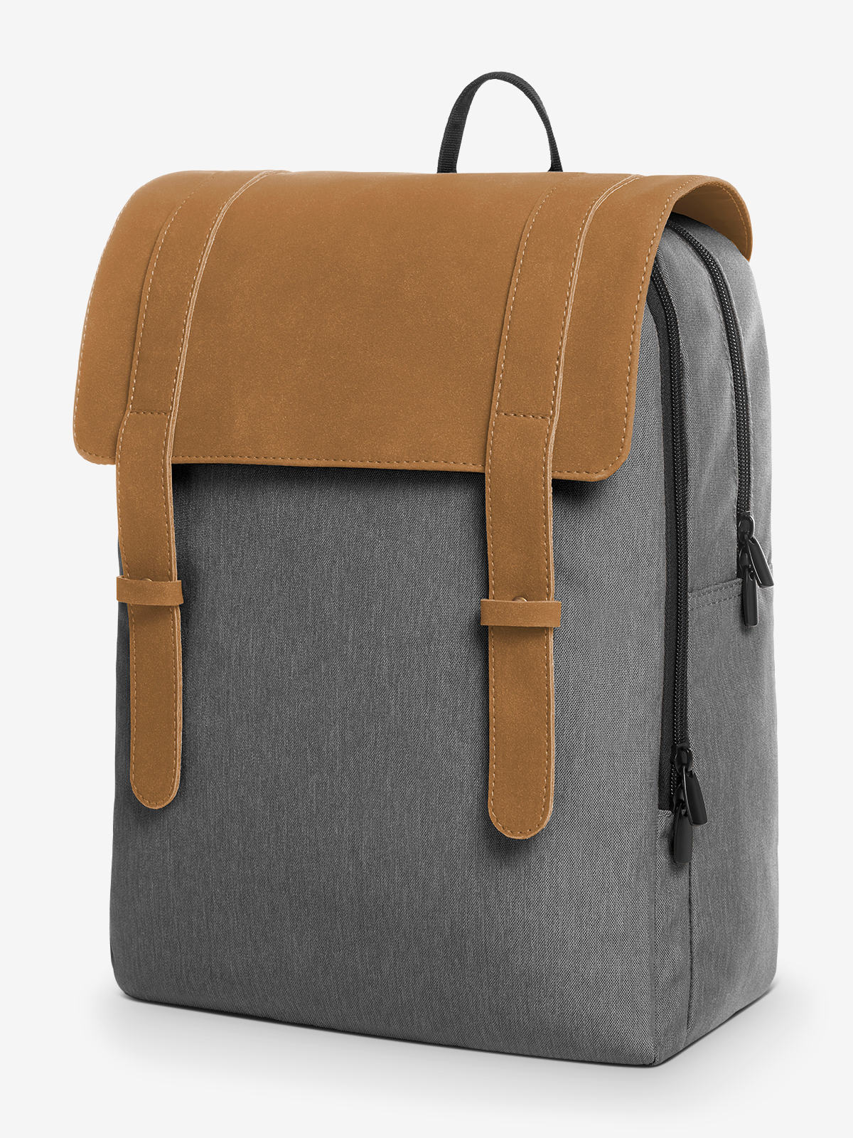 young notebook backpack with trendy, geometric cut; combination of melange fabric and artificial velour leather; main compartment with padded notebook compartment; zipper front pouch with two flat insert pockets; two-way zippers; padded back and shoulder straps
