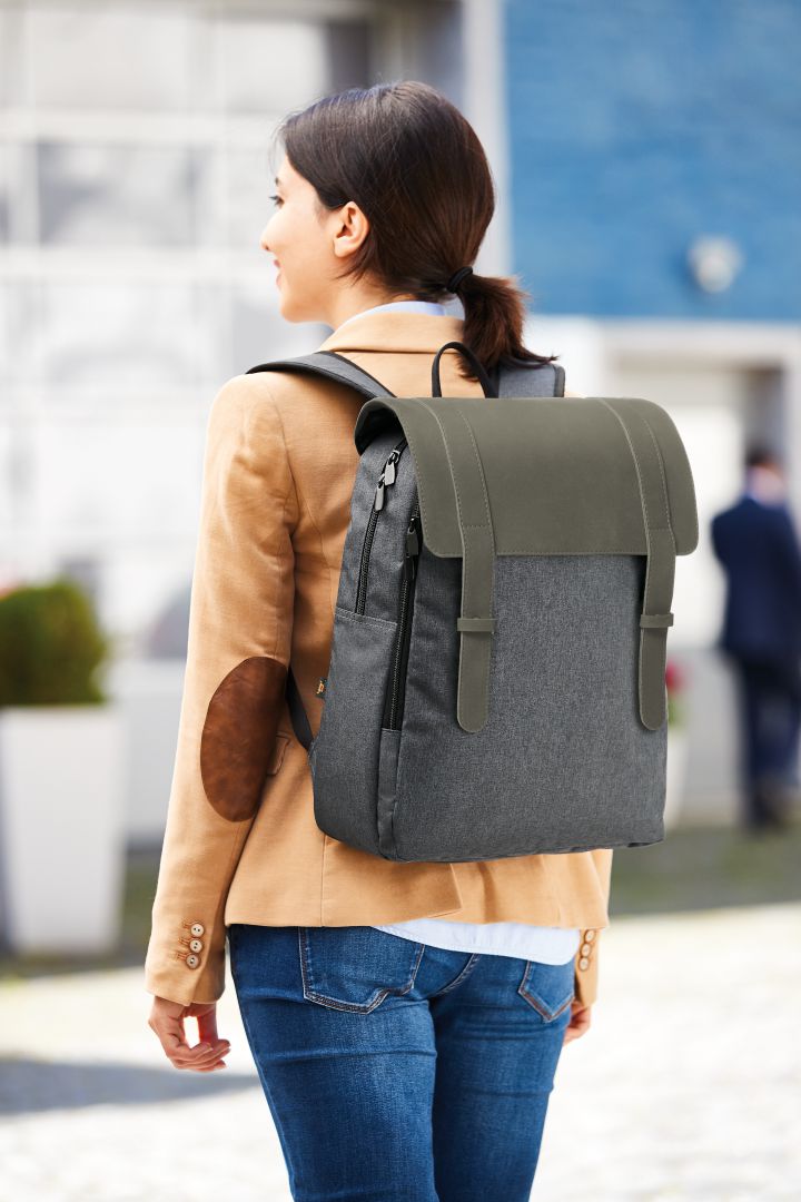 This newcomer will surely become the secret focus of the next 9 o'clock meeting: The URBAN notebook backpack in the aforementioned vintage look and exquisite material mix. Smooth PU synthetic leather, tone-in-tone with an extraordinary melange material. This superior mixture goes with the streamlined, geometric cut of the backpack. But the URBAN is not rigid. On the contrary: It makes daily life comfortable for its wearer. Thanks to its spaciousness, you have never to do without laptop, stapler, diary and breakfast snack when on the move. And it does not just envelop the notebook softly and securely, but also gives the back and shoulders a treat with comfortable padding. Comfort is always hip after all.